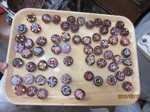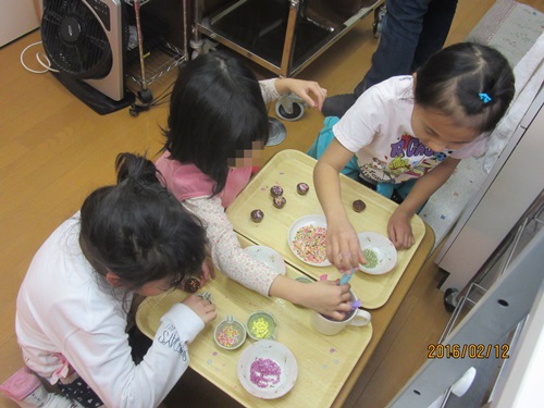 バレンタイン チョコを溶かして、シリアルを砕いて混ぜて、クランチチョコ!その表面に女子1人1人がデコレーションをしました!色とりどりのチョコが出来上がり、今日のおやつに出しました♪最初は気乗りしなかった子も、デコレーションの材料を見て、目が輝き、「あと1個やってもいい?」とノリノリ★可愛いものを見るとテンションが上がるところがやっぱり女の子ですね〜ヽ(≧▽≦)ノ さぁ、男子よ、おかえしのホワイトデーは何を作ろうか…(-ω-;)女子達は結構期待しているぞ…(゜◇゜;)