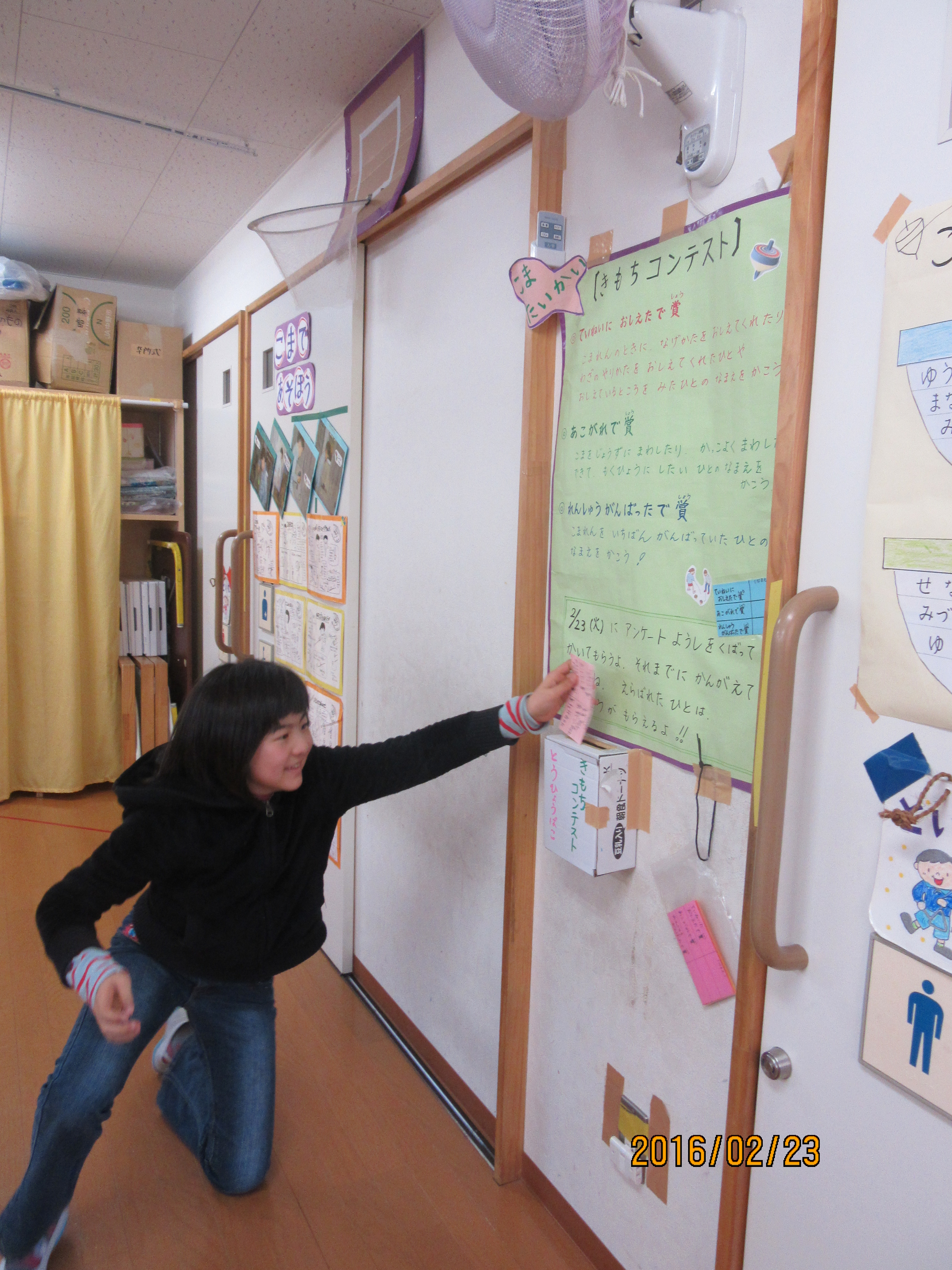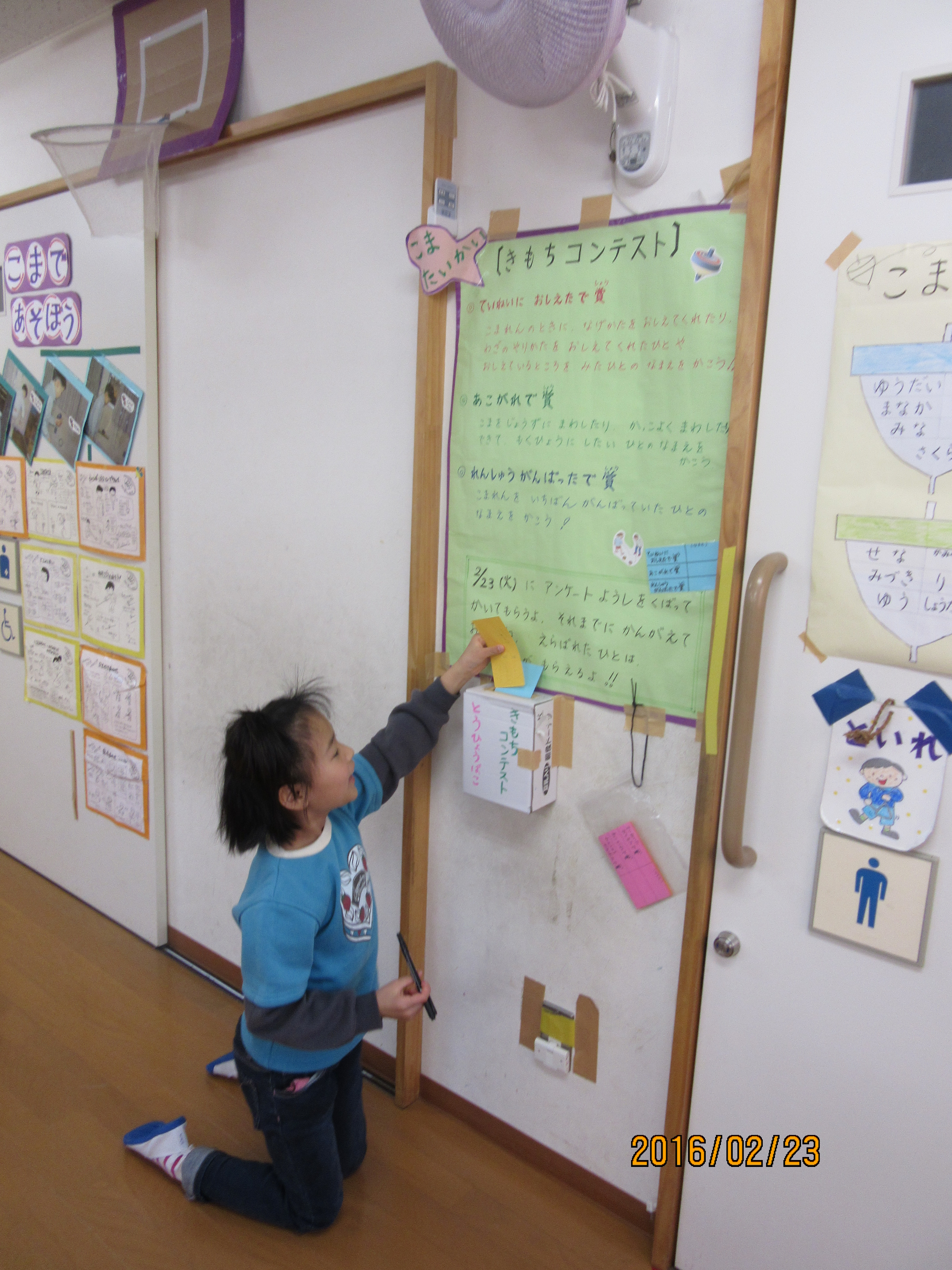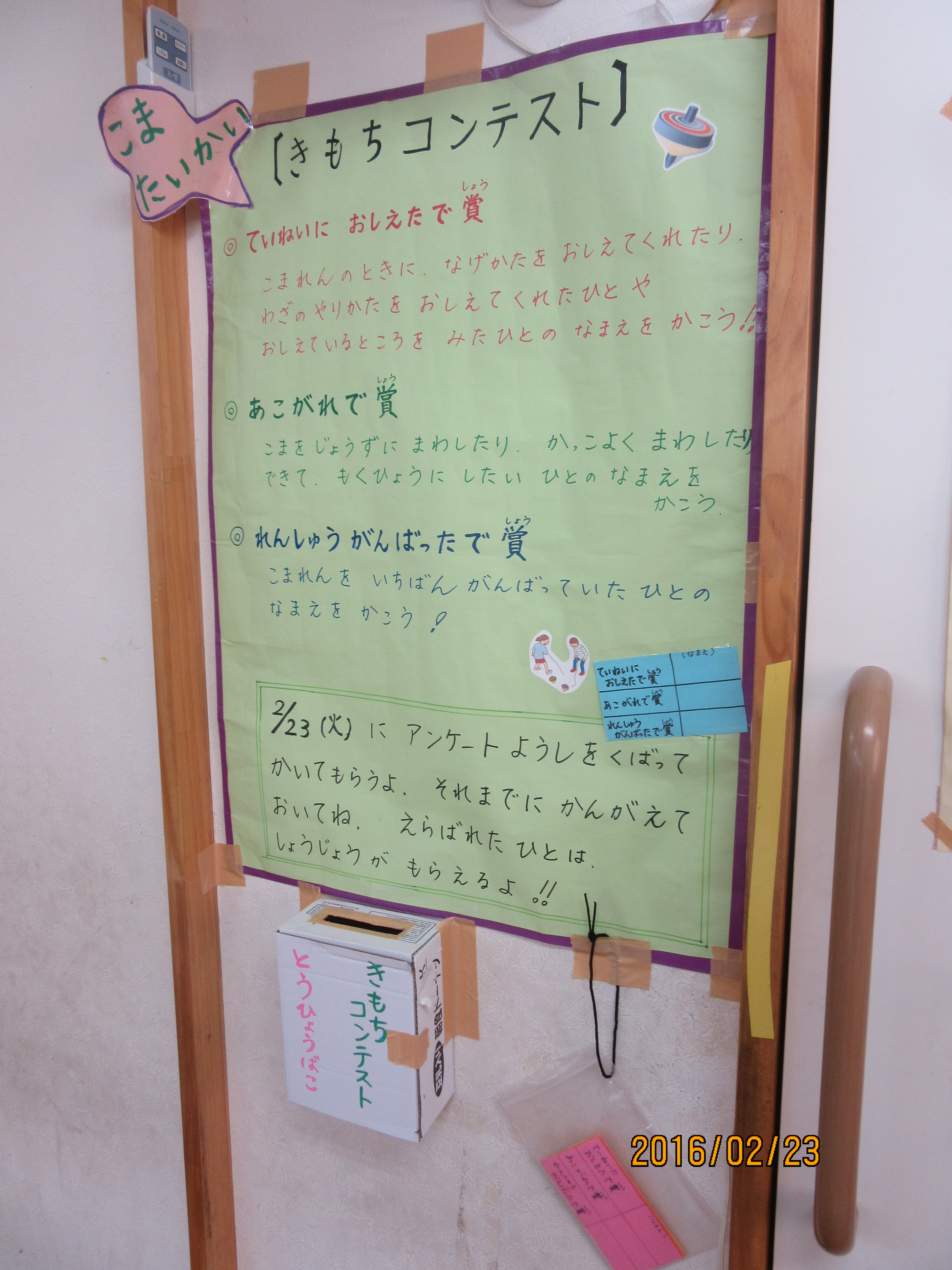 投票日!!! 投票箱を設置しました! こま大会で、気持ちコンテストを行います♪練習期間中、「練習を頑張っていた人」「優しく教えてくれた人」「あこがれる人」を子ども達が子ども達の様子を見て選び、投票箱に前日までに投票するというシステムです★誰に見られるわけでもないのに、照れながら投票をする子達(笑)友達の良いところを認めるというのはなんだか照れくさいんでしょうか(*゜ー゜)「見ないで〜!!!」と忍者のように投票箱に近づいて投票する子もいたり…投票するだけでも楽しめちゃう子ども達なのでした〜ヽ(≧▽≦)ノ 誰に入れたのかな〜?♪ 投票している姿さえ照れる子