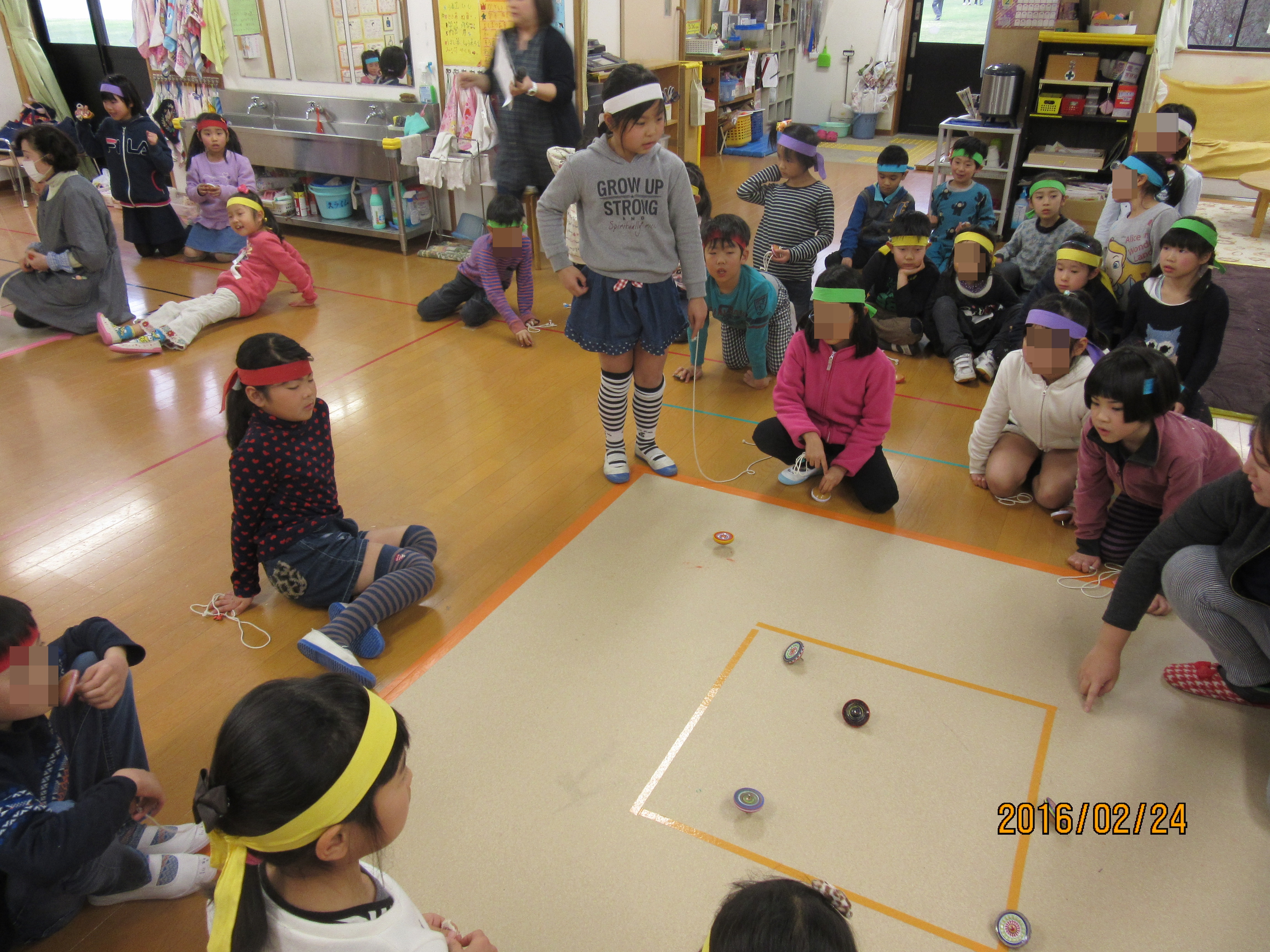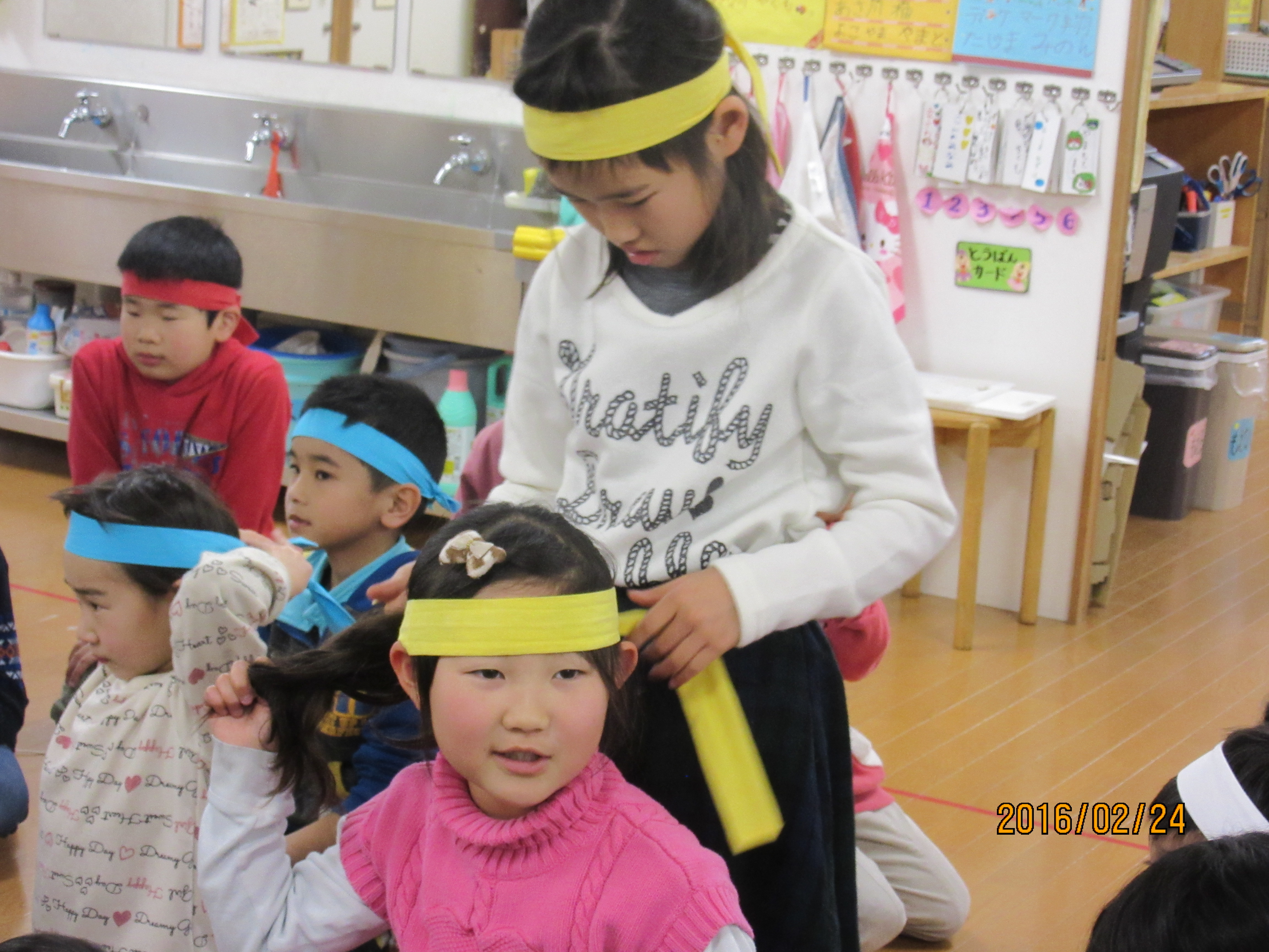 グループごとに決められた色のハチマキをしっかり巻いて、大会の説明を真剣な顔で聞きます!巻けない子には、同じグループの友達が手助けしてハチマキをまいてあげます。どのグループも助け合うチーム力は抜群♪力を合わせあう大会でもあるので、どのグループも期待が高まります!