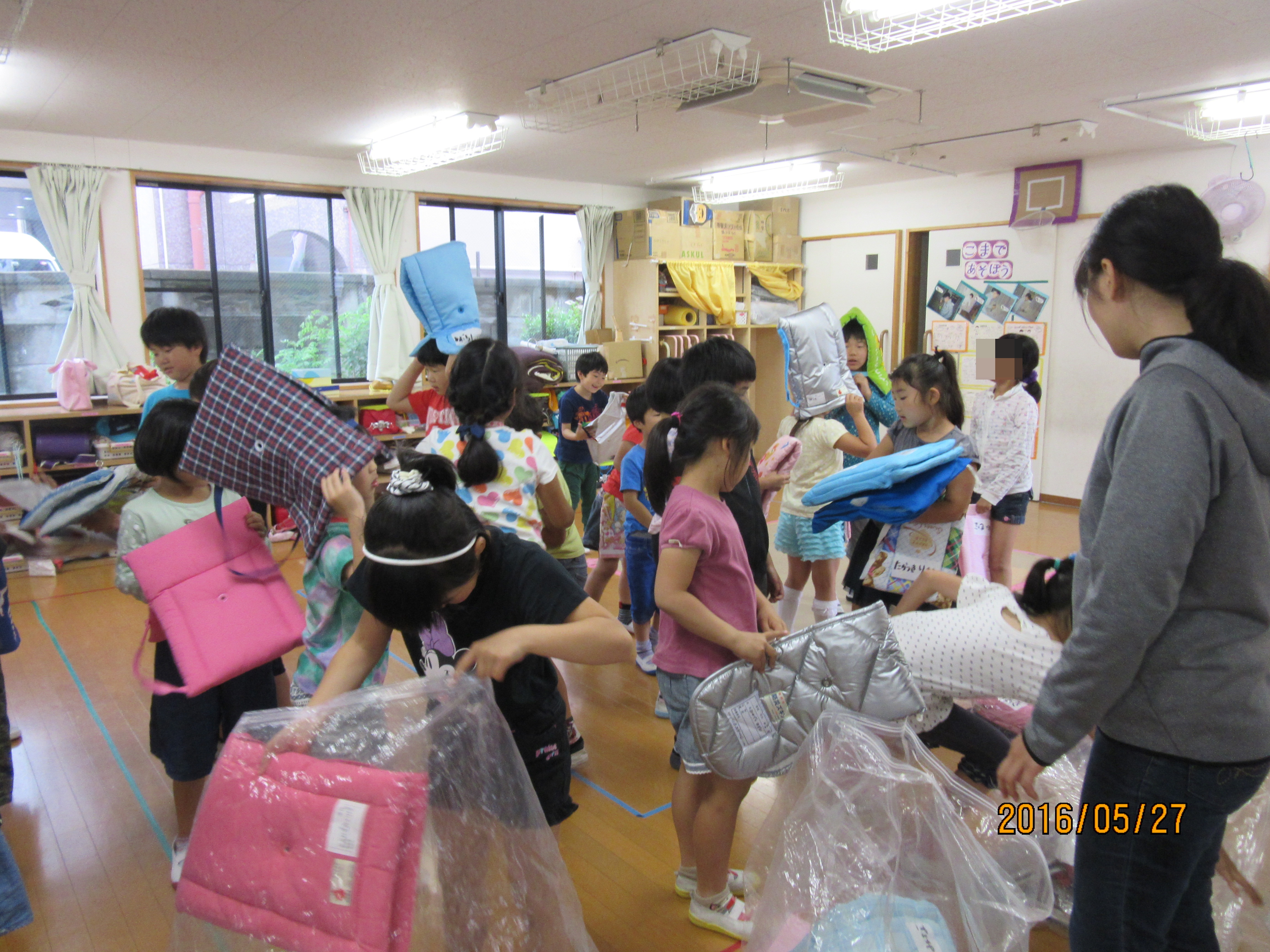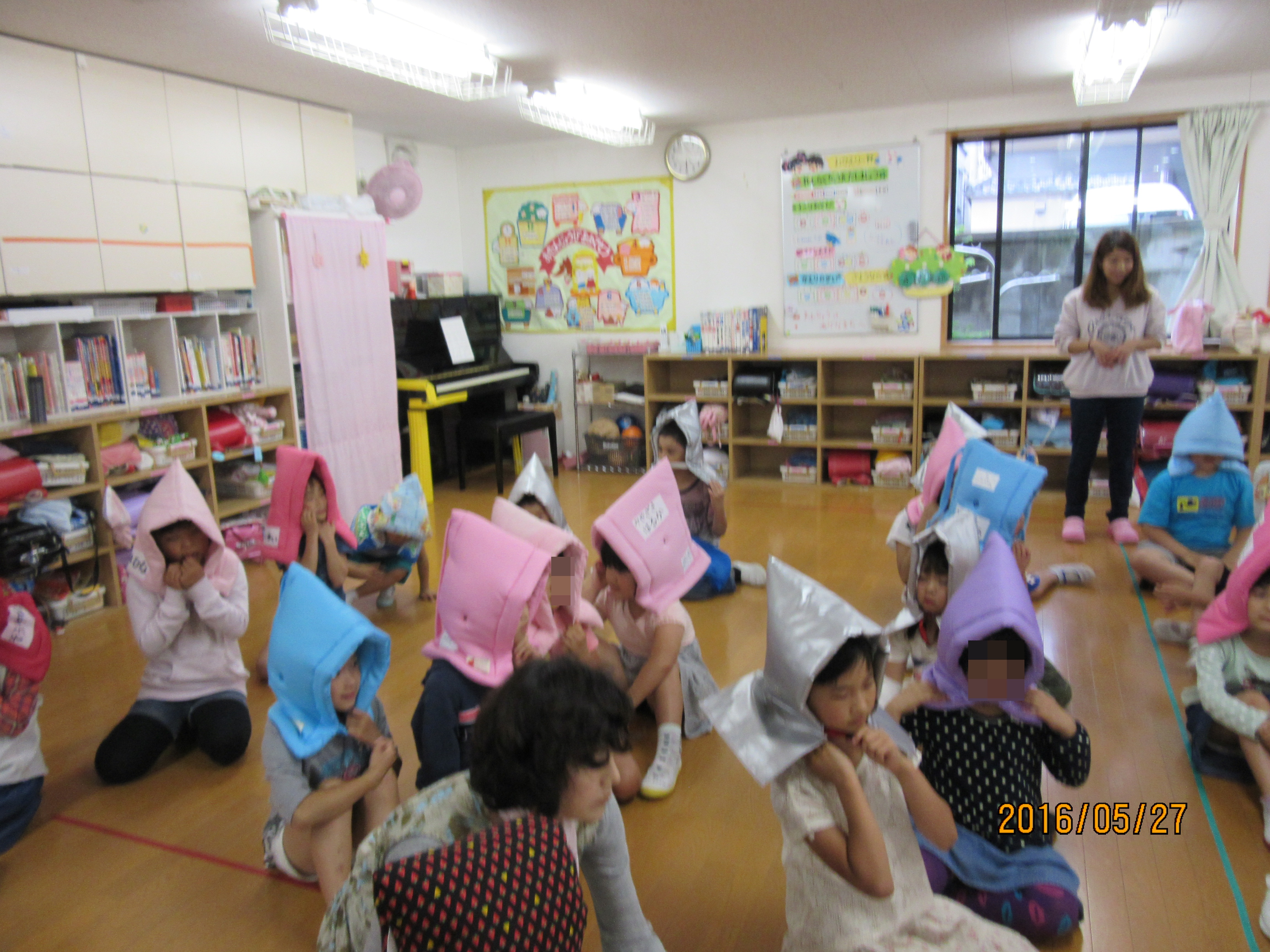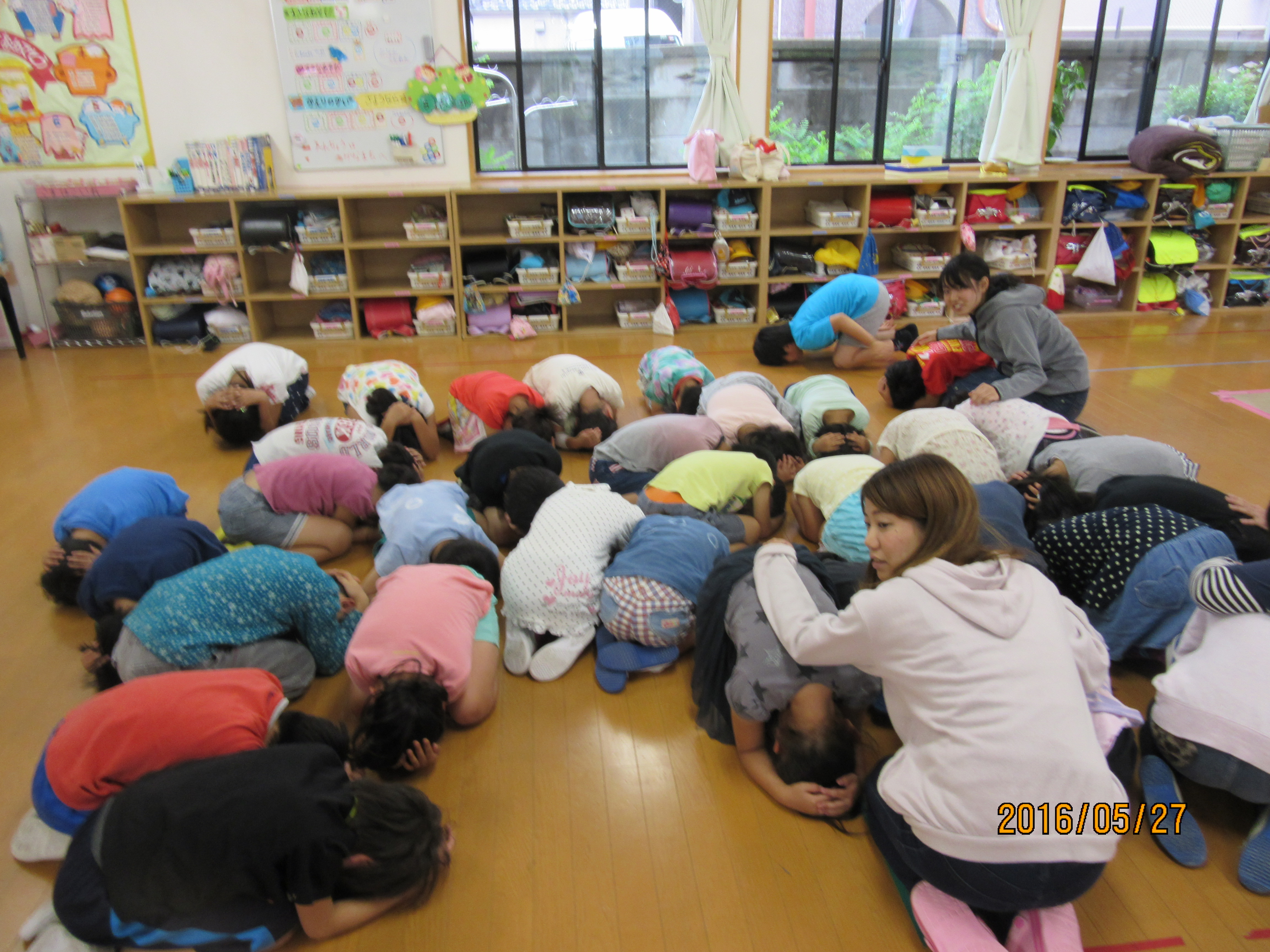 中で遊んでいる時間帯は、ホール真ん中に集まり、頭を守る「だんご虫」の体勢で揺れがおさまるのを待ちます。