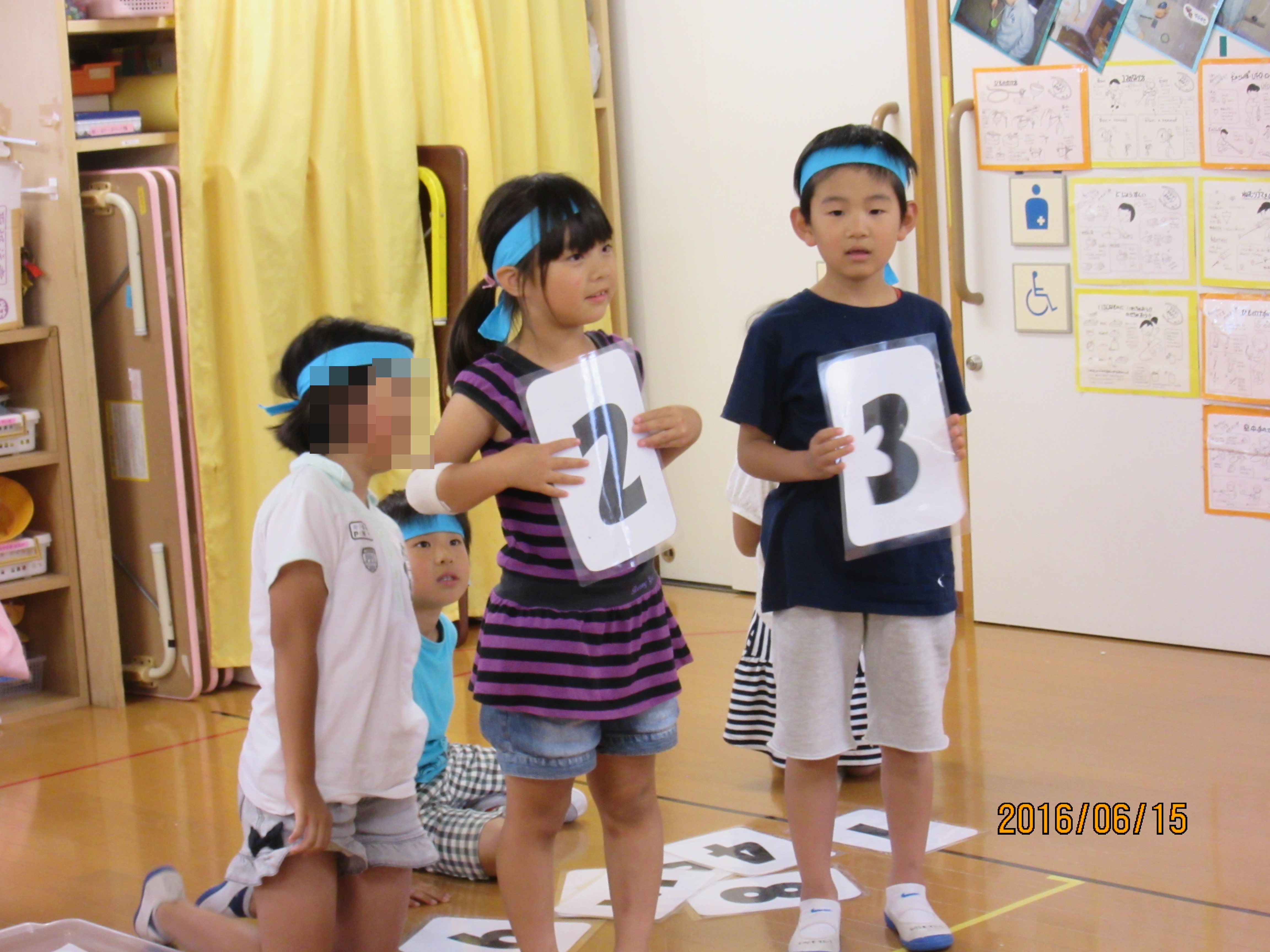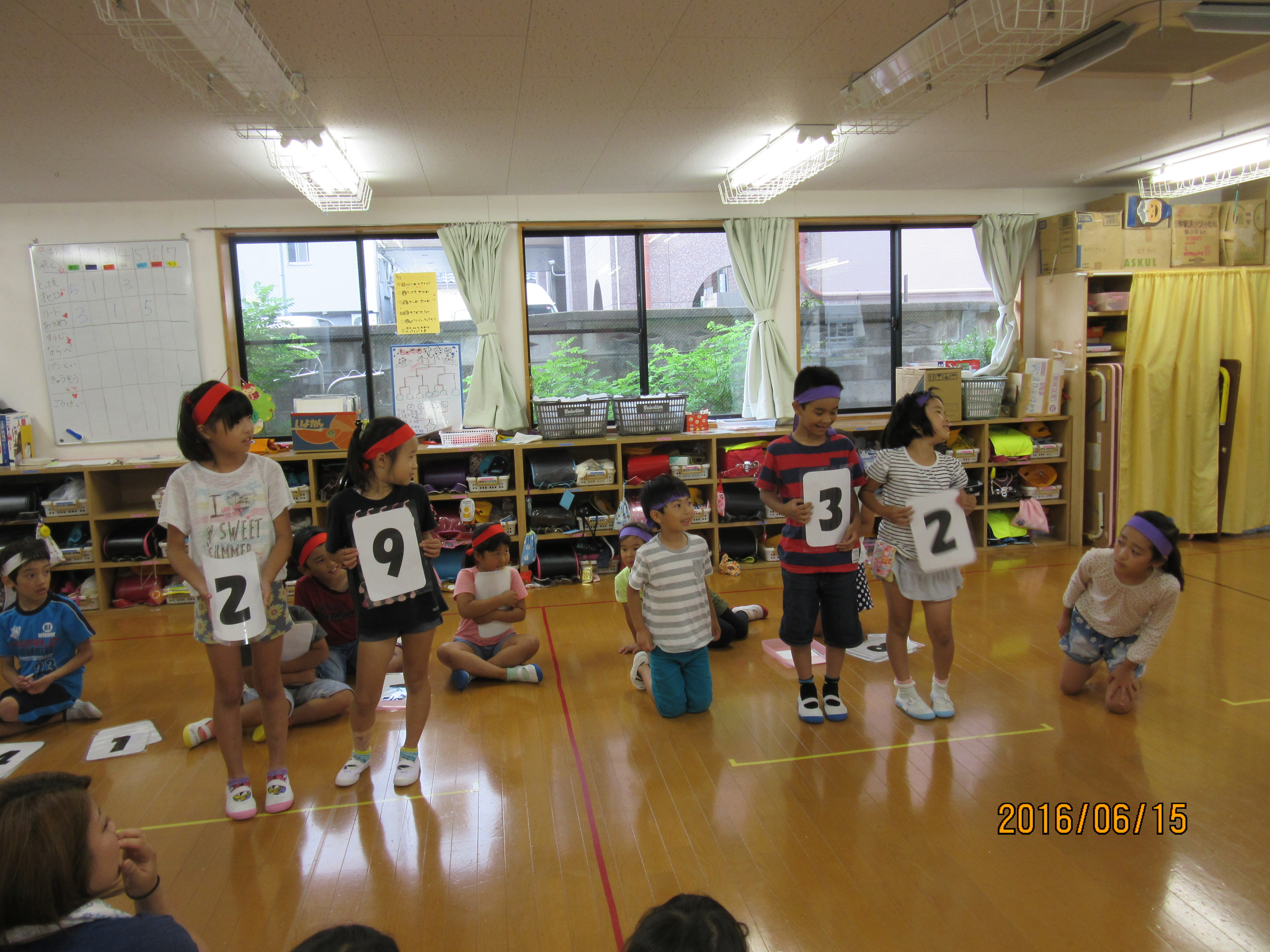 3つ目は、静かに遊べる「数字あわせ」です♪このゲームは体力よりも知力を使います。出題された問題に対して、班で計算をして答えを考えます。そして代表者が数字のカードを持って答えを出します!この時、応援席側から見て正確な数を表示しなければならないので、立ち位置を間違えると全く違う答えになってしまうんです(-ω-;)計算やら位置やらを考えながら行うゲームでした!