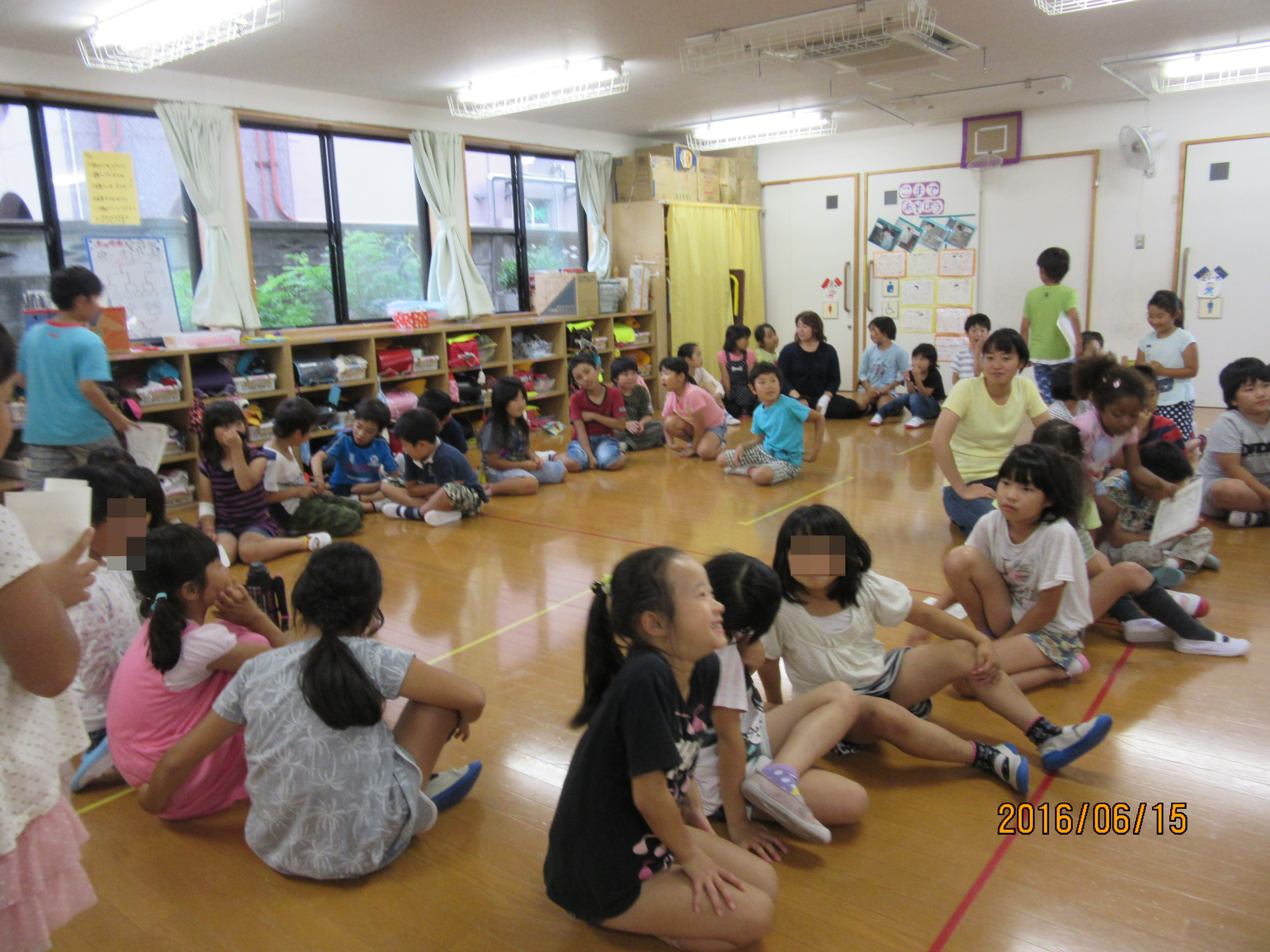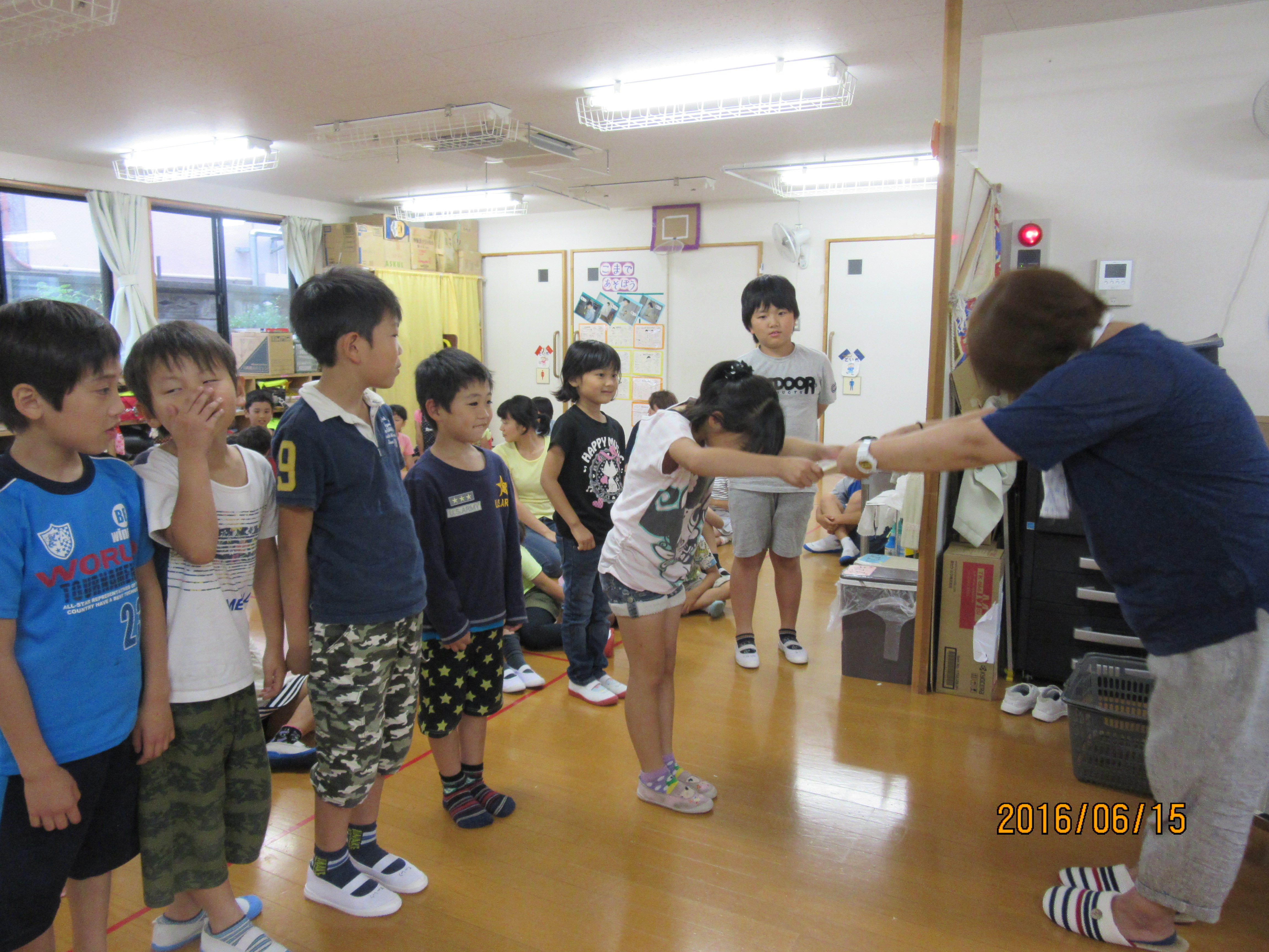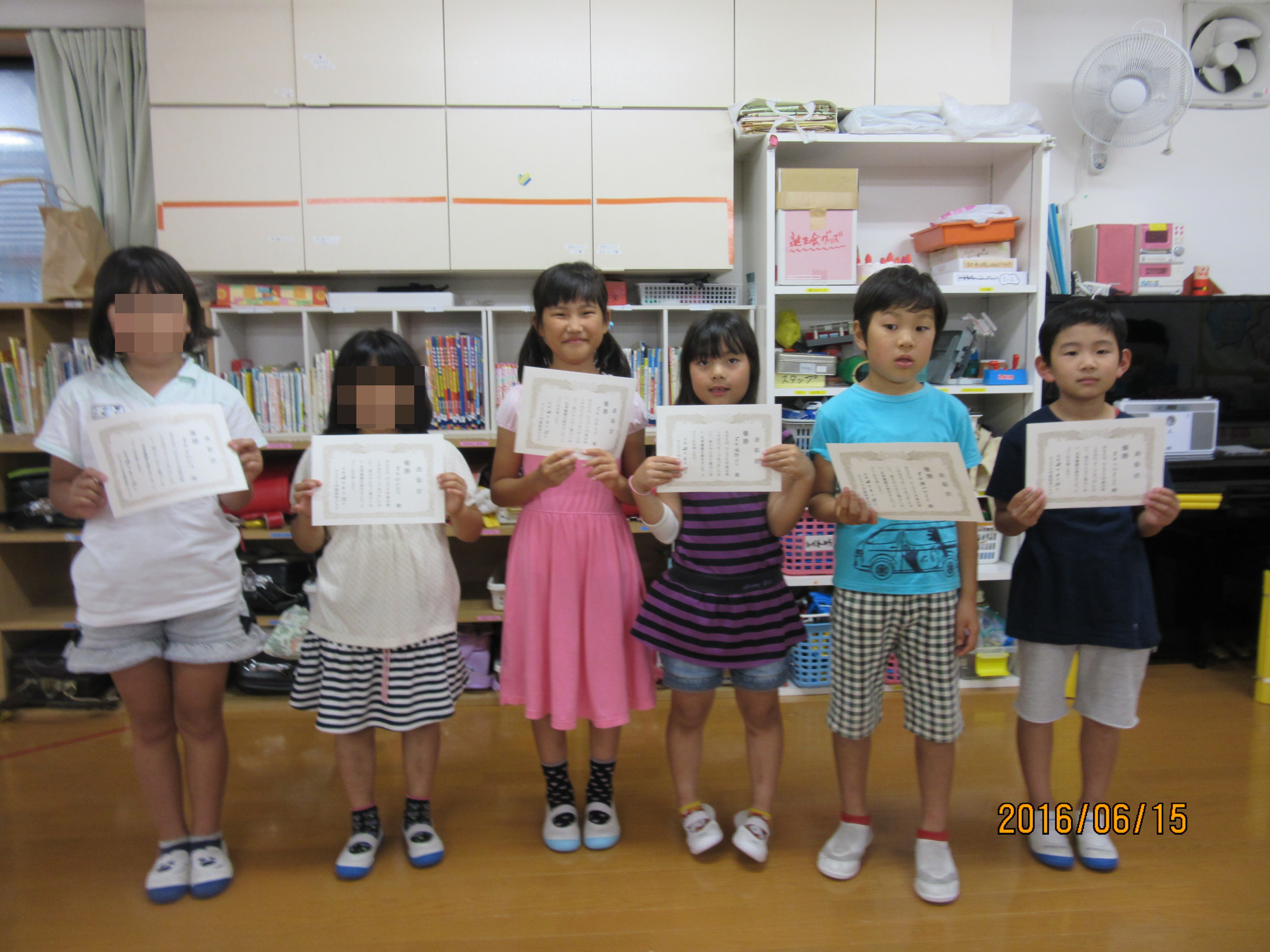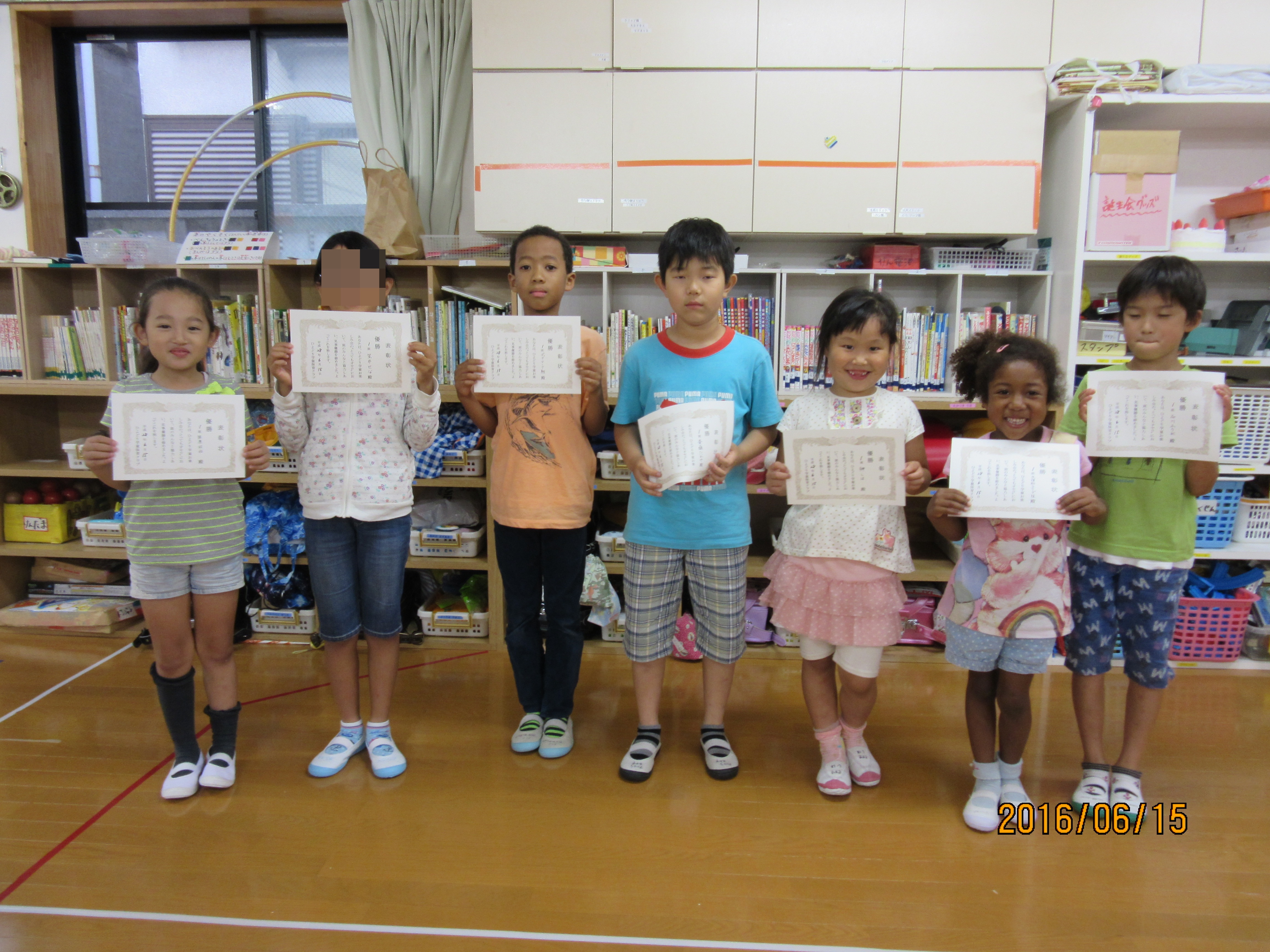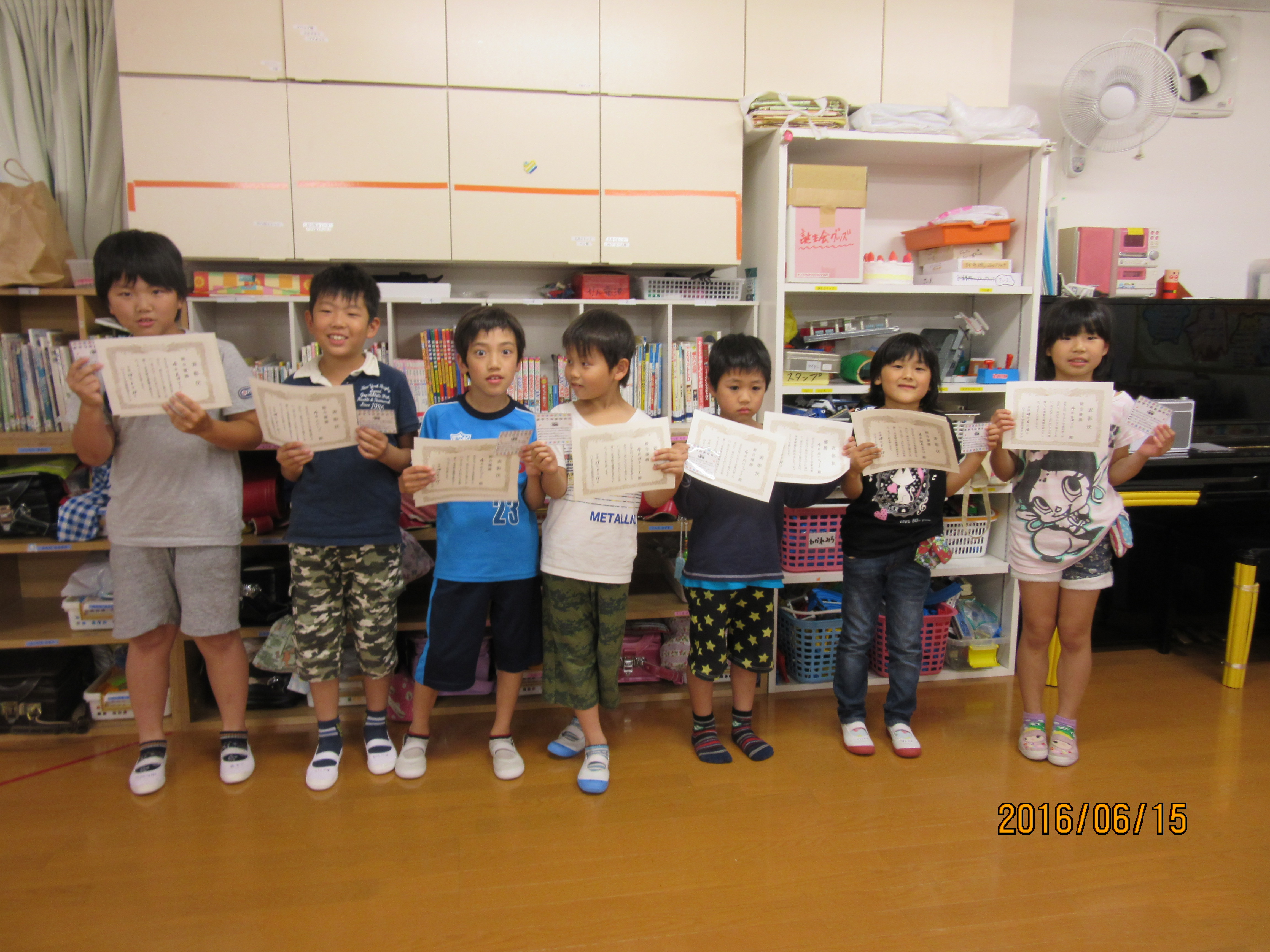 お楽しみ会④ 丸くなっておやつ★ 全ての競技が終わり、パン食い競走で取ったパンとアイスのおやつを食べました♪今日は特別に皆で円になっておやつです((*´∀`*))たまにはこういうおやつの食べ方もいいもんですね〜( ´艸`) そして、いよいよ表彰式!! それぞれのゲームで1位になった班のメンバー全員に賞状と、総合優勝の班にはおやつのおかわり1番券をプレゼント♪ とってもオセロ優勝班♪ カード集めの優勝班♪ 賞状は全員分を班長が代表で受け取ります!かっこいいですね♪ 数字ならべと総合優勝を勝ち取った班♪おめでとう!