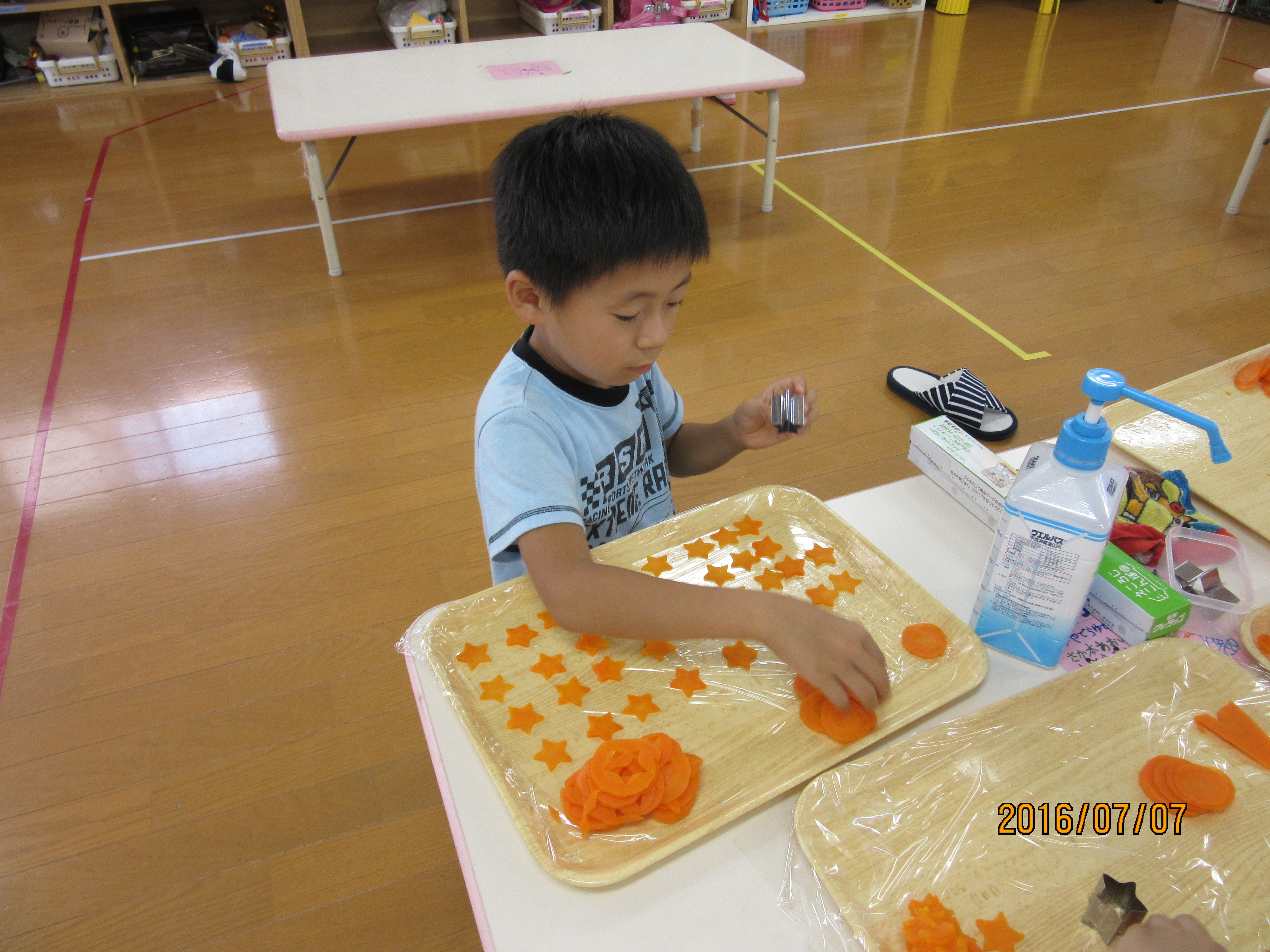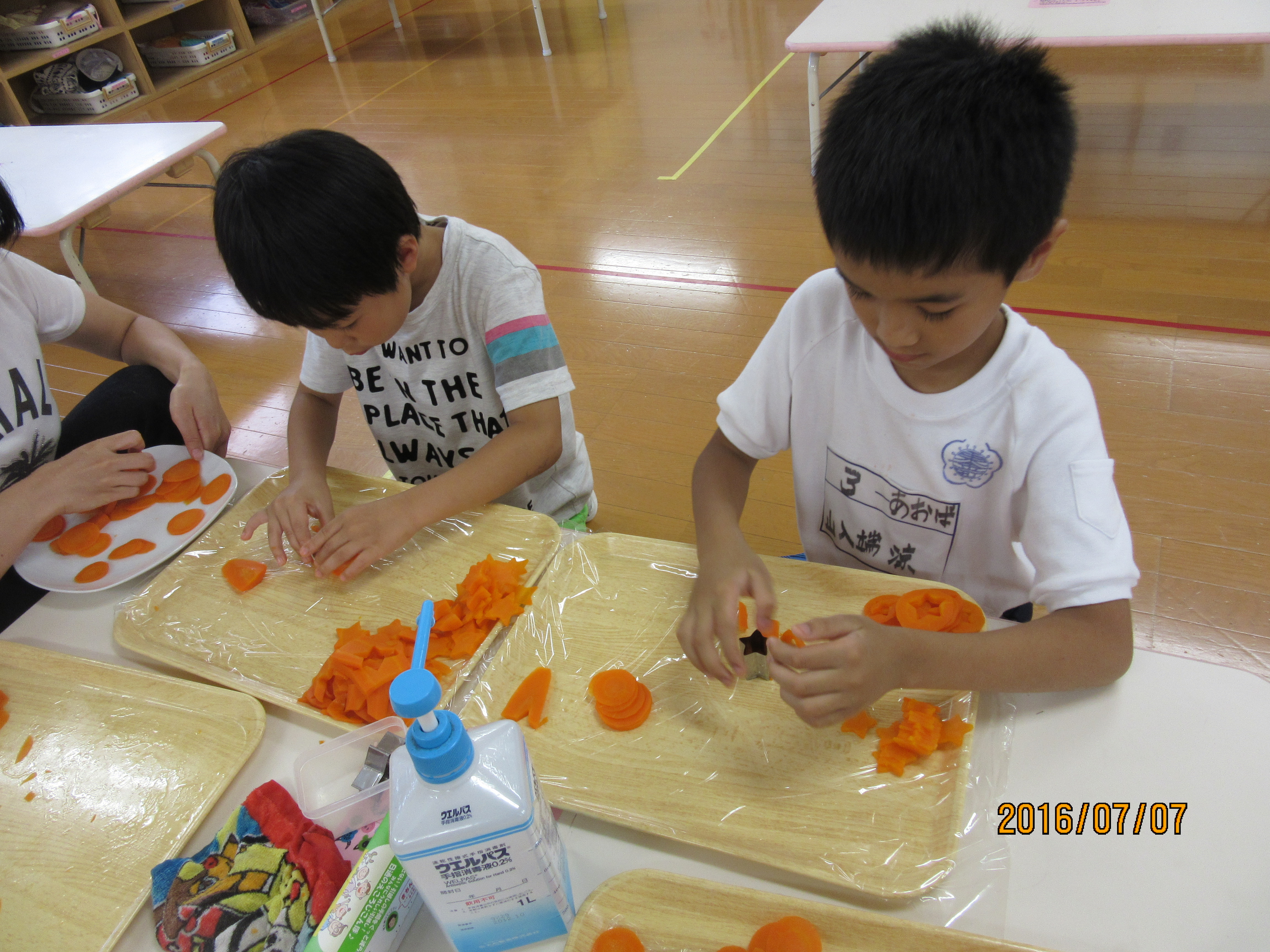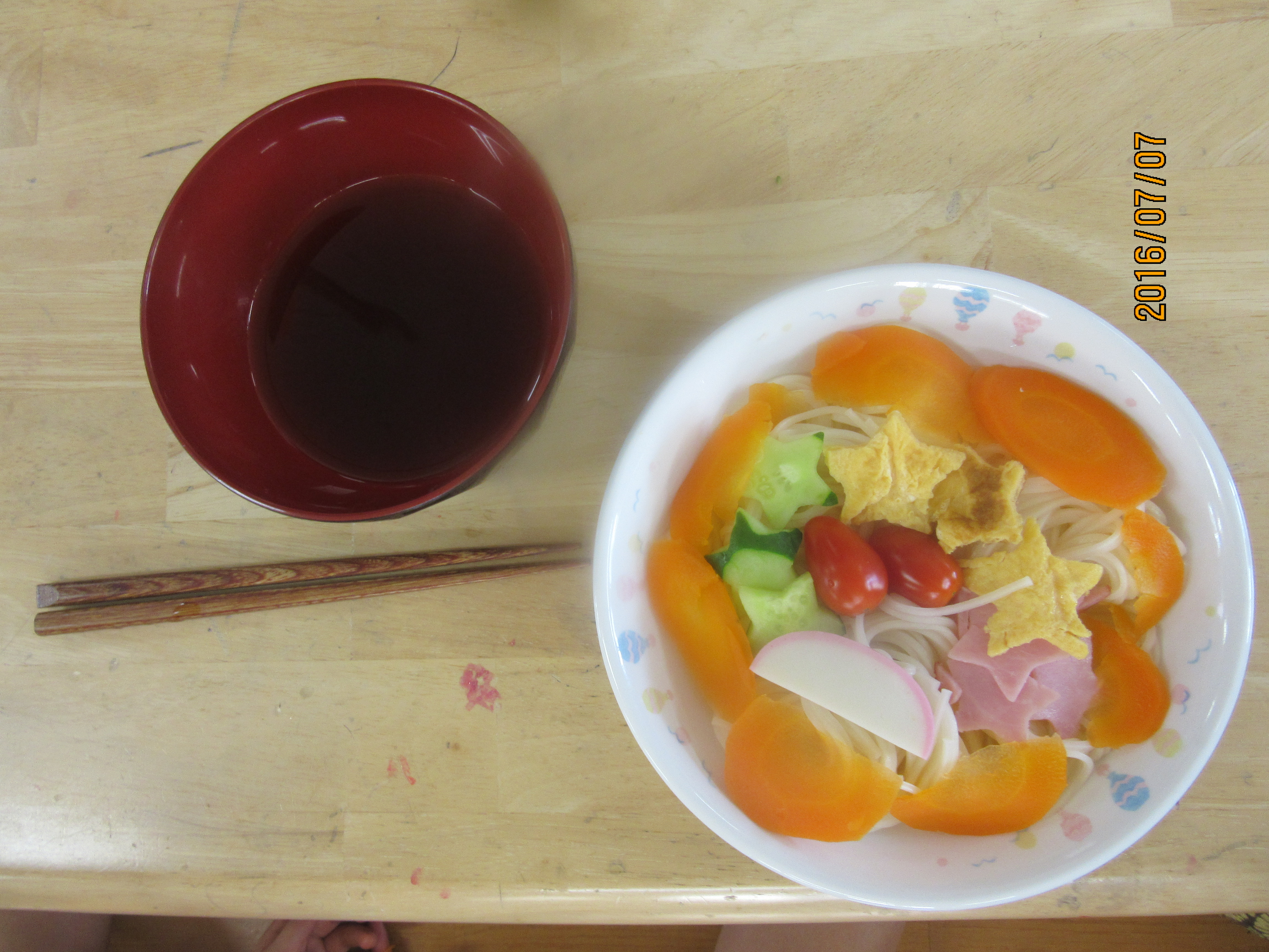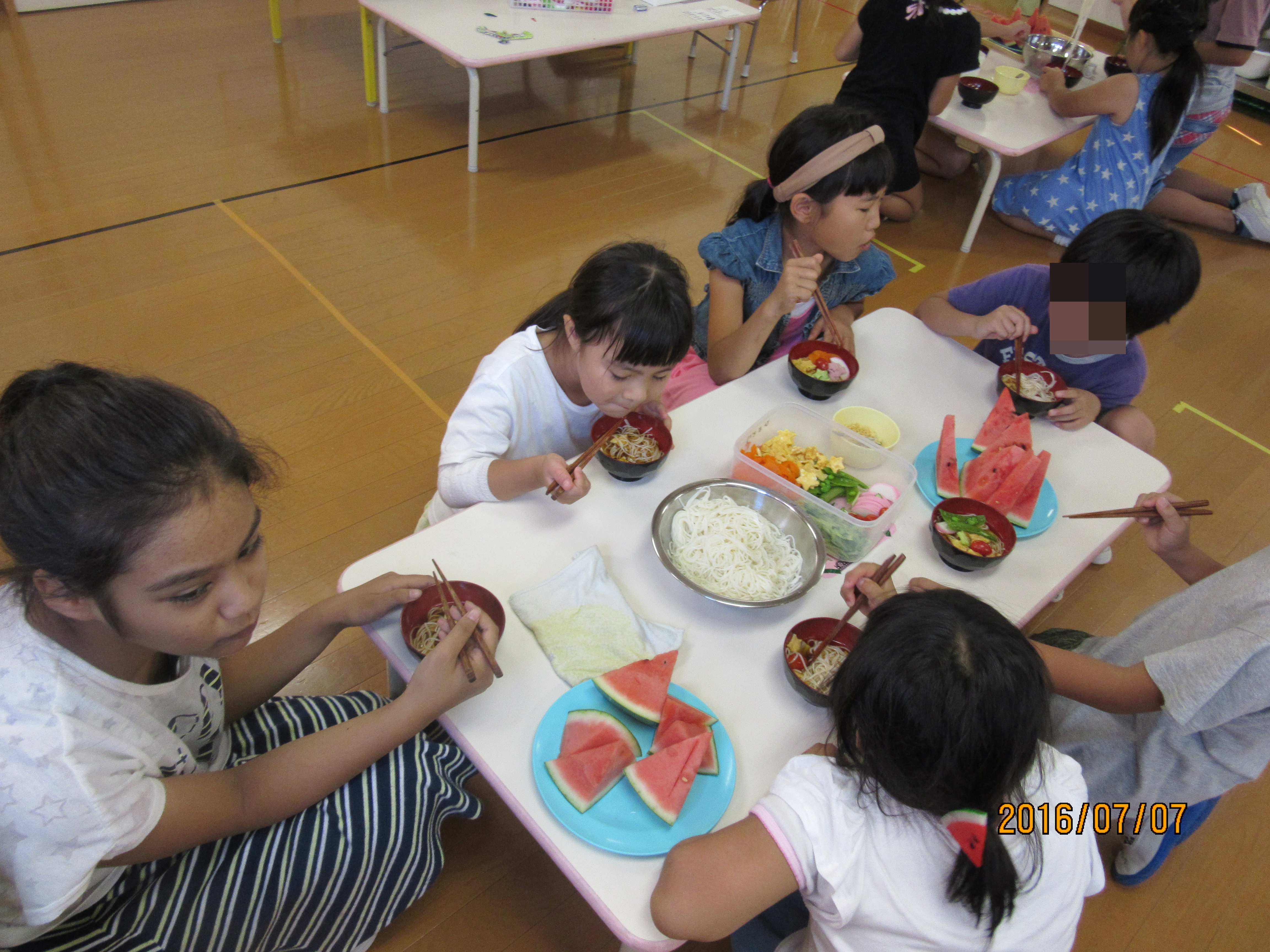 七夕の集い♪ こんな感じで自分達でデコレーション♪ 今年の七夕は、笹の葉に飾りつけと短冊に願いごとを事前に行って、7日の日は木曜で帰宅時間が遅かった為、七夕そうめんをおやつに作りました!七夕仕様のそうめんの具材を自分達で飾りつけ(*゜ー゜)結構可愛らしいのができましたよ! みんな大好きなそうめん♪とんでもない量のそうめんを沢山食べ、すいかもものすごいお替りの勢いで、今年の七夕は食べる七夕として幕を閉じました★ デコ食材は早く帰ってきたあおば学級さんが作ってくれましたよ♪ とっても型抜きが上手なんです(´▽`) おいしくいただきました!