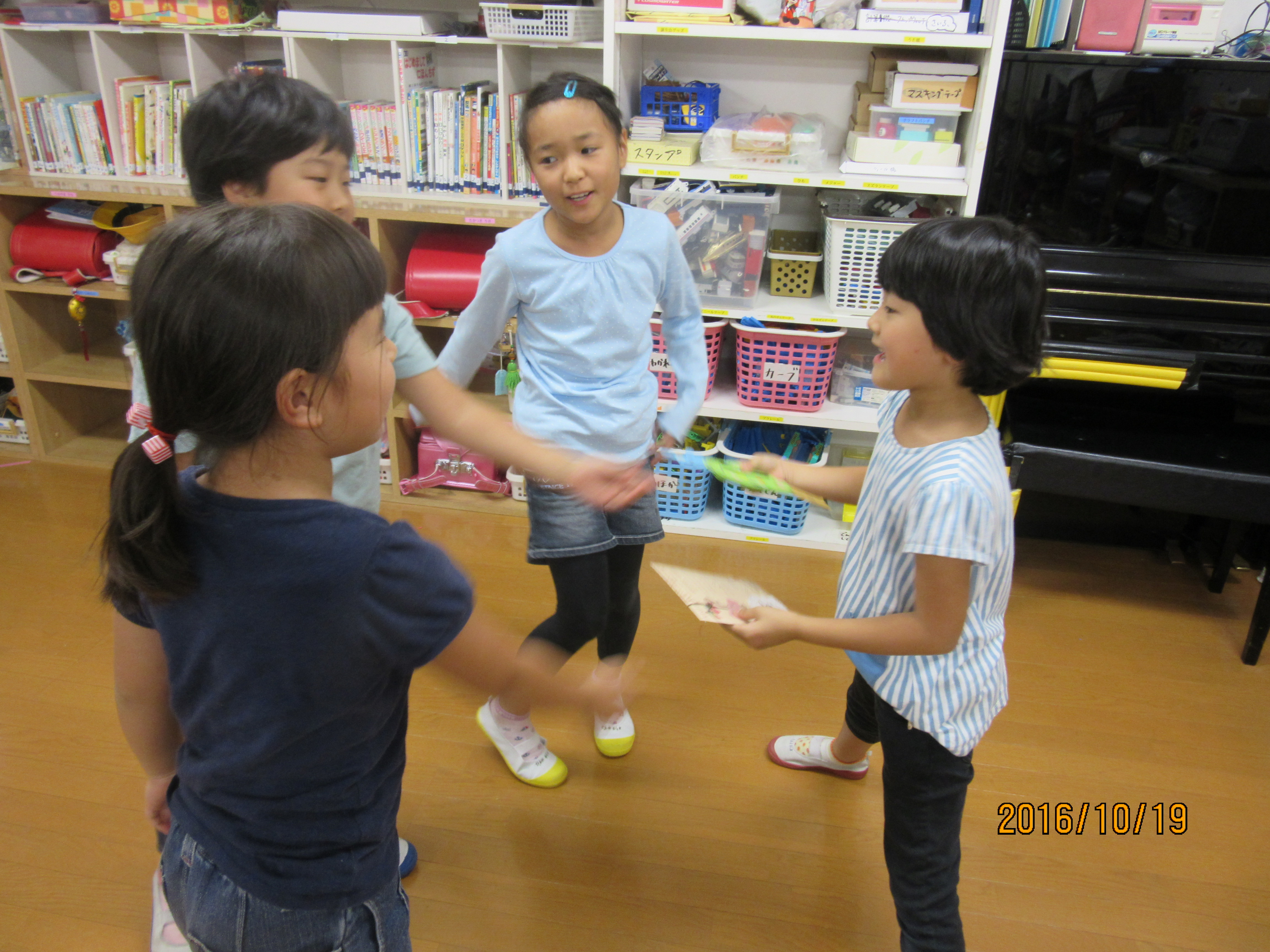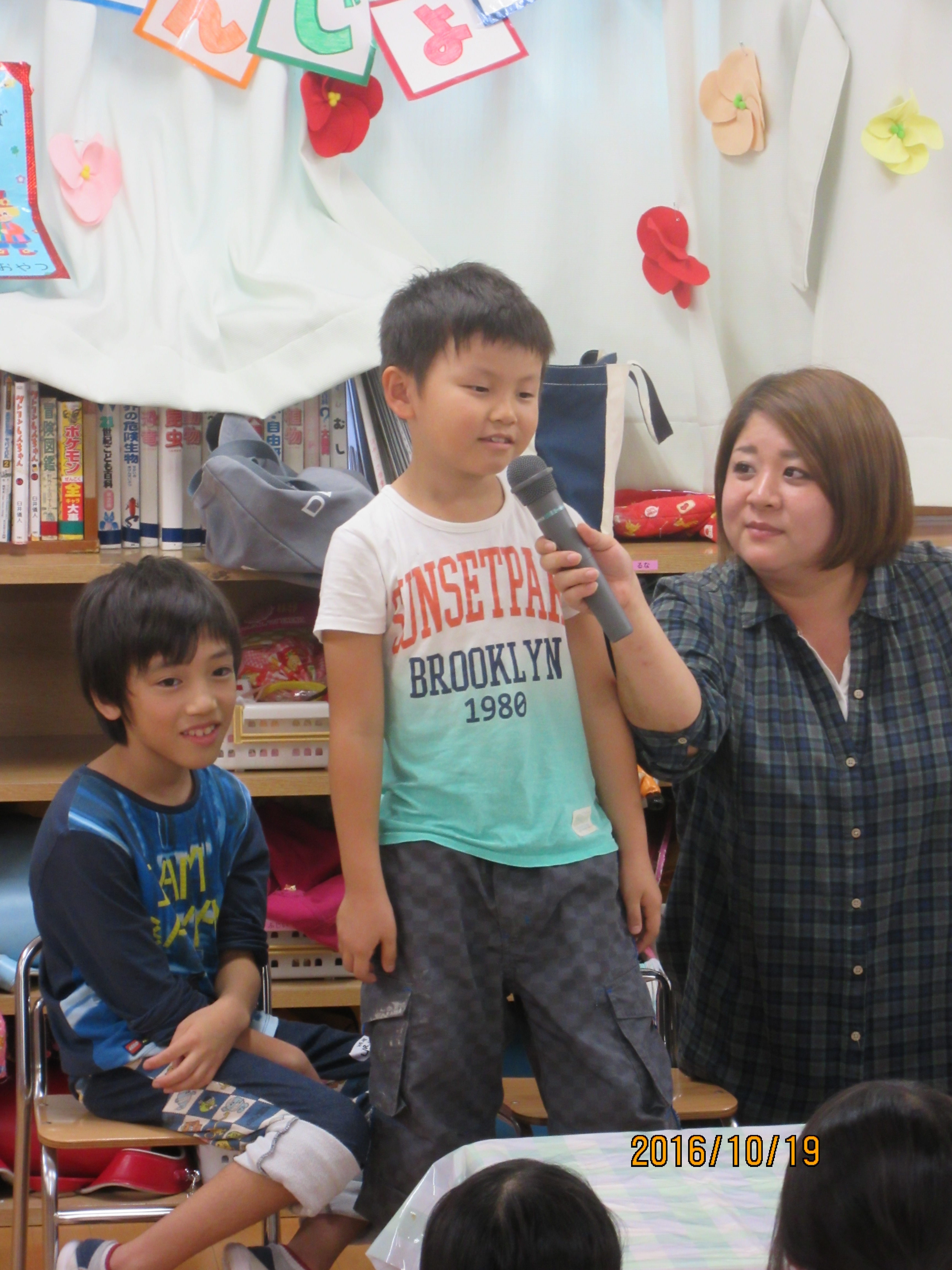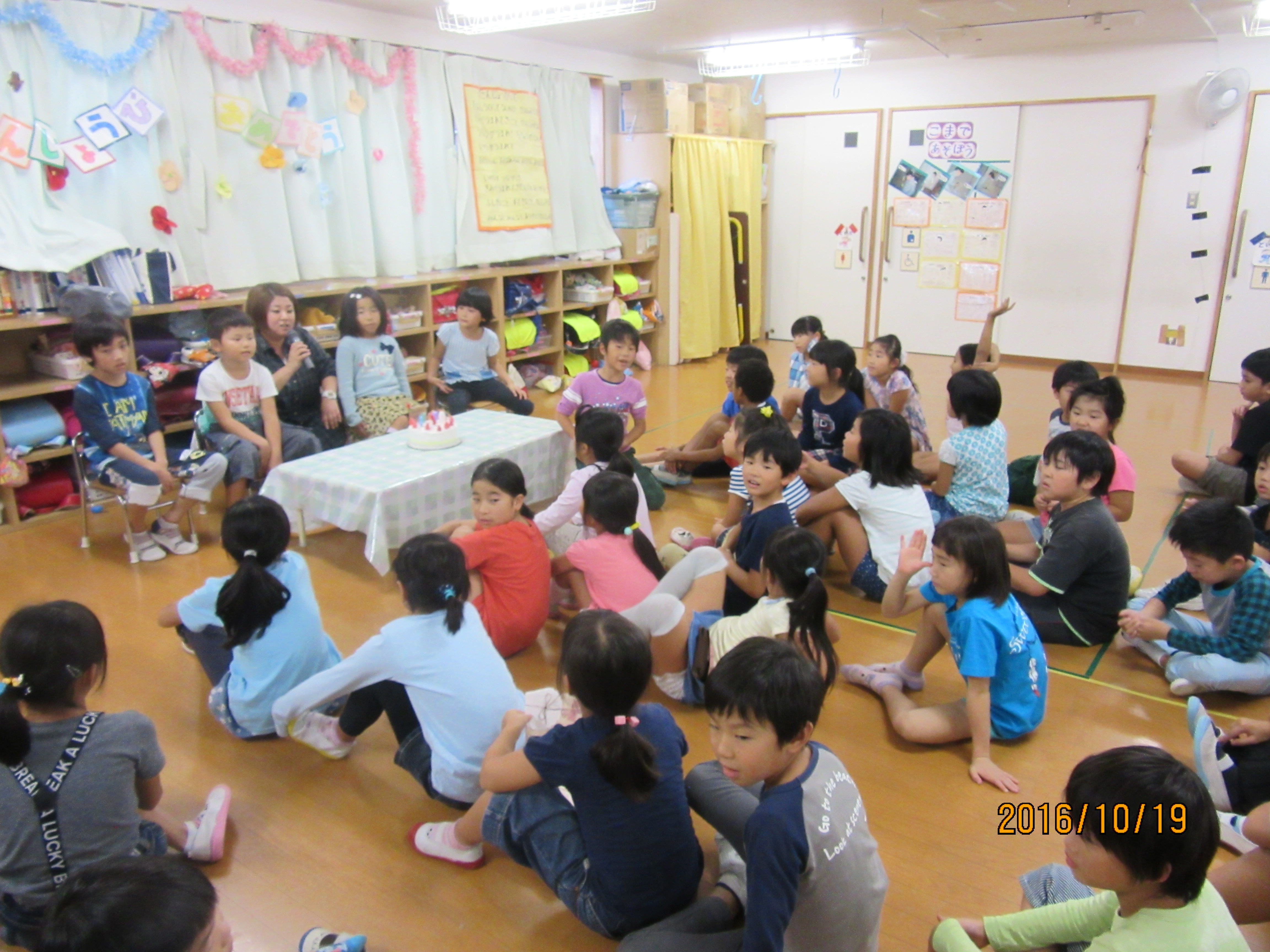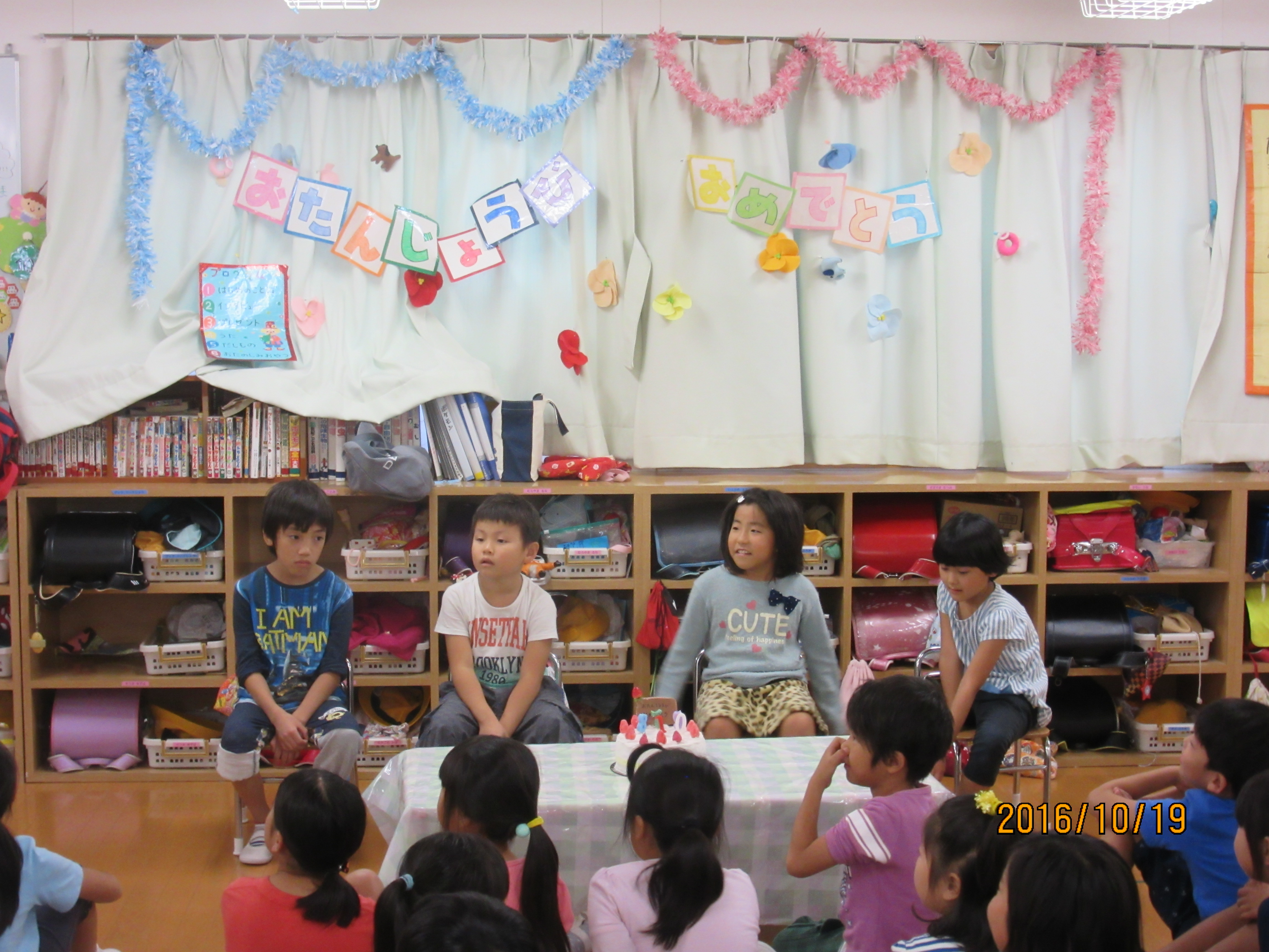 HAPPY BIRTHDAY★OCTOBER 今月の誕生日さんたち♪ ハロウィンやカーニバルの都合で、いつもより1週間早い誕生日会になりましたが、子ども達は文句を言わずに合わせてくれました★ そして今月の誕生日会はなんだか沢山笑った誕生日会になりましたよ(o^―^o) インタビュー★ 全体の様子(´▽`) プレゼントももちろんもらいました!