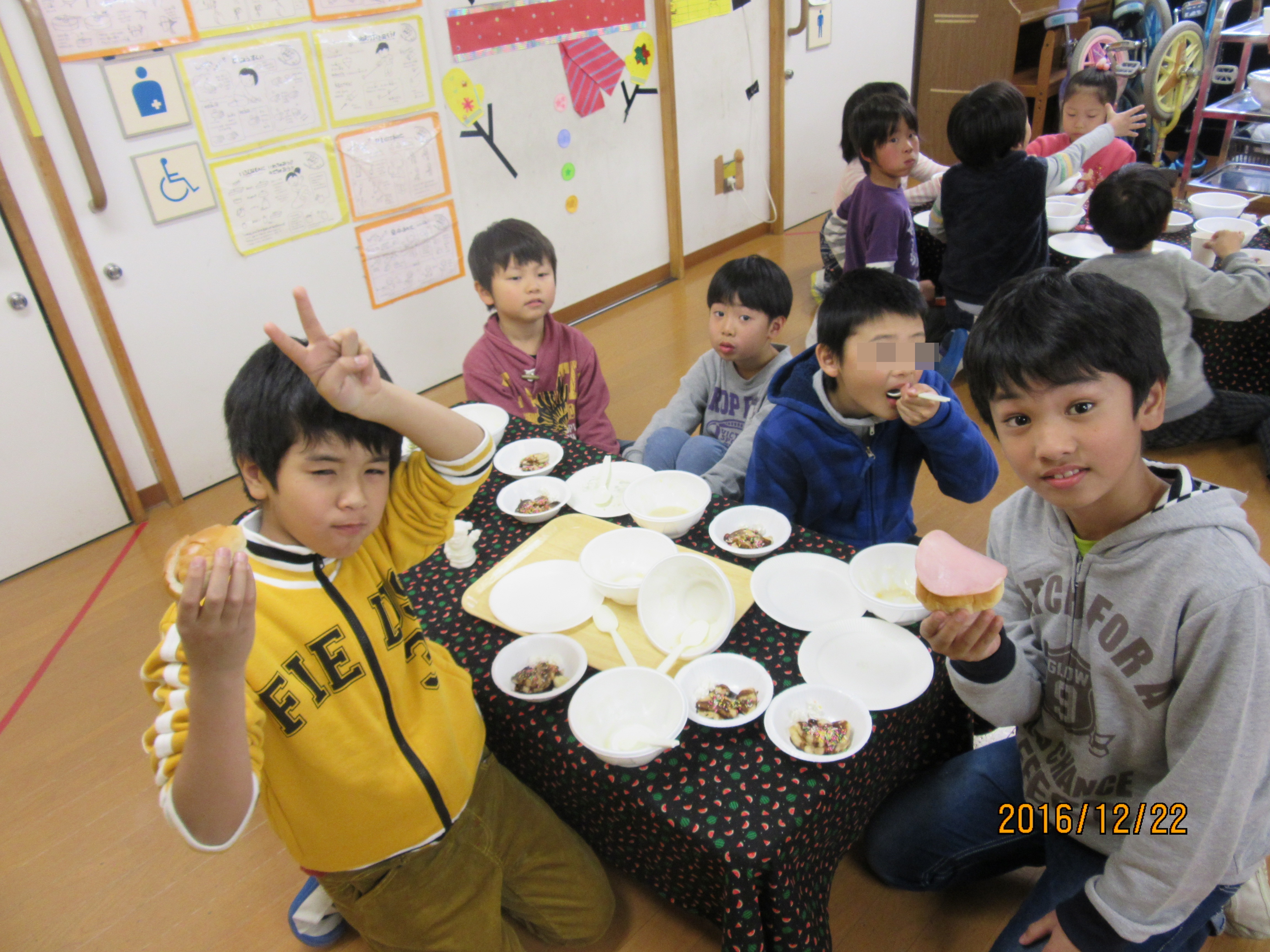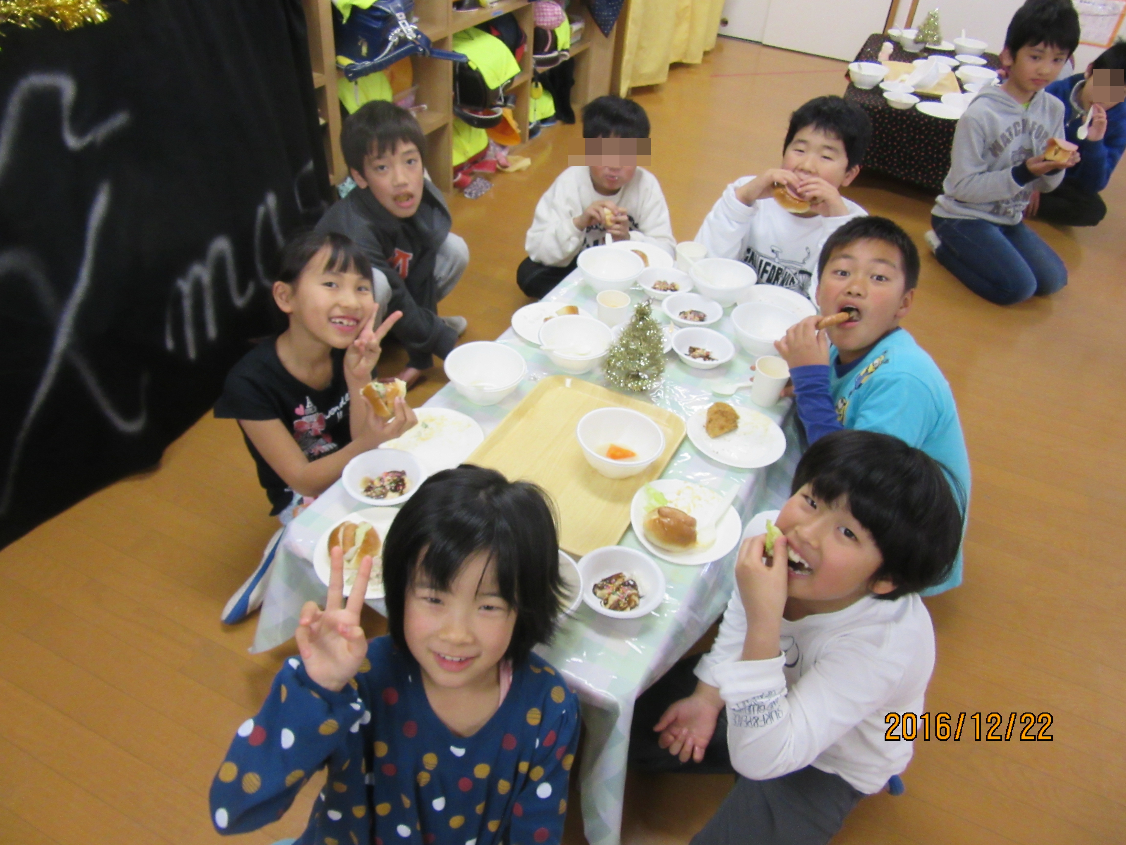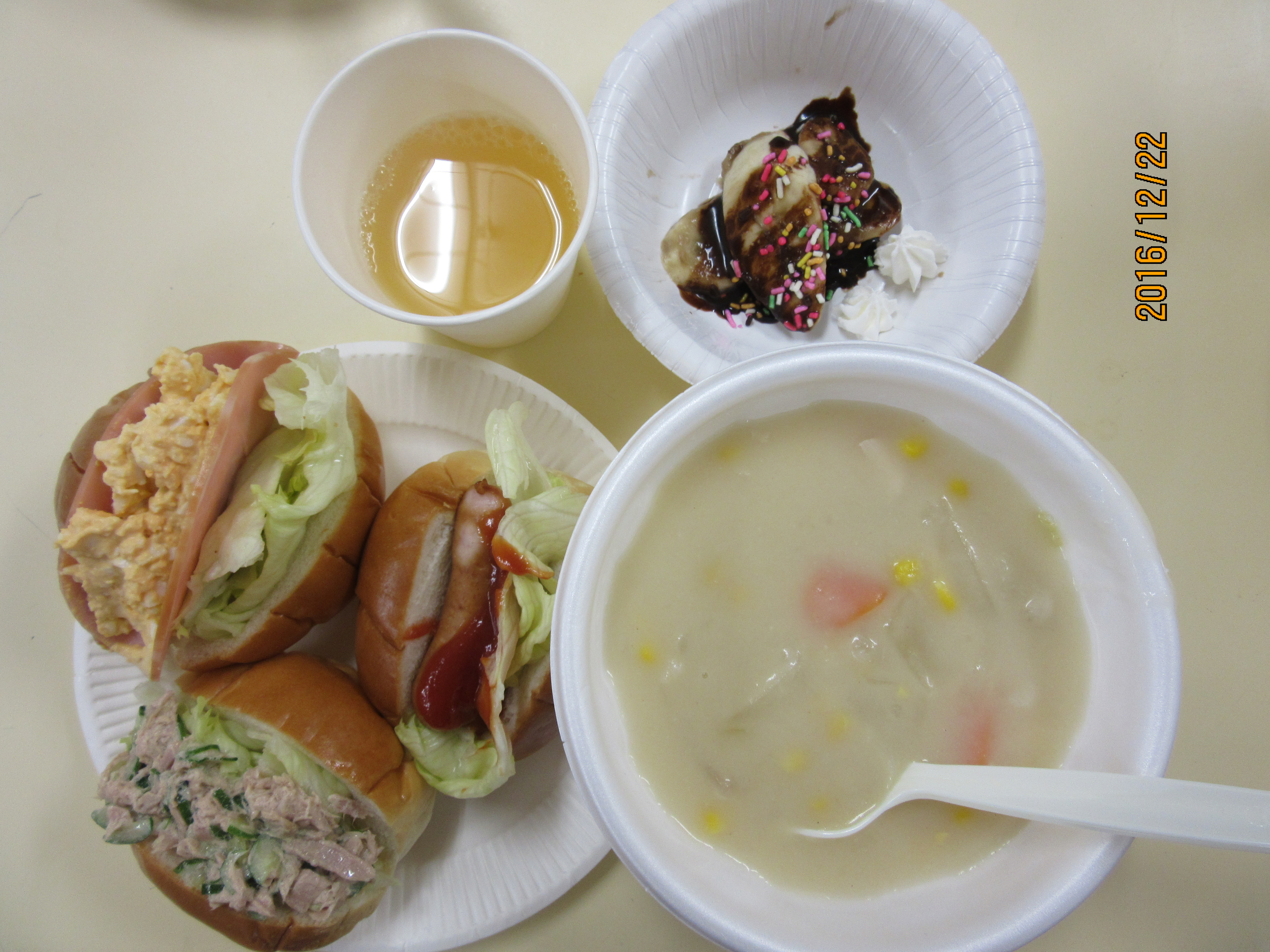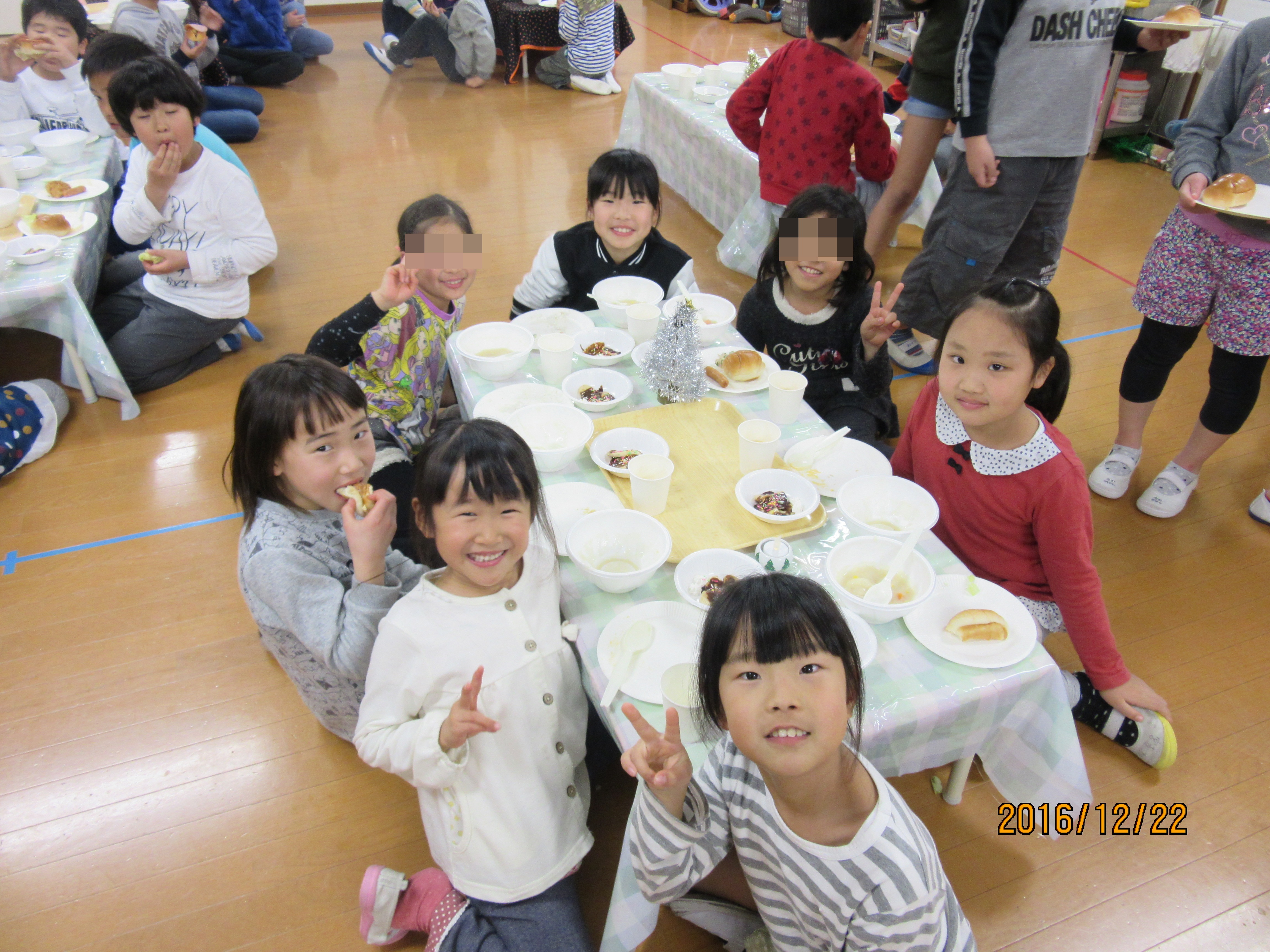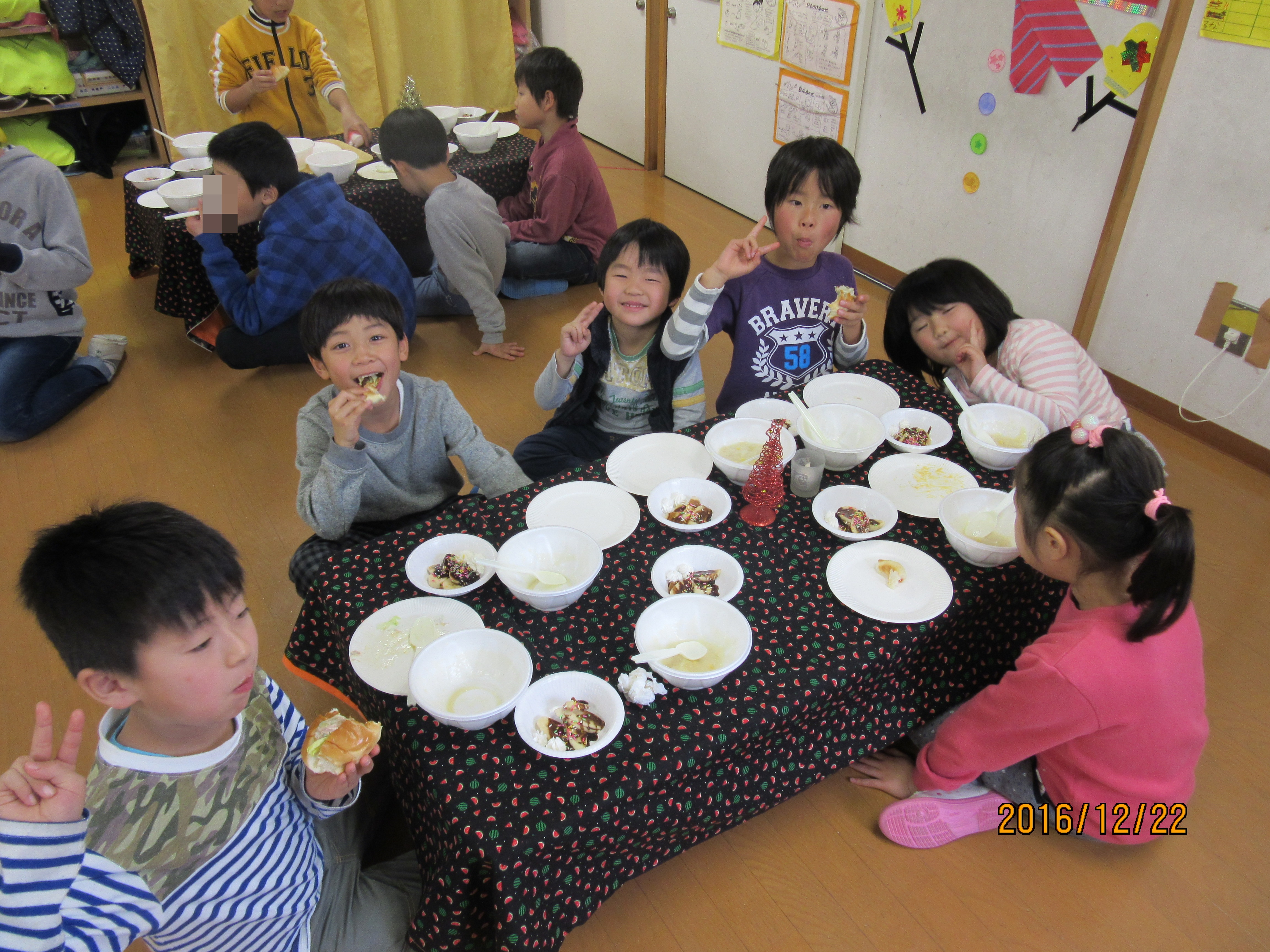 昼食会♪ 今年のメニュー♡ クリスマス会の前は毎年恒例の昼食会(´▽`) 先生達が子ども達にお昼を作る日です♪ 同じ物を食べて、同じおいしさを味わって、楽しく食事をしましょう! 今年のメニューはシチューとパンバイキング★ パンバイキングは色々な食材を自分達ではさんで持って行くというもの(*゜ー゜) 約束としてはレタスを必ず1枚ははさむこと!のみです。 後はどんな事をしてもOK! おいしくいただきました〜ヽ(≧▽≦)ノ 素敵な笑顔♪ 何度もお替りしてくれました♪ おいしいと言ってくれました★ 沢山食べてくれてありがと!