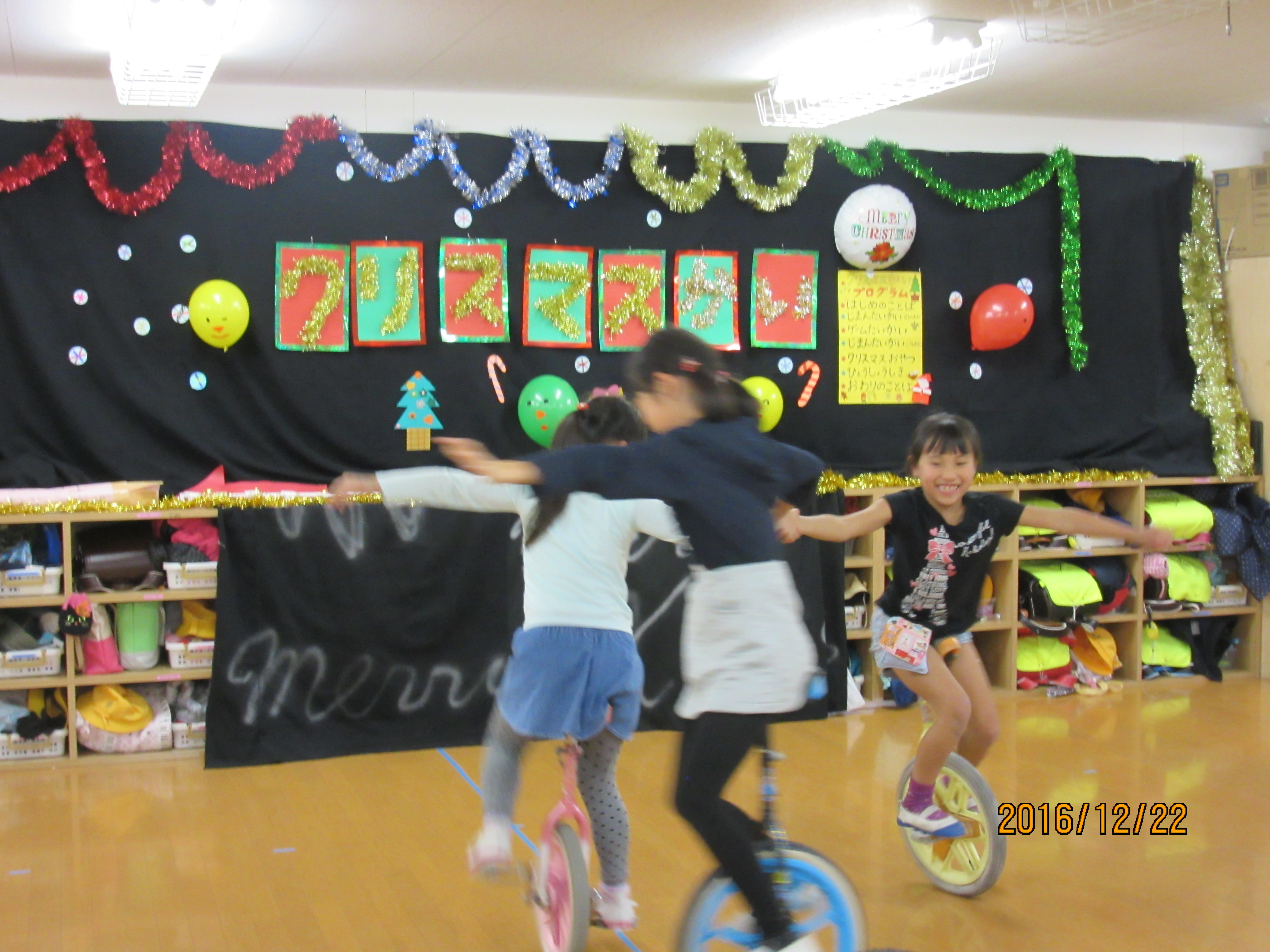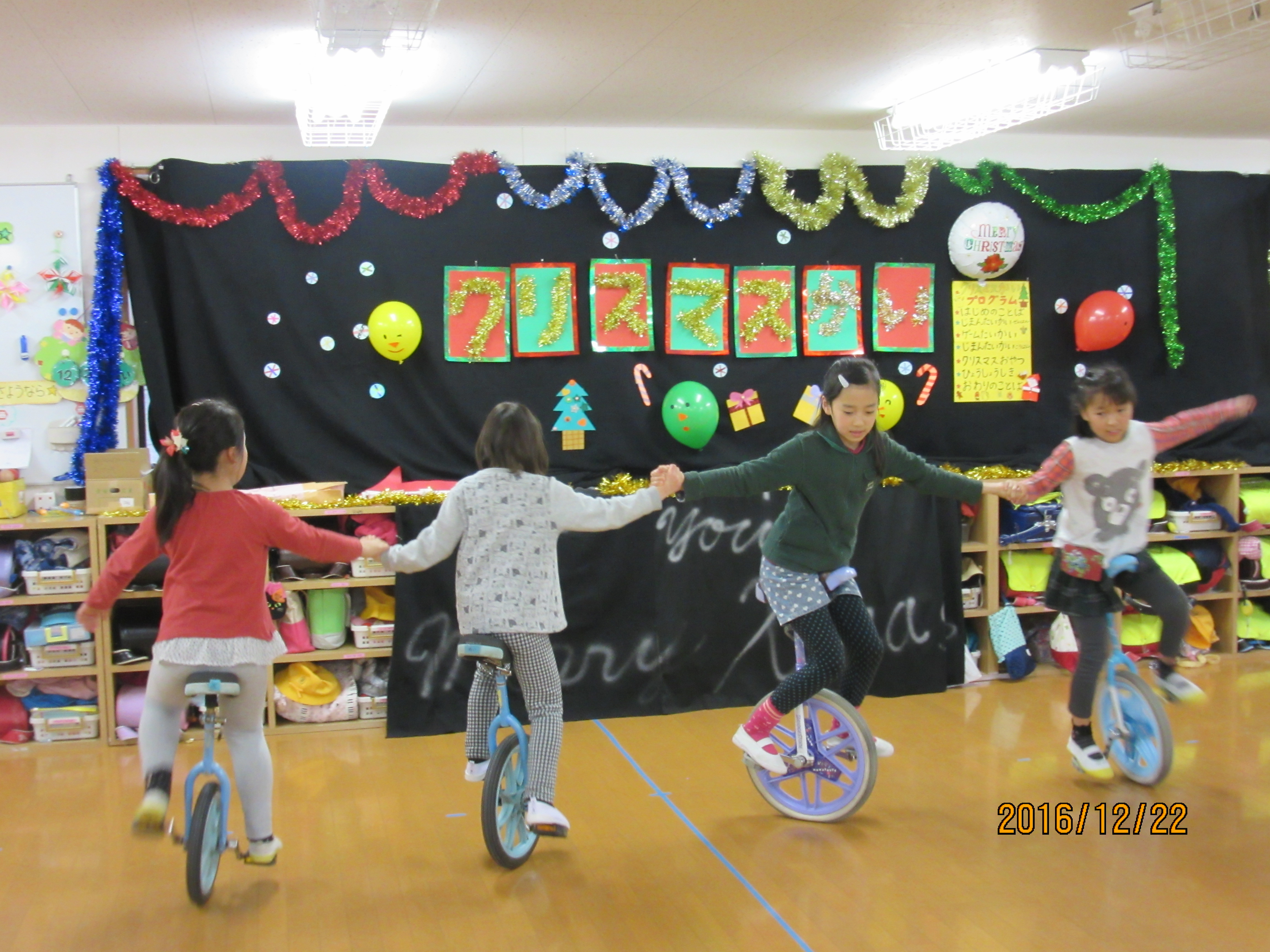 4番目は一輪車♪女子達の日々の努力が報われました!正直本番前日までは大丈夫かな?という具合だったんです。一人ひとりはきちんと出来ているんですが、床のすべり具合などにペースを乱されてしまう子が結構いました…(゜◇゜;)それでも意地で何とか物にして、本番は全ての技が大成功!すばらしい!!