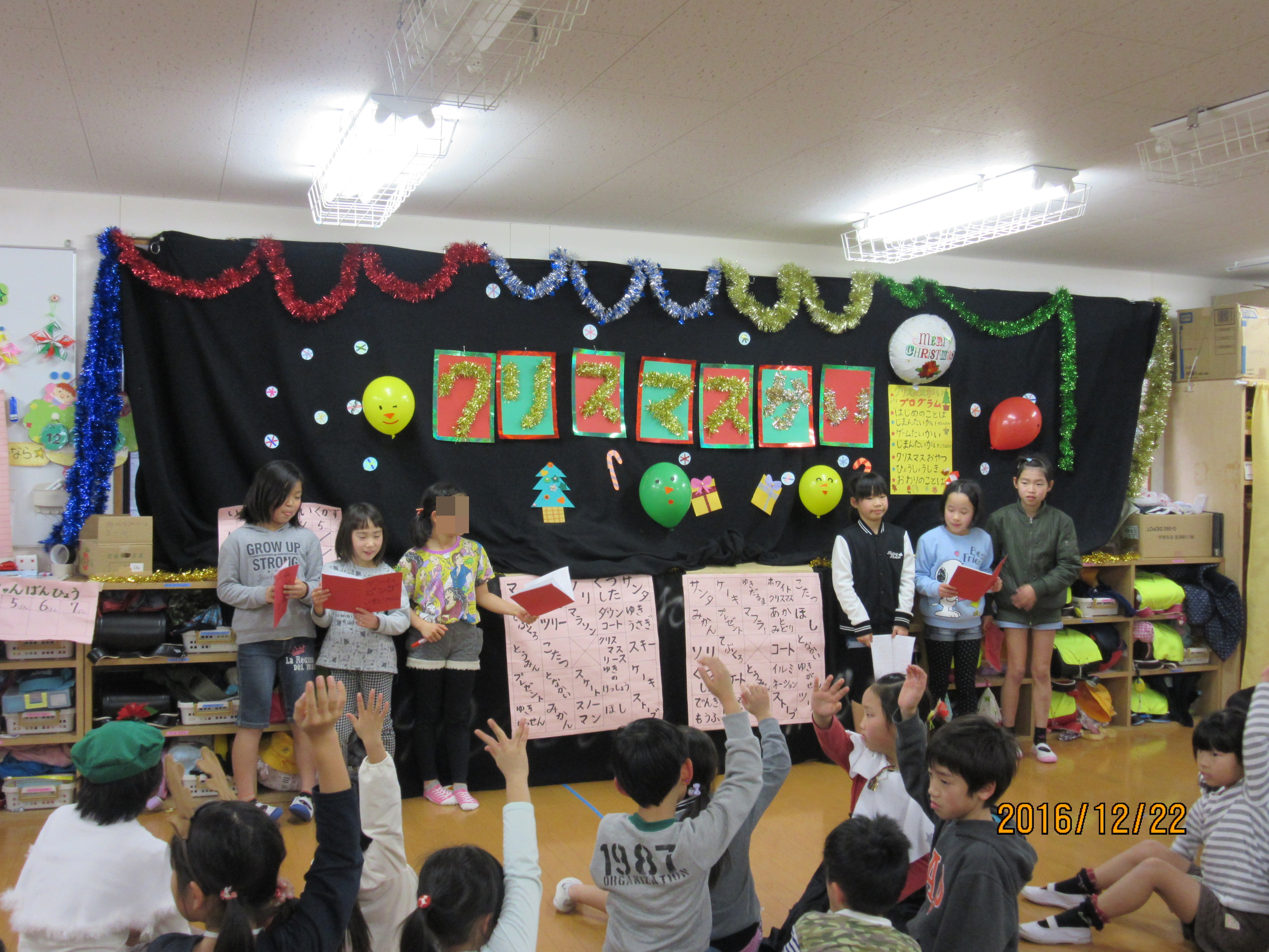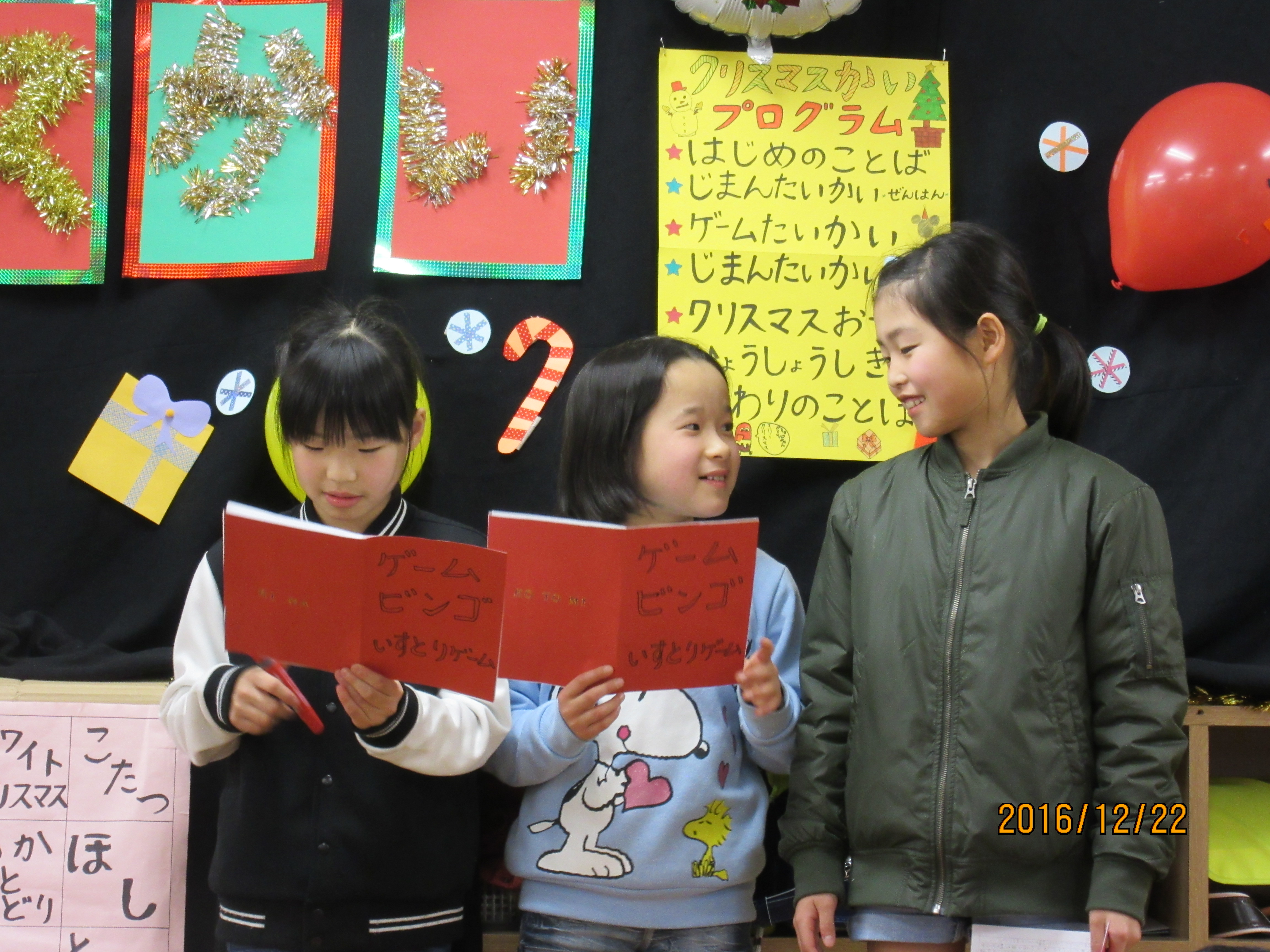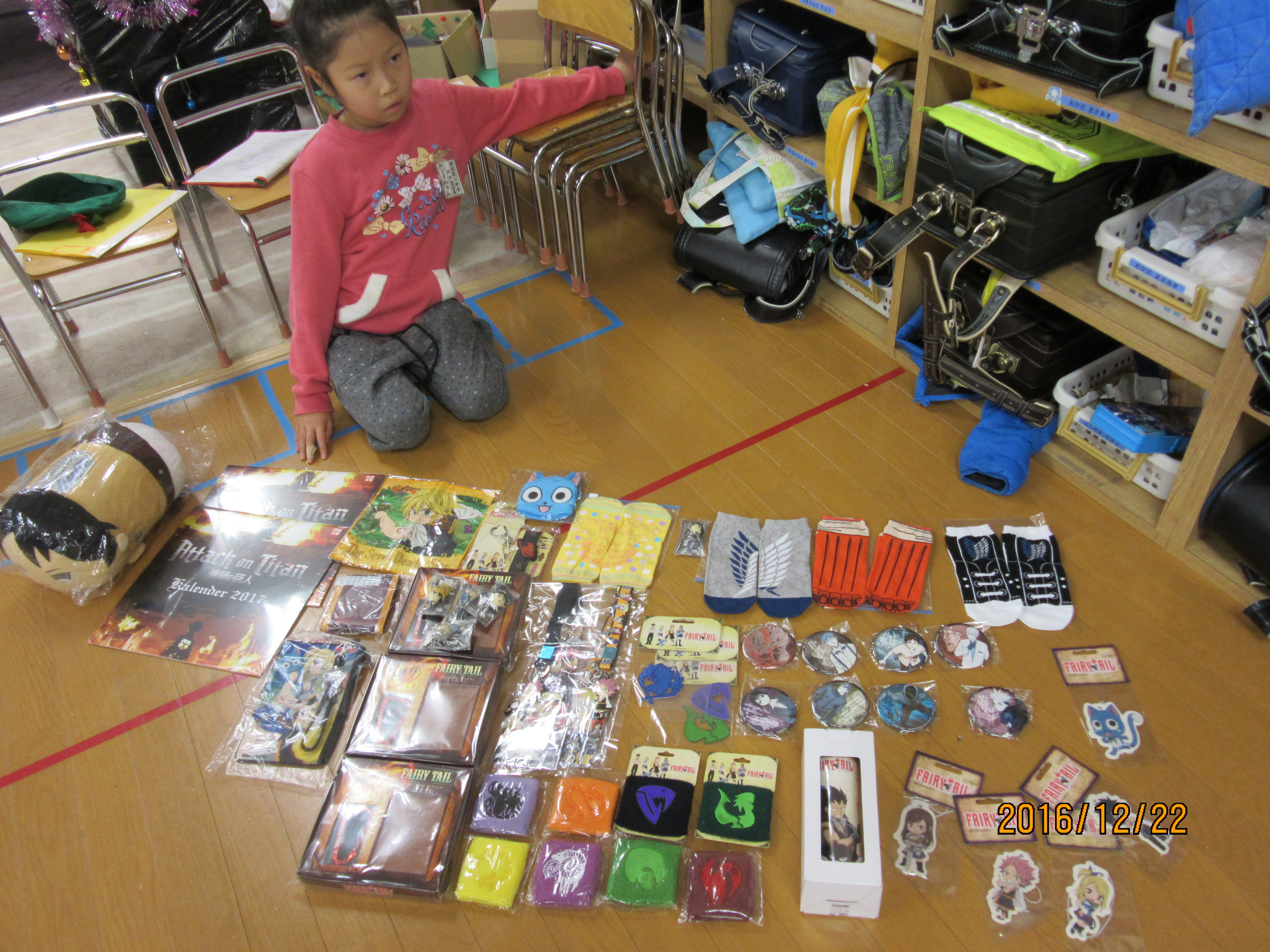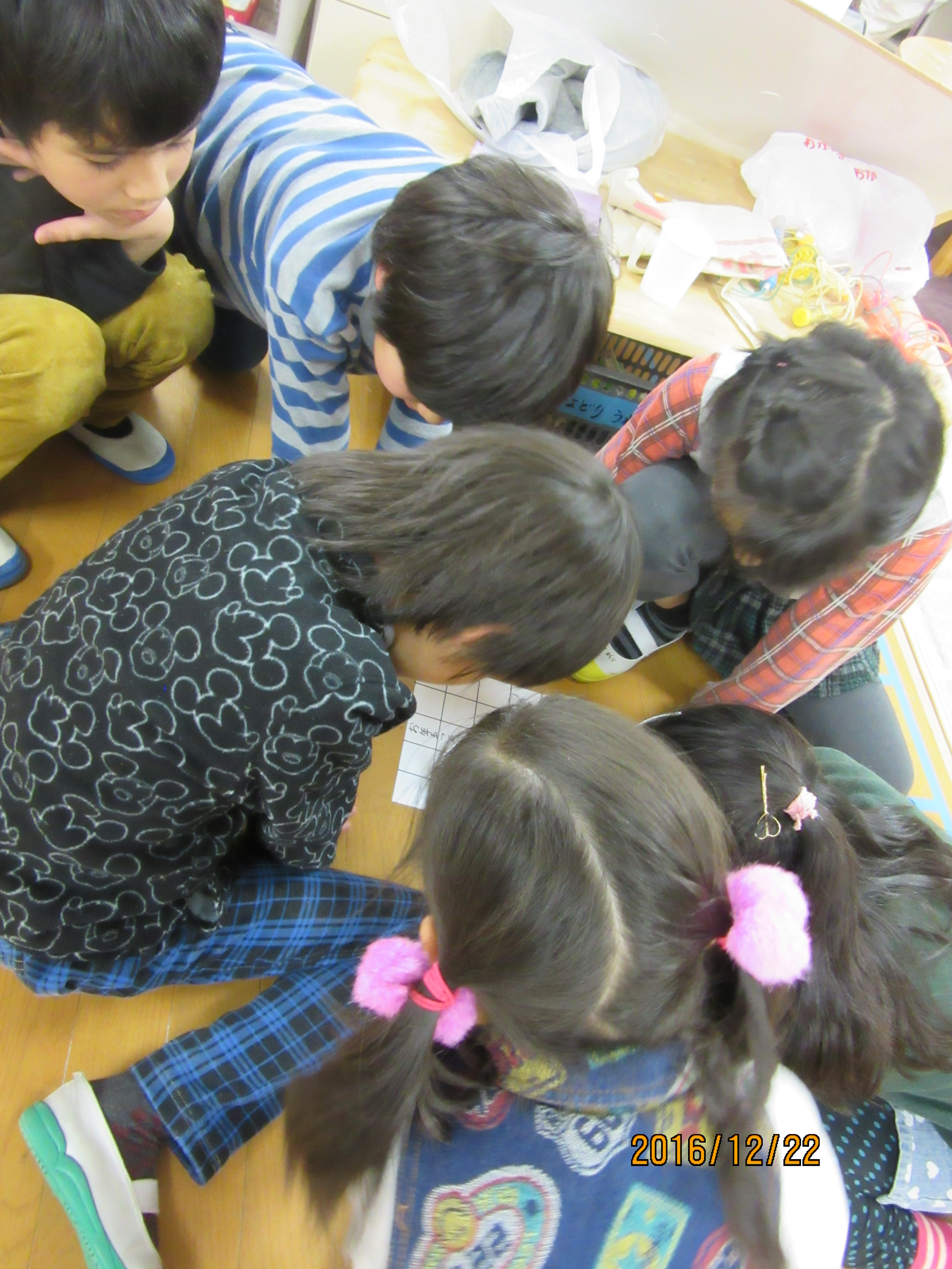クリスマス会・ゲーム ゲームはこのメンバーが仕切ってくれました♪ 今年のクリスマス会のゲームはビンゴ大会です(´▽`) ビンゴのマスに自分たちで考えたお題に添った単語を入れていき、ビンゴシートを完成させます!その後は、班毎にビンゴの単語を発表していき、見事最初にビンゴになった班から景品を選ぶというルール♪ 景品は保護者の方から譲っていただいたアニメグッズ! 有名なアニメなだけに皆興奮しておりました〜★ 司会は緊張したかな?上手に説明できていましたよ★ みのん物産展です(笑)譲っていただいた景品!豪華です♪ ビンゴの枠を埋めるために相談会♪皆真剣です!