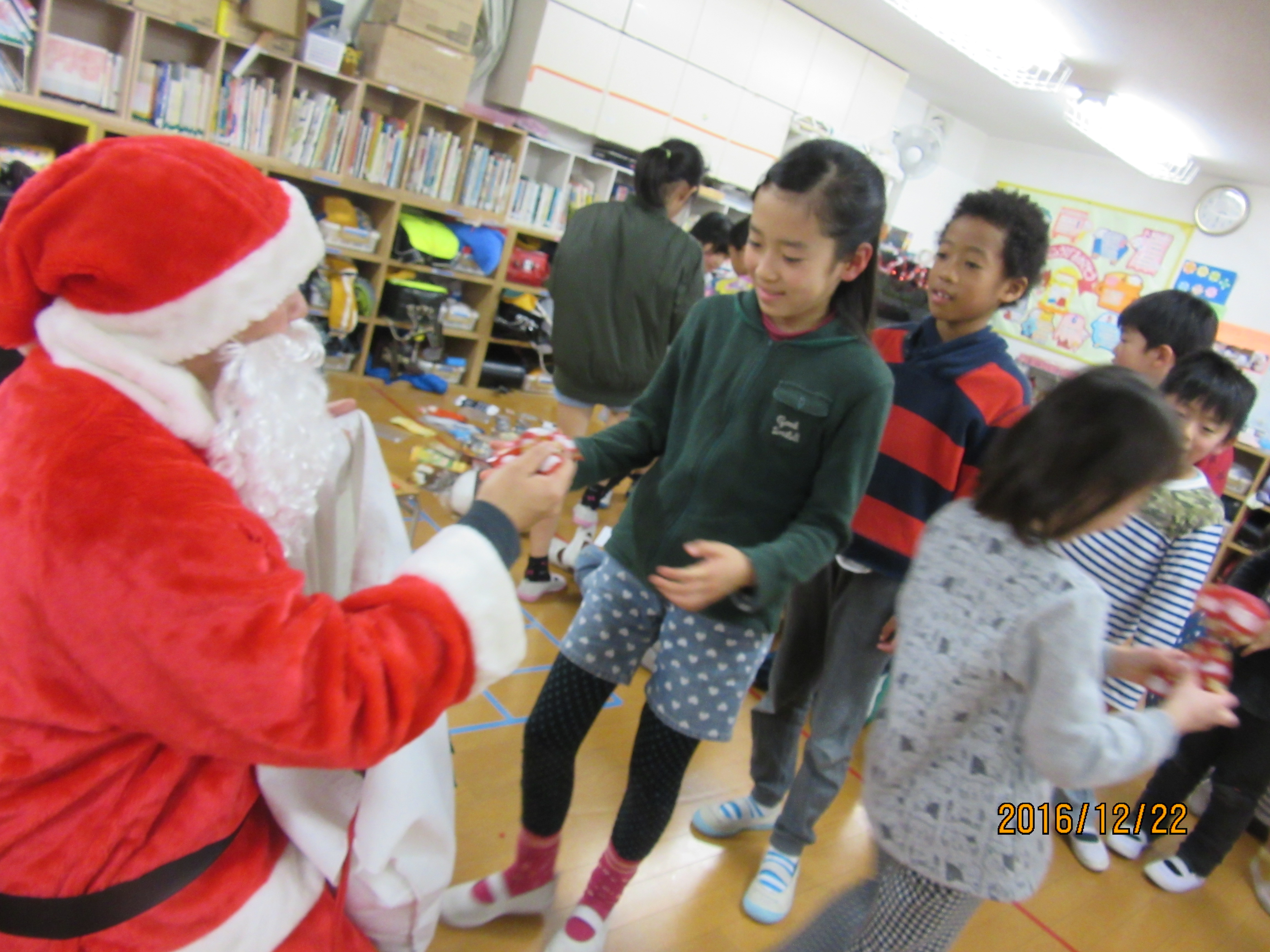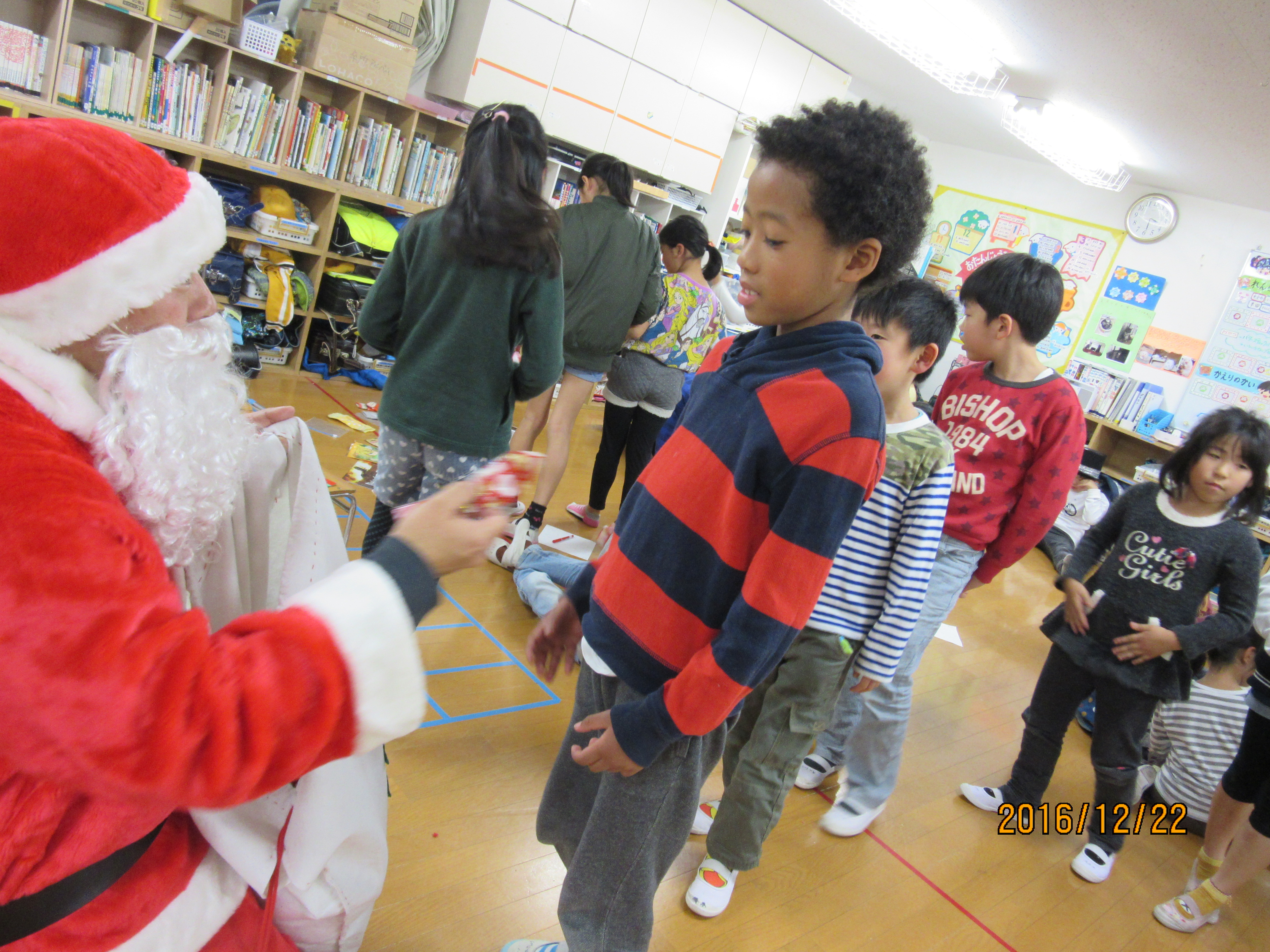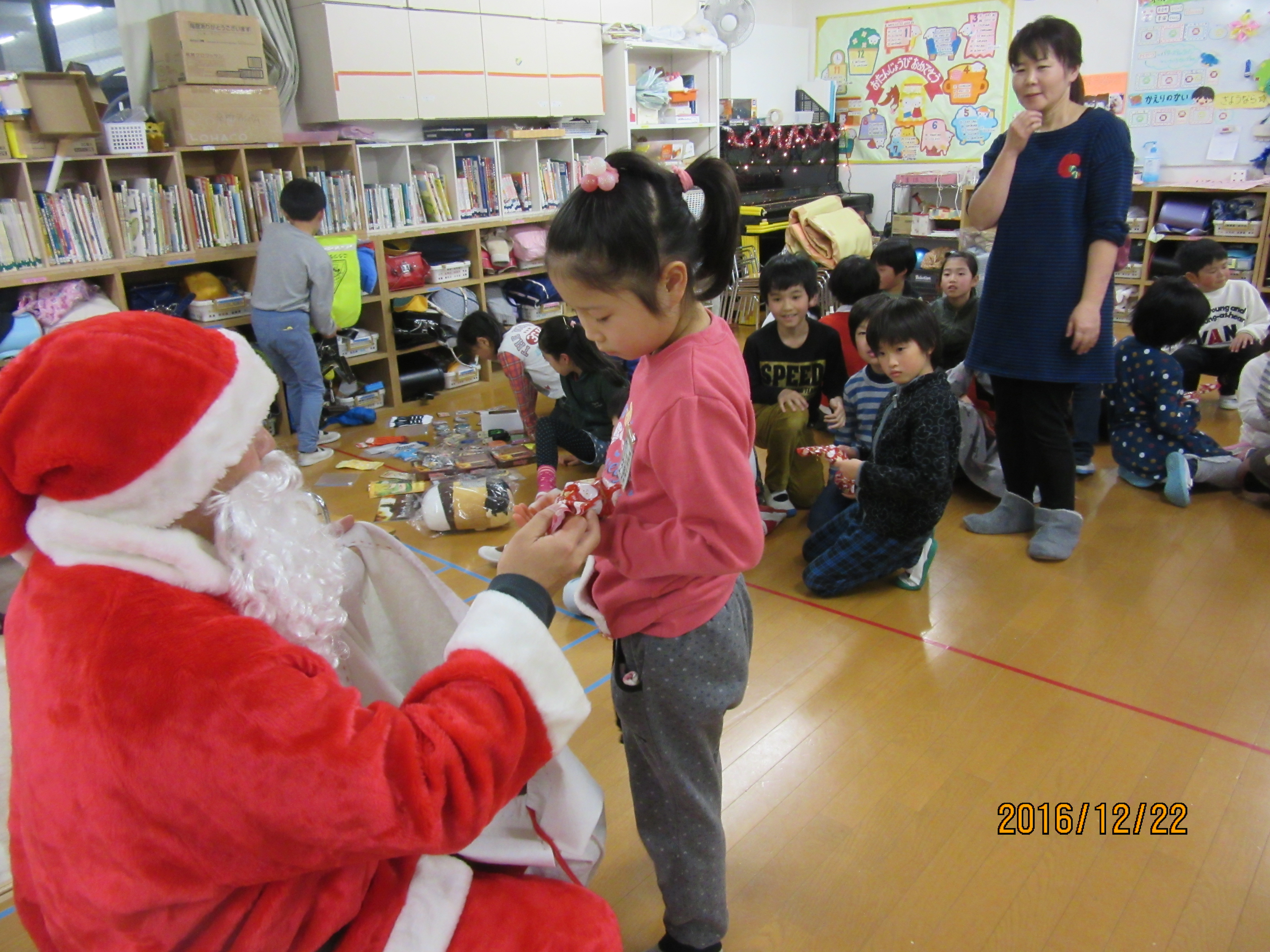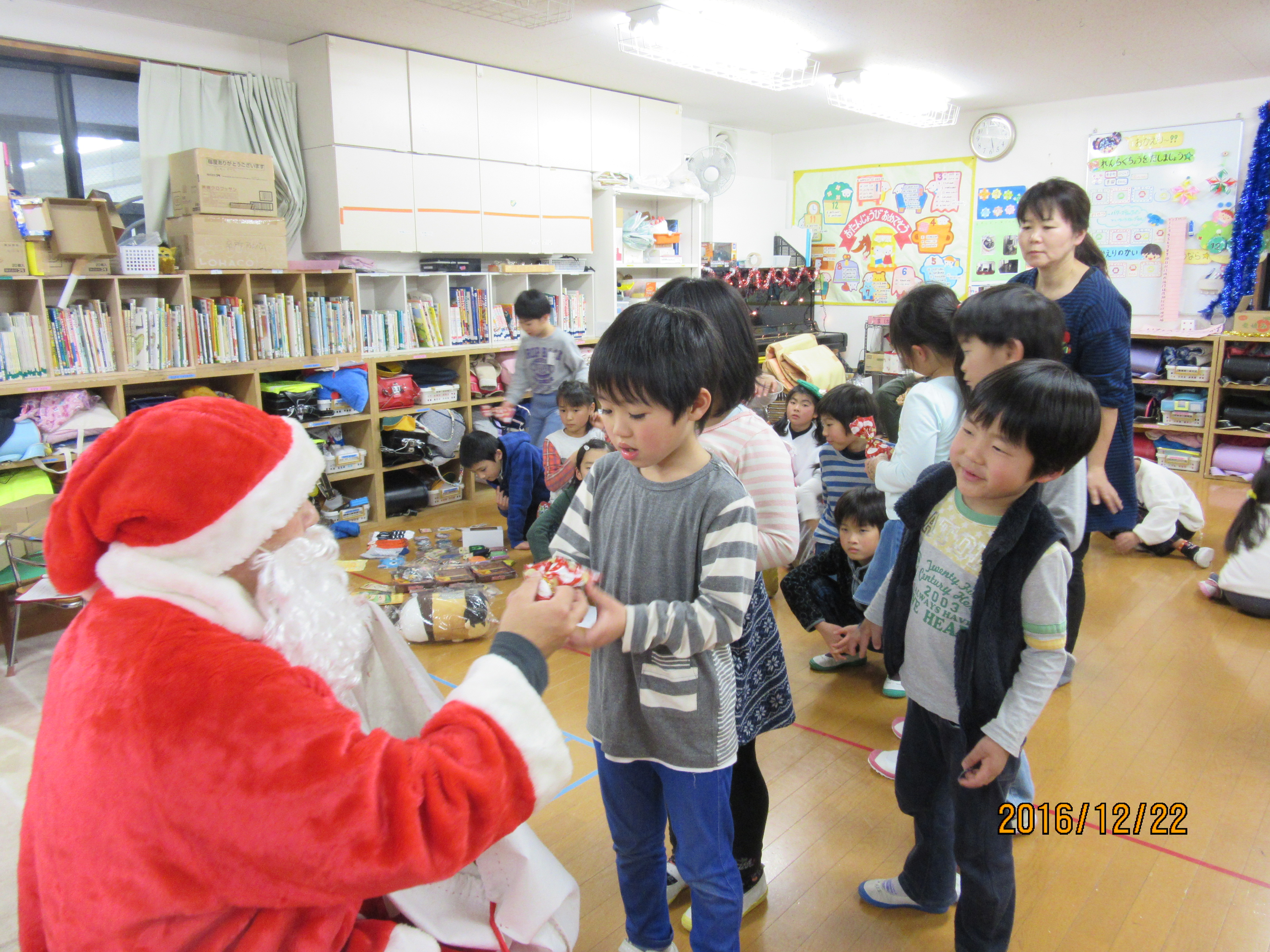 サンタさんがきたー!! クリスマス会にサンタさんがプレゼントを持ってきてくれました♪様々な質問が飛び交いましたよ〜((*´∀`*)) サンタさんの招待は誰なのかとあれやこれやと色々考えていましたが、プレゼントを貰う子ども達の表情は素直ですね〜♪皆うれしそうです! サンタさん、ありがとうございました!!