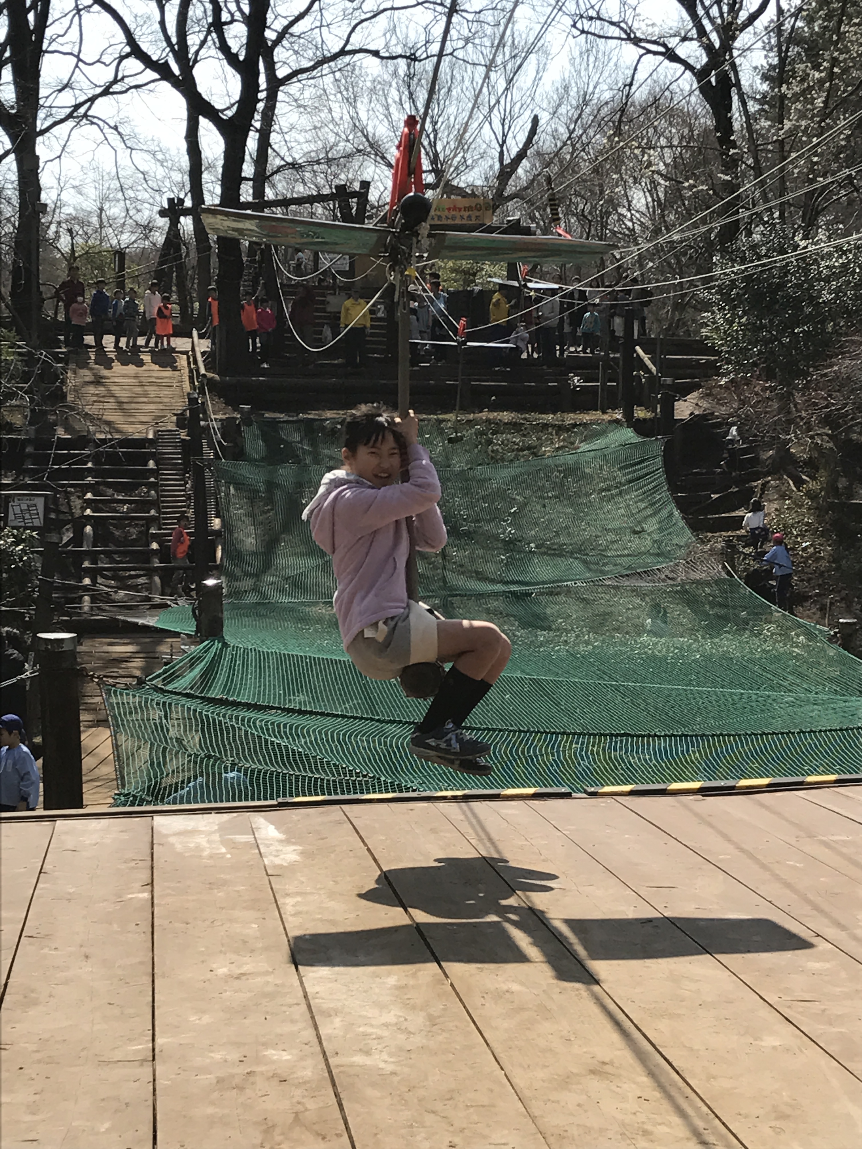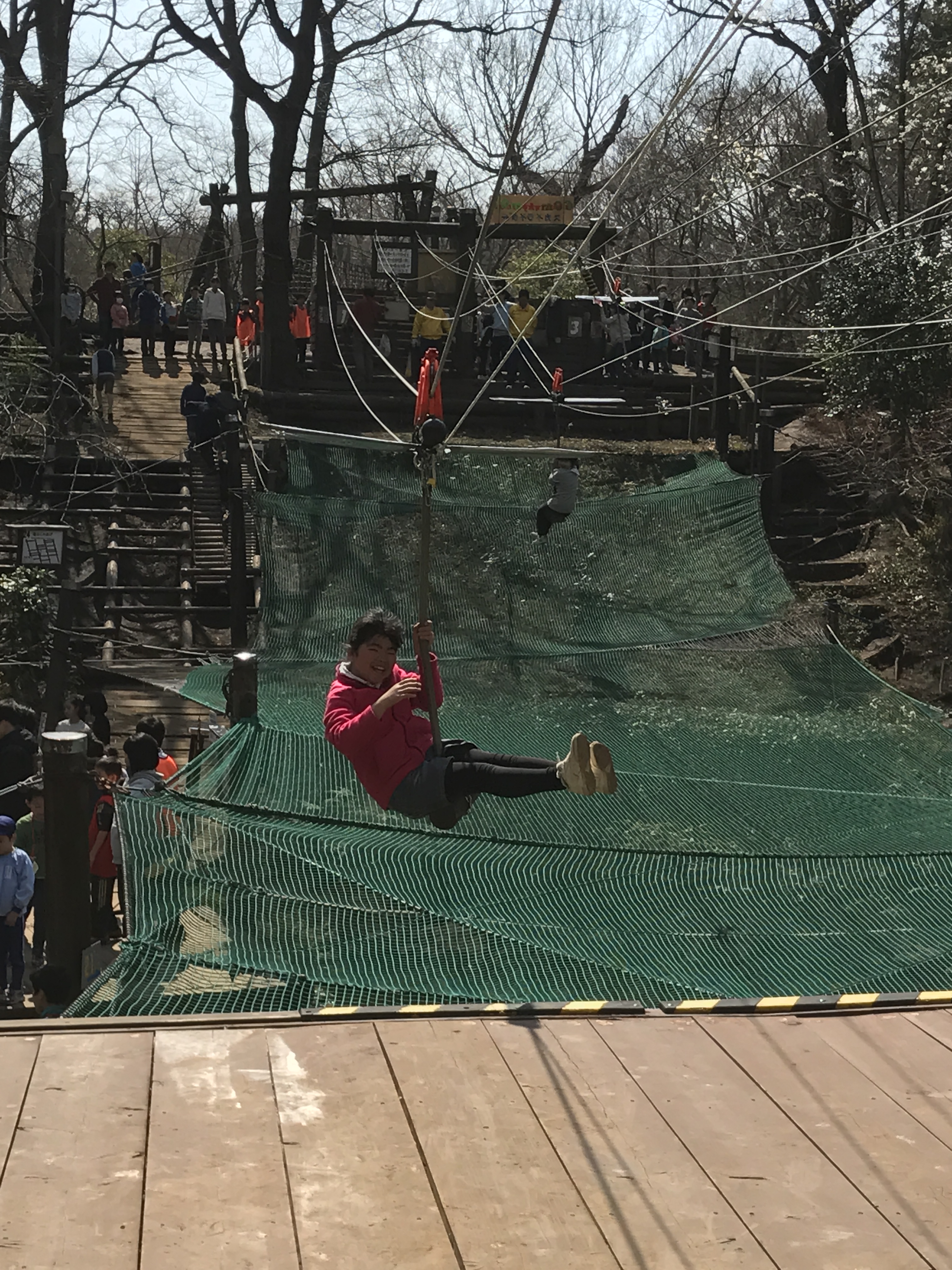 「スカイライダー」では、ターザンロープに掴まって、気持ちよく風を切って移動♪あまりの楽しさに笑いが止まりません(笑)