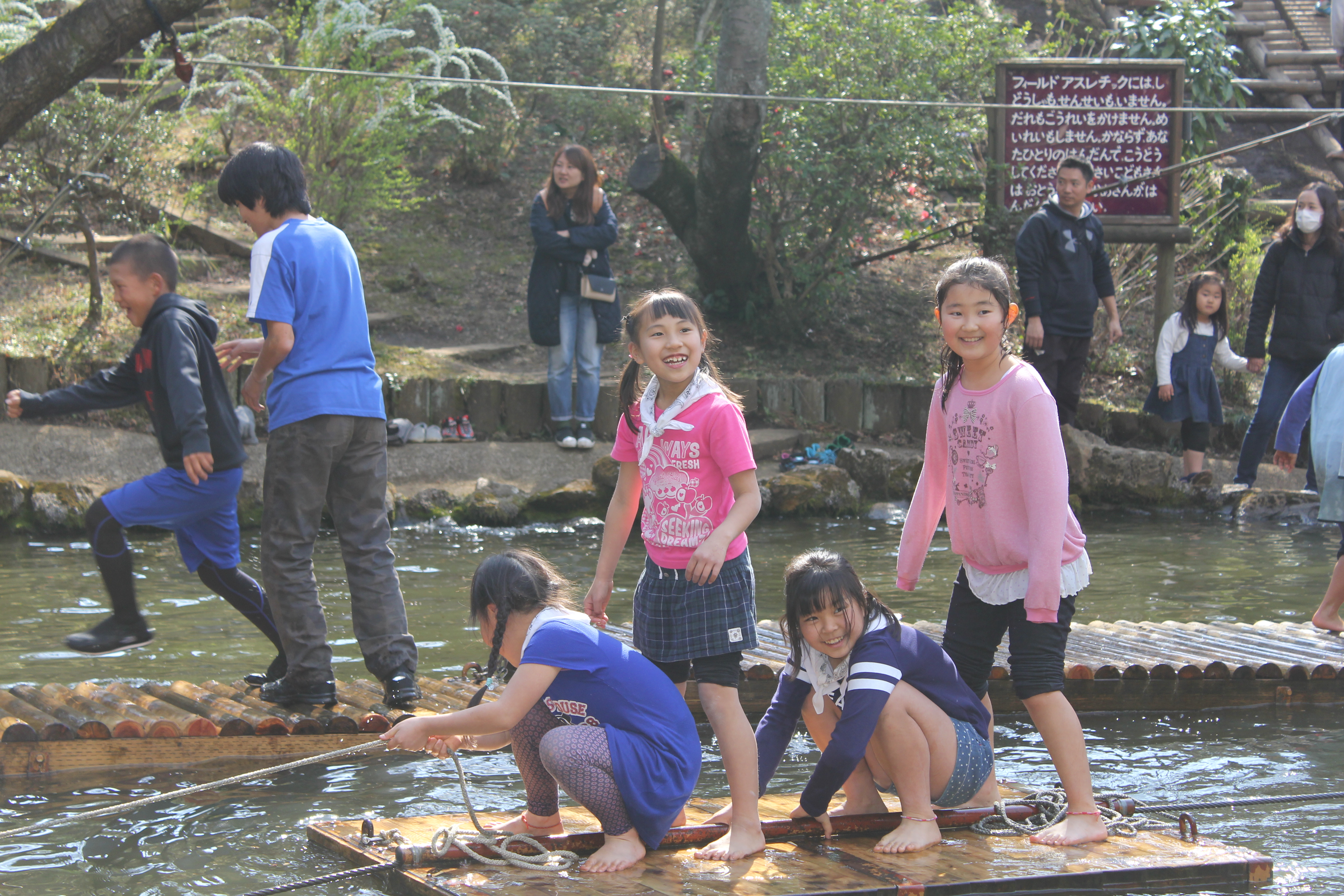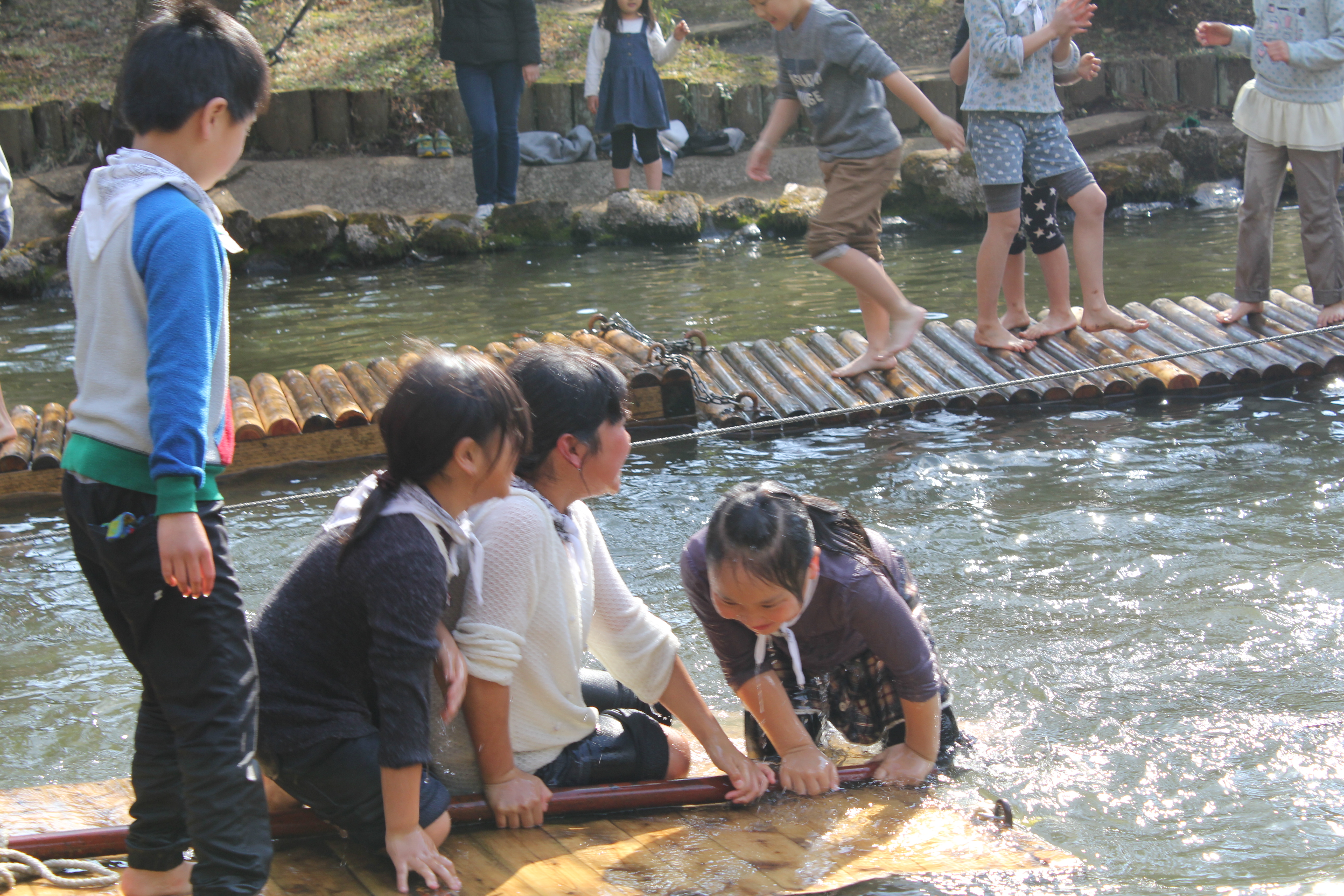 「水場アスレチック」では、いかだに乗って一生懸命ロープを使って移動するのですが、バランスを崩して池にポチャ!この瞬間を待ってましたといわんばかりに見ていた子ども達が大笑い( ´艸`)でも水遊びをするには少し早かったのか、着替えの時はぶるぶる震えながら着替えてました〜!風邪ひかなくて良かった(´∀`;)