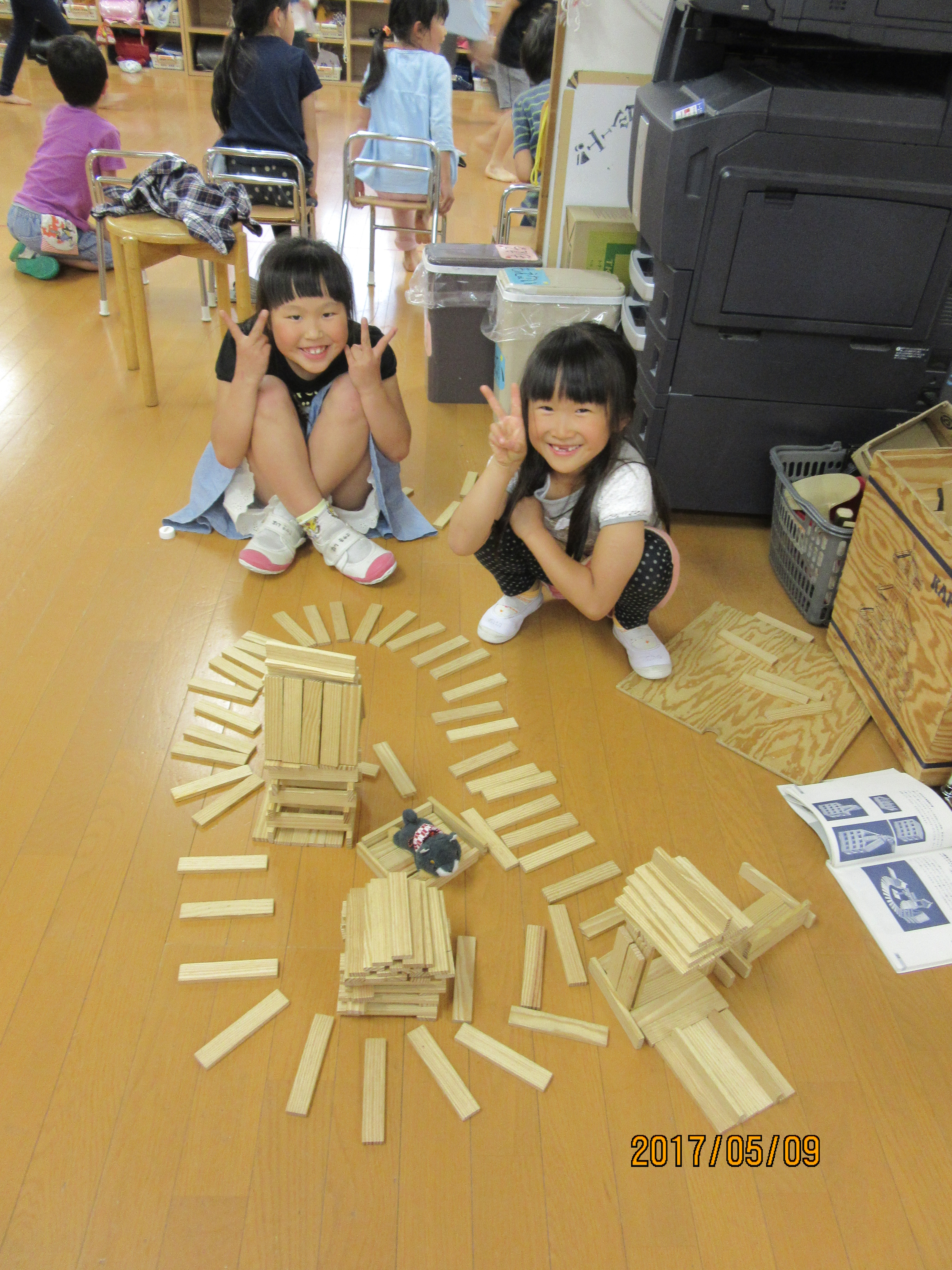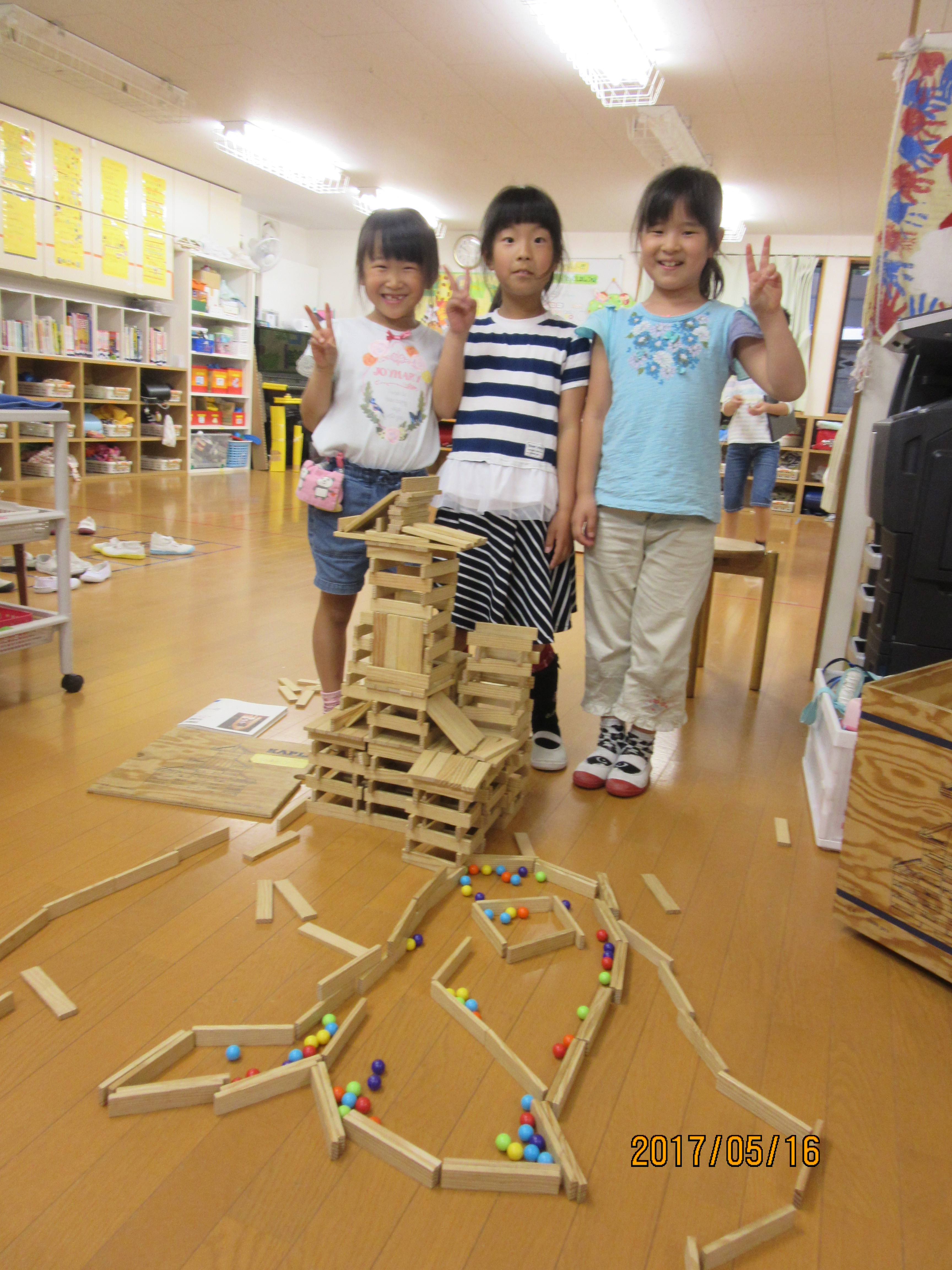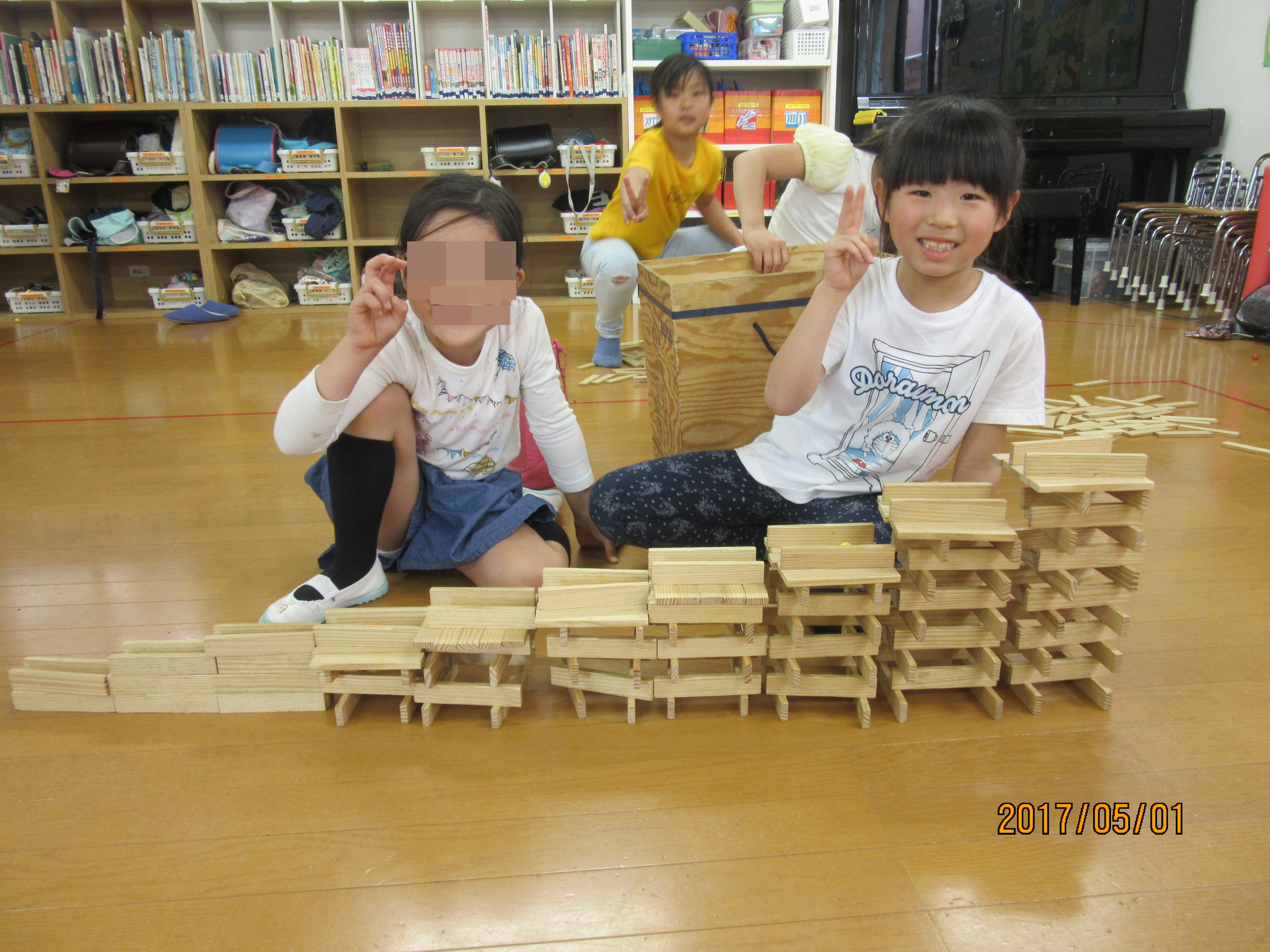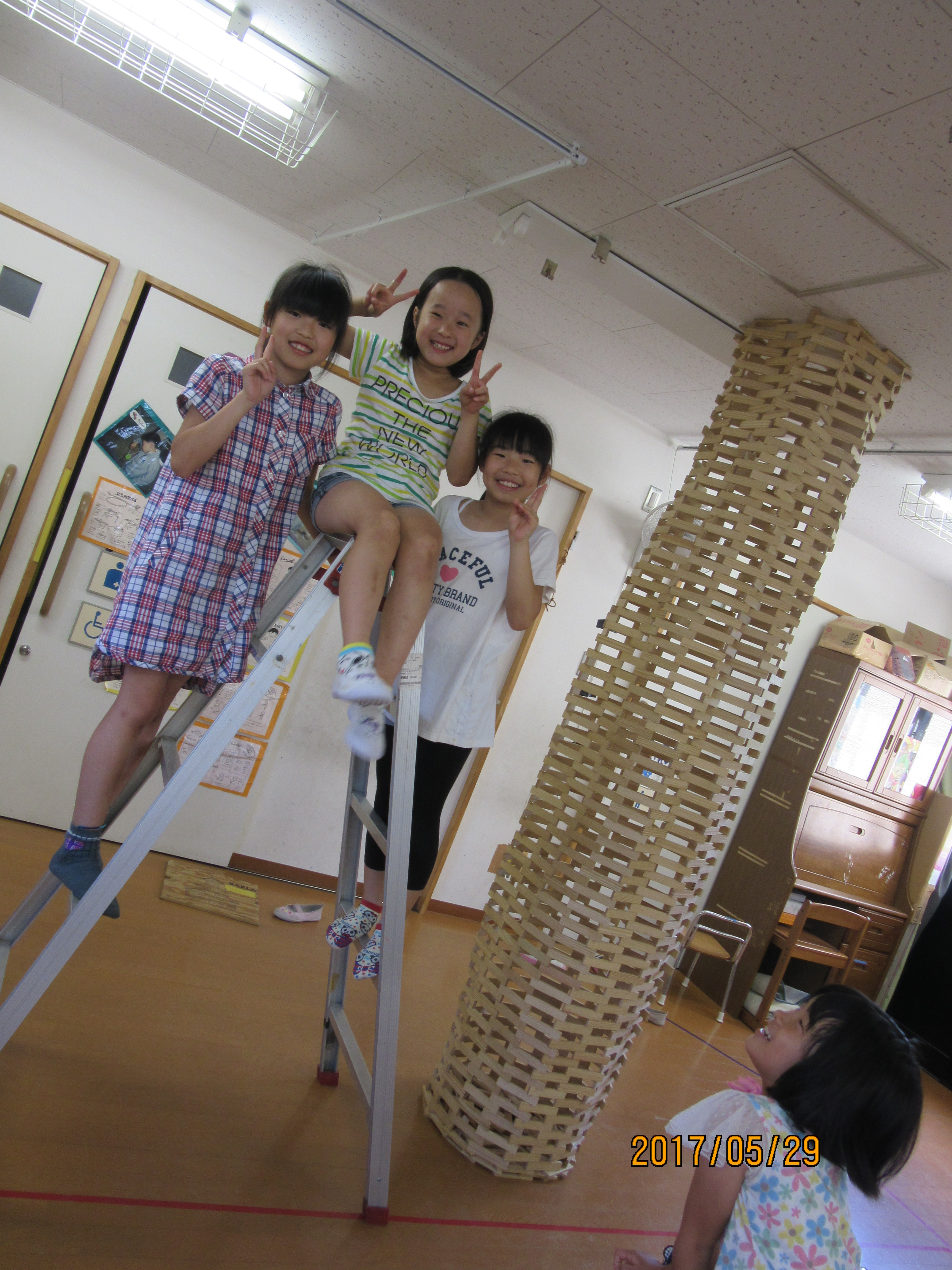 カプラ遊び♪ 1年生による、階段積み★ カプラは学童の人気の玩具の一つです(o^―^o) 木の素材で出来た小さい板は、色々な遊びに使うことが出来るんですよ★ 今日はそんなカプラのご紹介♪ 様々な作品が出来上がっています!ご覧下さい((*´∀`*)) 2年生になると、アートに挑戦♪ 3年生が加わると、町作りに発展★ 4年生になると、集中力を研ぎ澄ませます!これ、天井までびっちりついているんですよ〜( ´艸`)