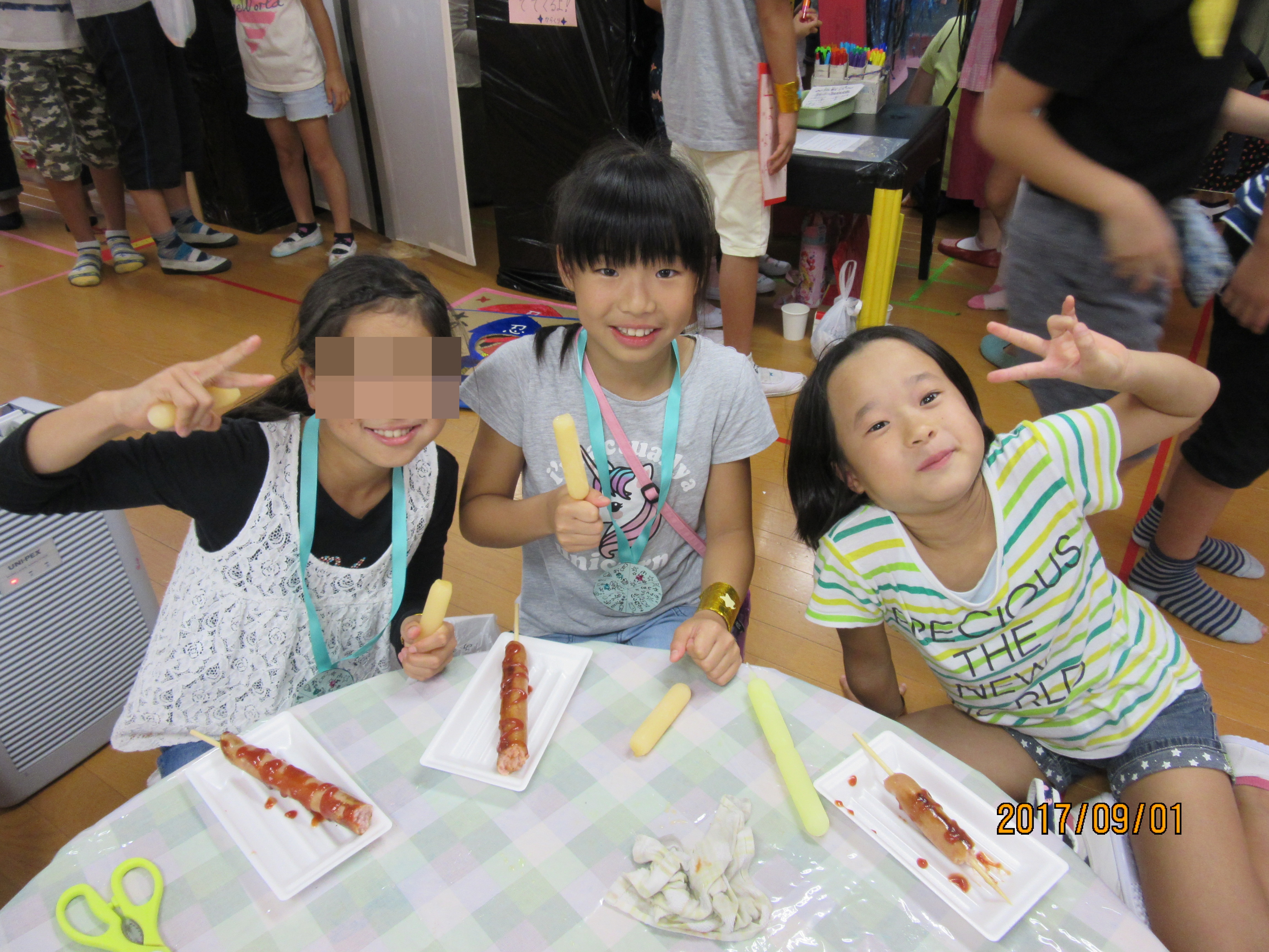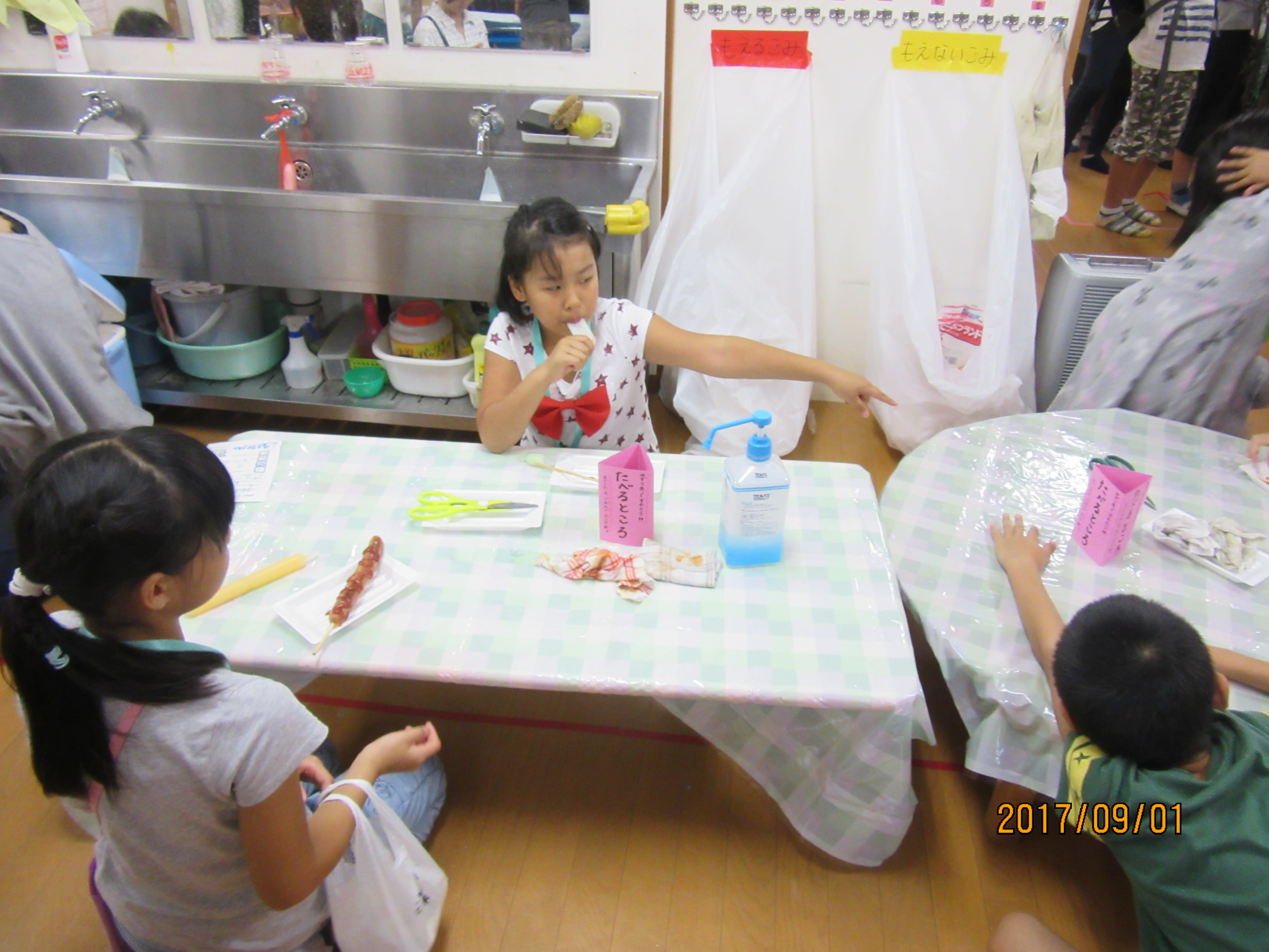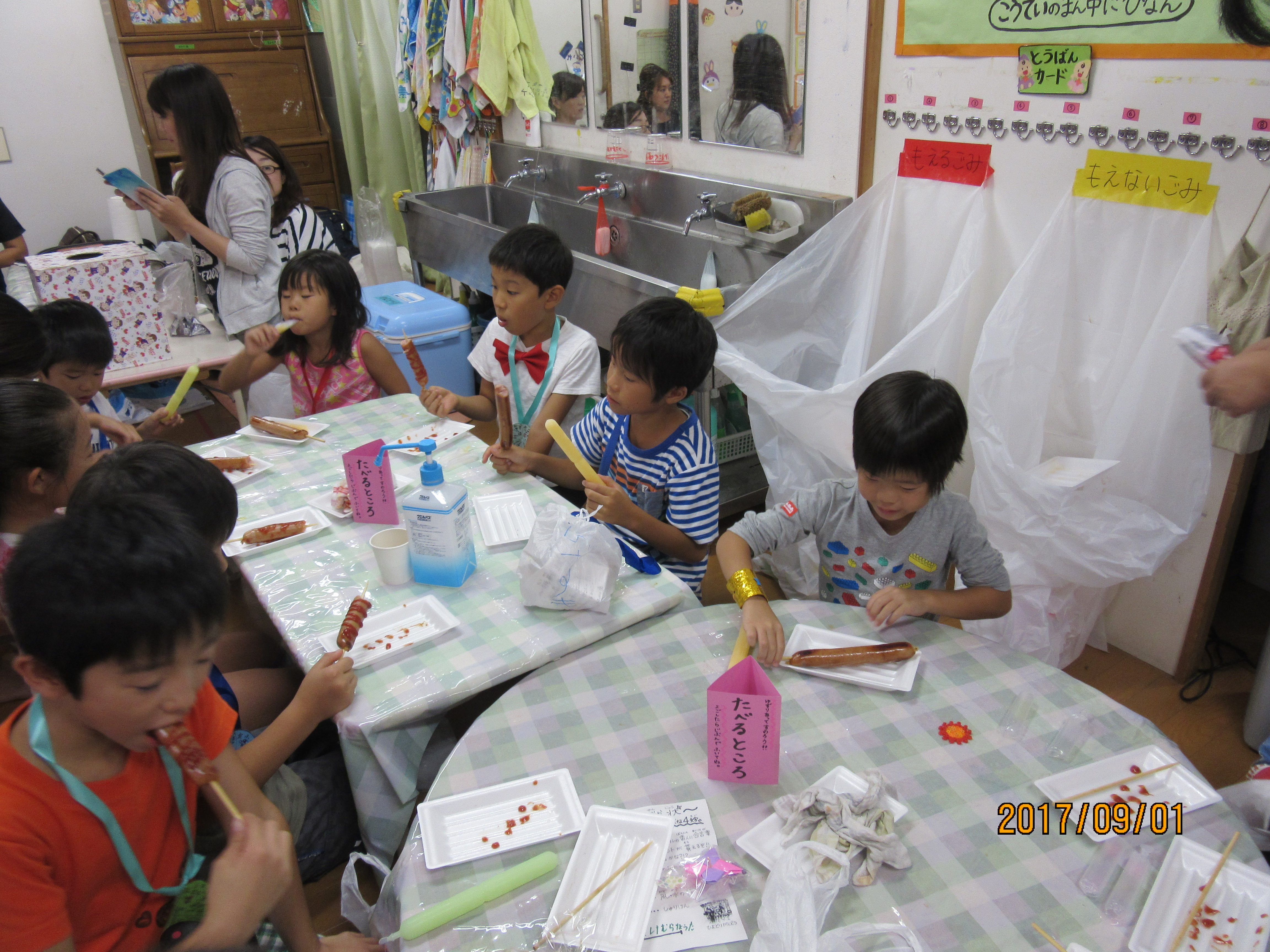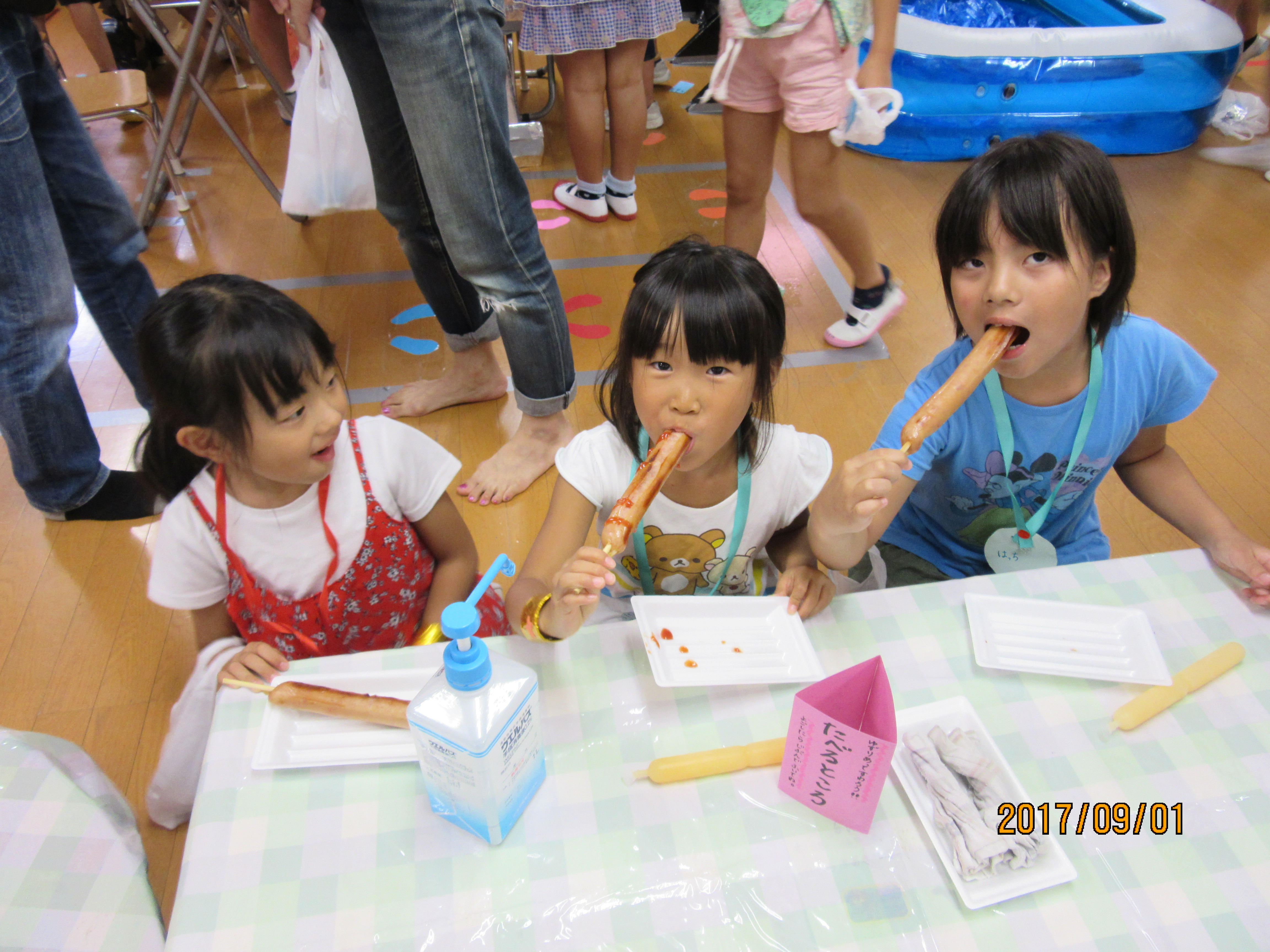 えんにち会・おやつ編 大きい口でいただきま〜す♪ 毎年恒例となったえんにち会のおやつ♪ フランクフルトにチューペットは子ども達の大好物! でもフランクフルトが大きくて、嬉しいけどお腹いっぱいになりすぎるという現象が毎年…(´∀`;) そろそろおやつ内容も変えてみないとなと思っている先生達なのでした★ 混雑時のお食事処♪ 空いてる時を狙ってきました♪ お姉さん達もご満悦♪