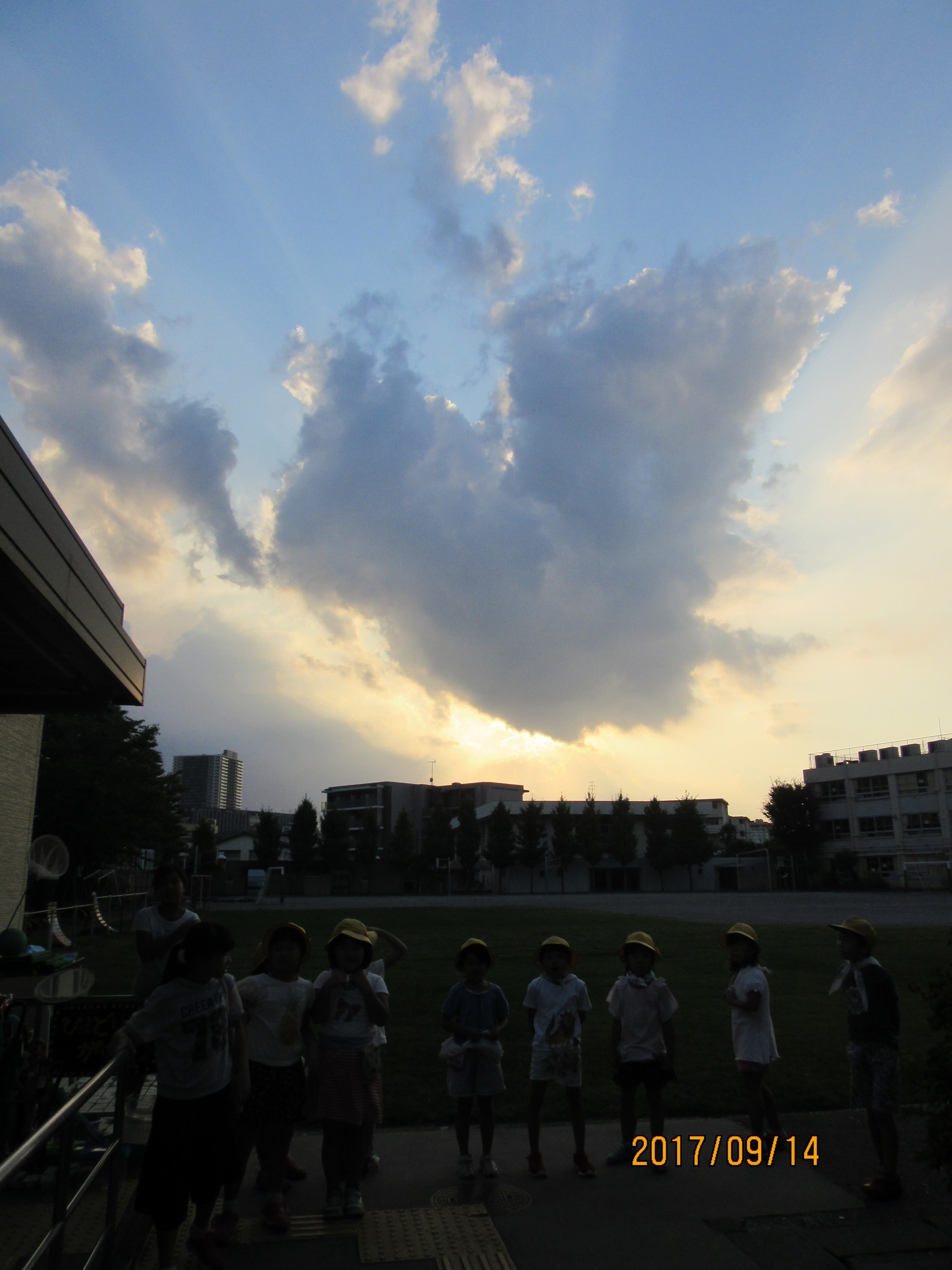 ハート雲♪ わかりますか?ハートの形♪ 最近、日が短くなって、 子ども達が学童にいる時間帯にとってもきれいな夕焼けが見えるので、 キレイな夕焼けを見ようと毎日のように校庭遊びが終わると空を見る子ども達。 今日は、空を見上げると立派なハートの形をした雲が…! それを発見すると、急いで中にいる先生を呼び、 「ねぇねぇ!!見て見て!!ハートの雲!!!!」 とものすごい勢い(笑) その勢いに負けて、先生が外に出てみると、本当に立派なハート雲♪ 思わず記念写真を撮ったのですが、逆光で子ども達の顔が映らず…(笑) ごめん・・・(笑)