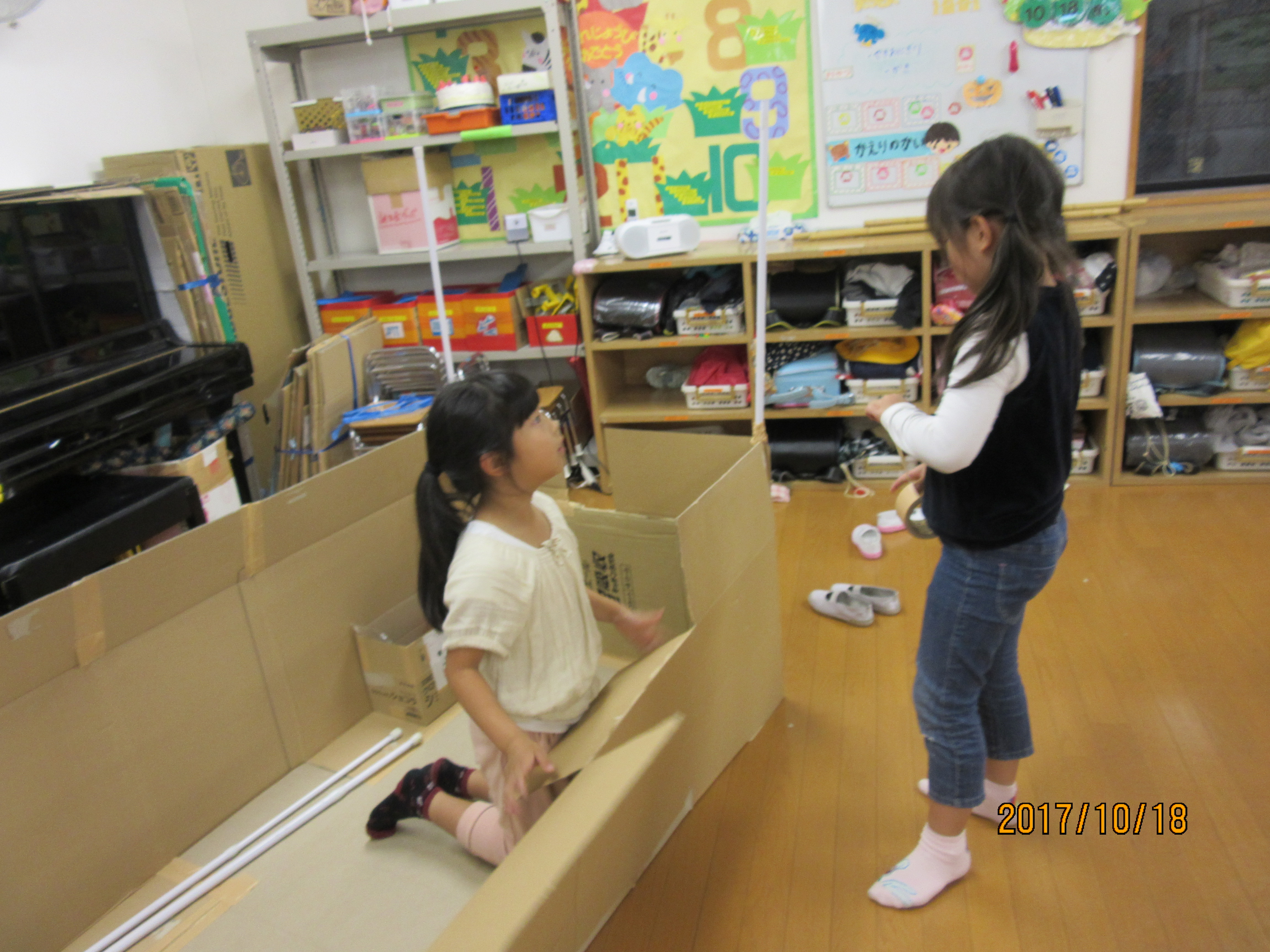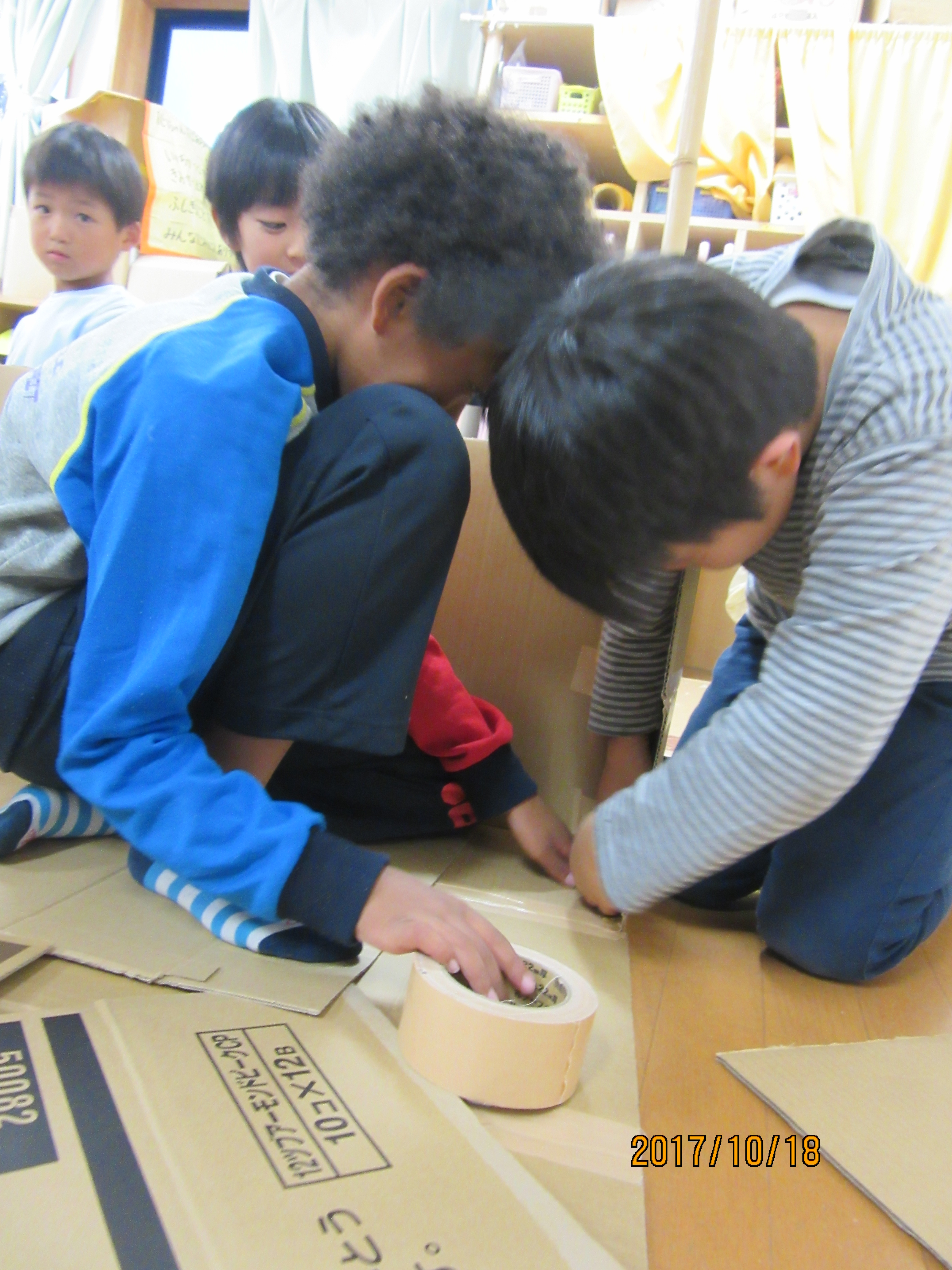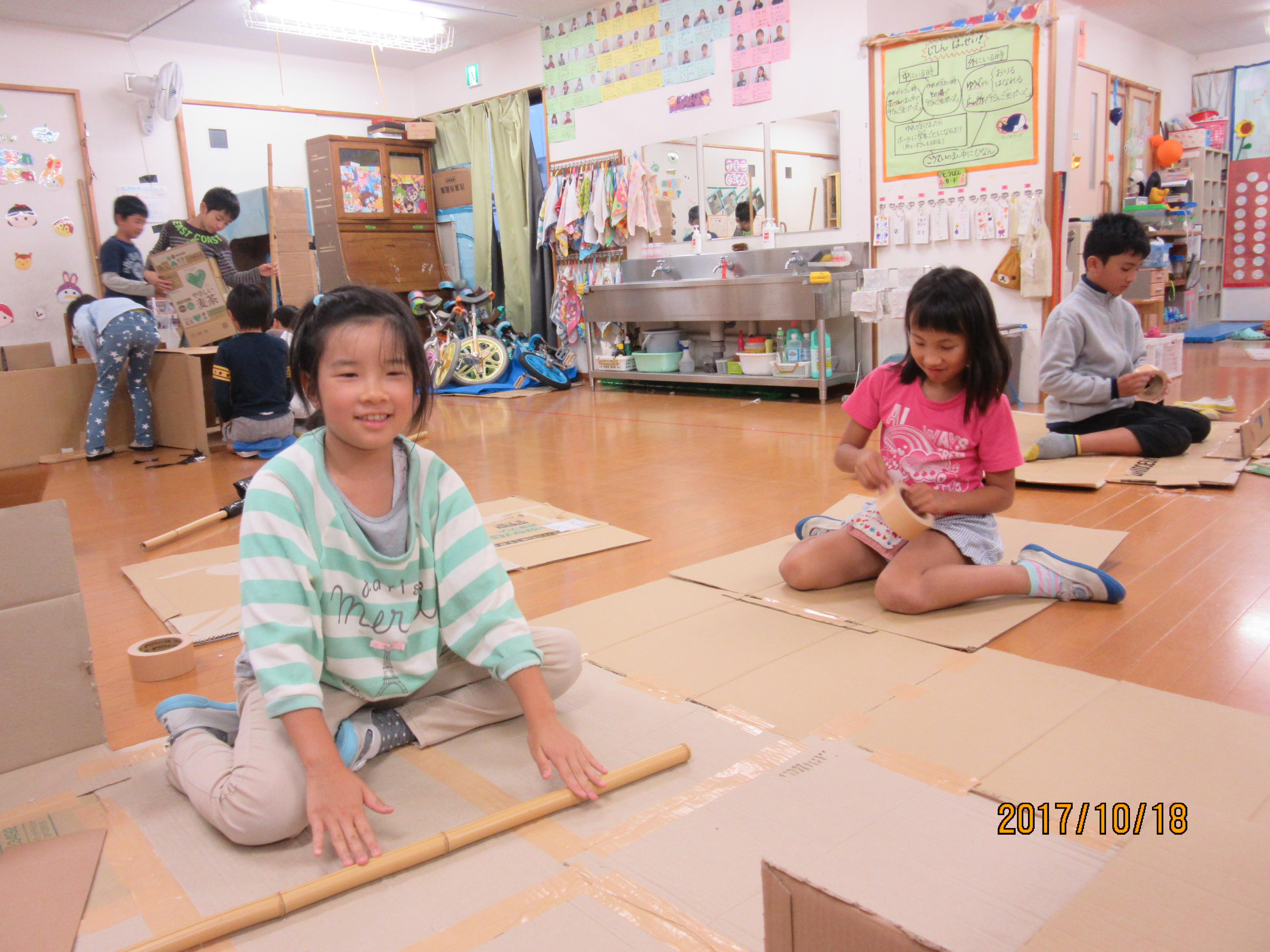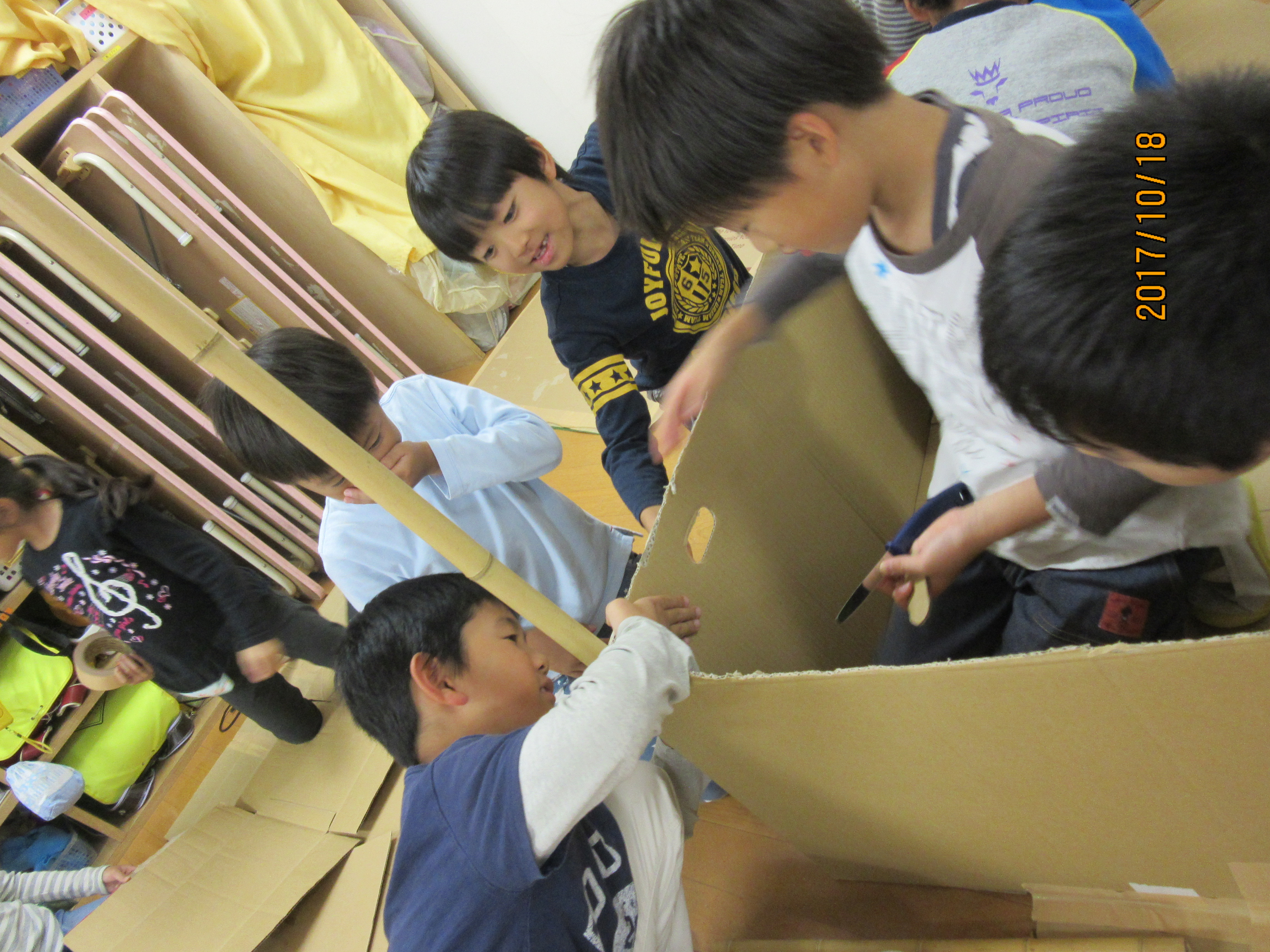 少しずつ完成に近づくダンボールハウスを見て、ボルテージが上がっていってました〜!