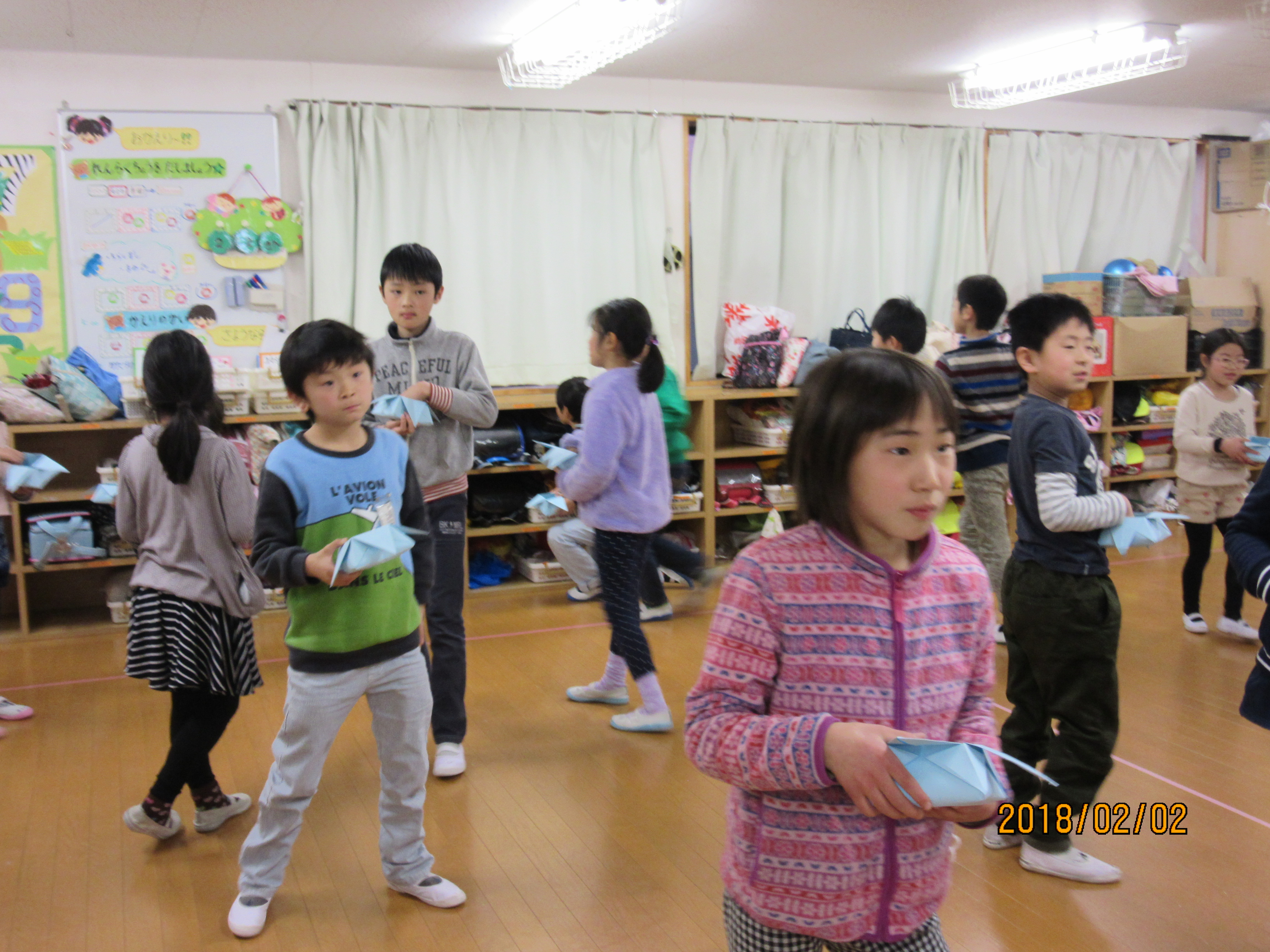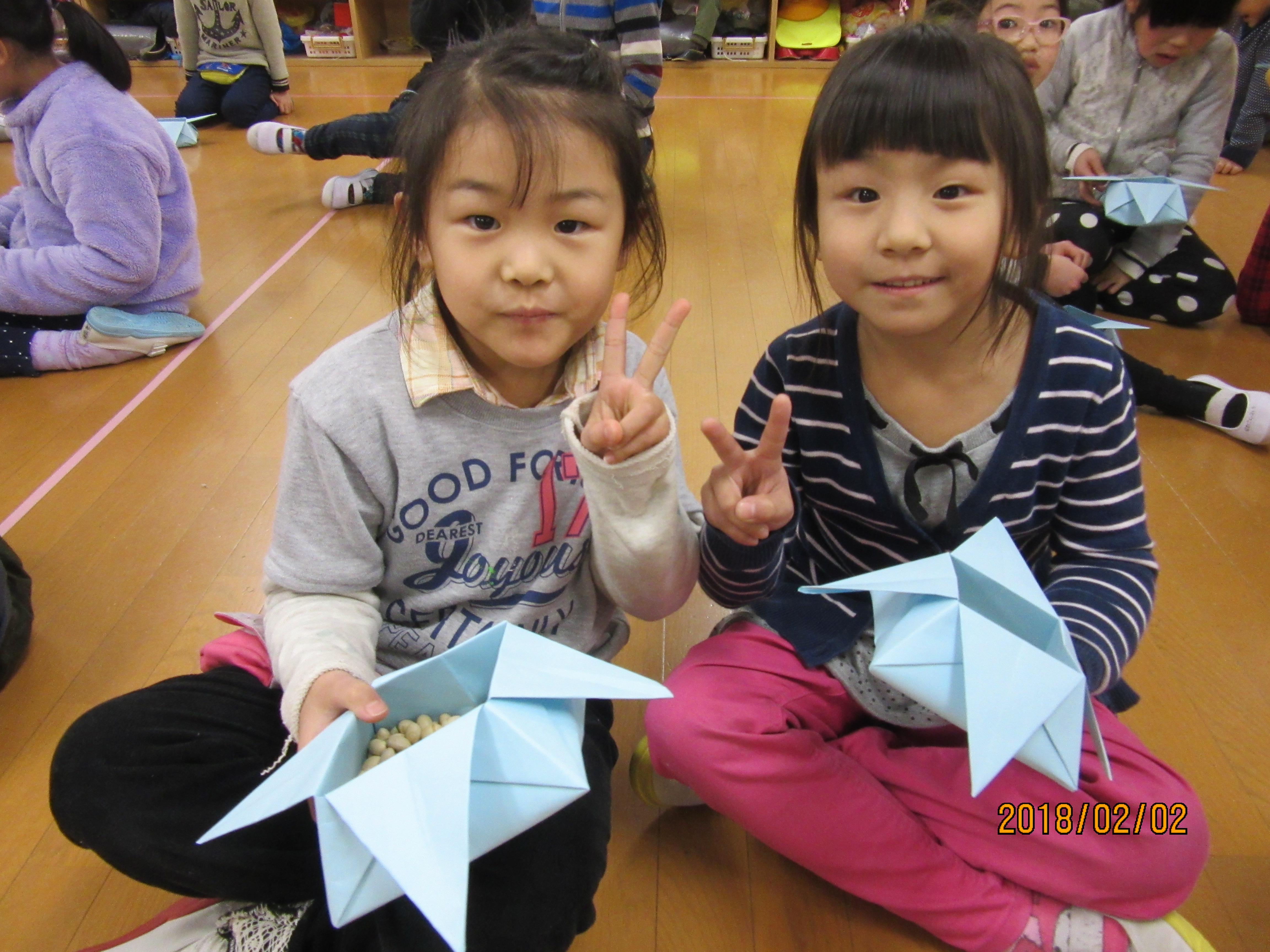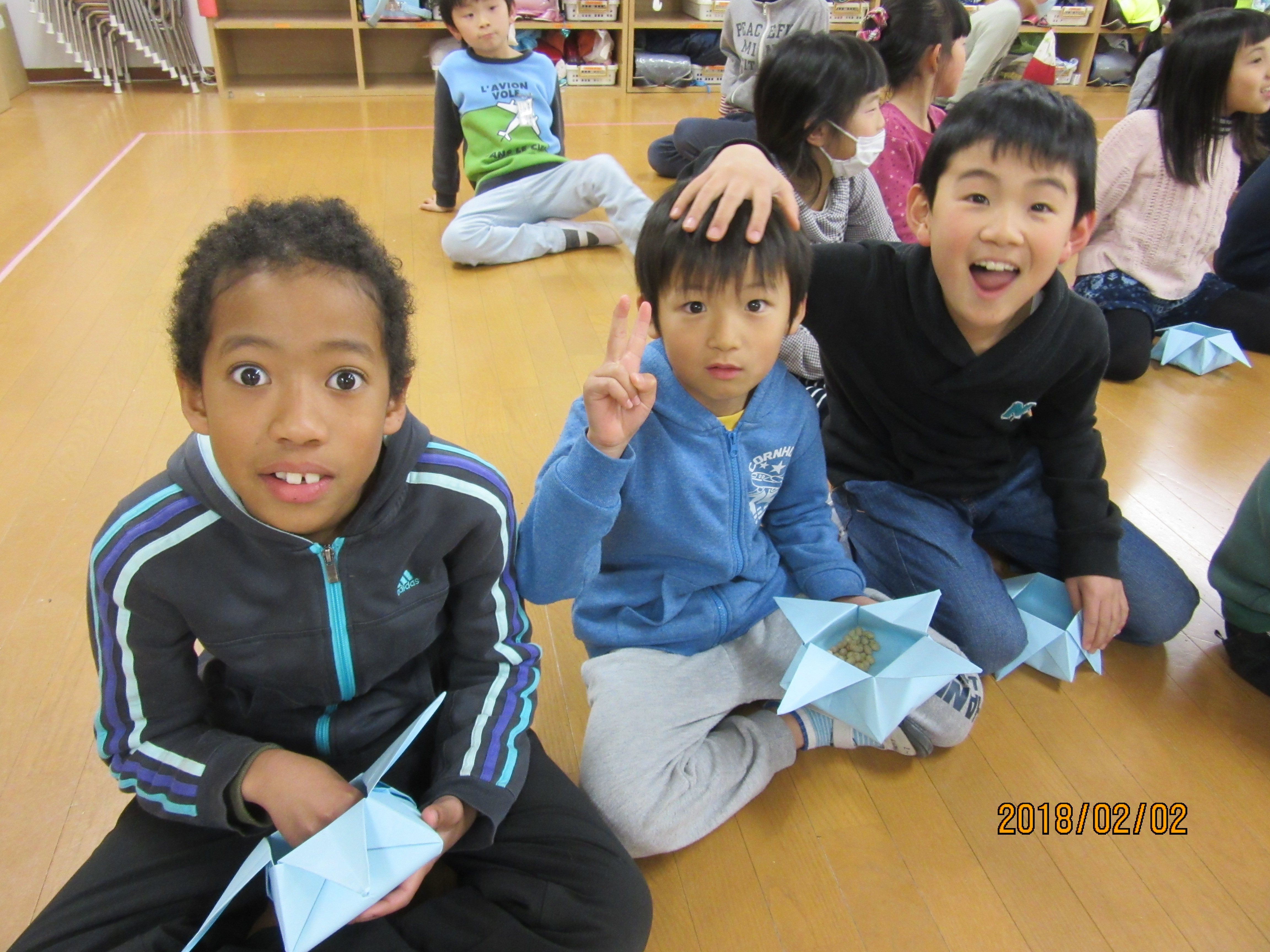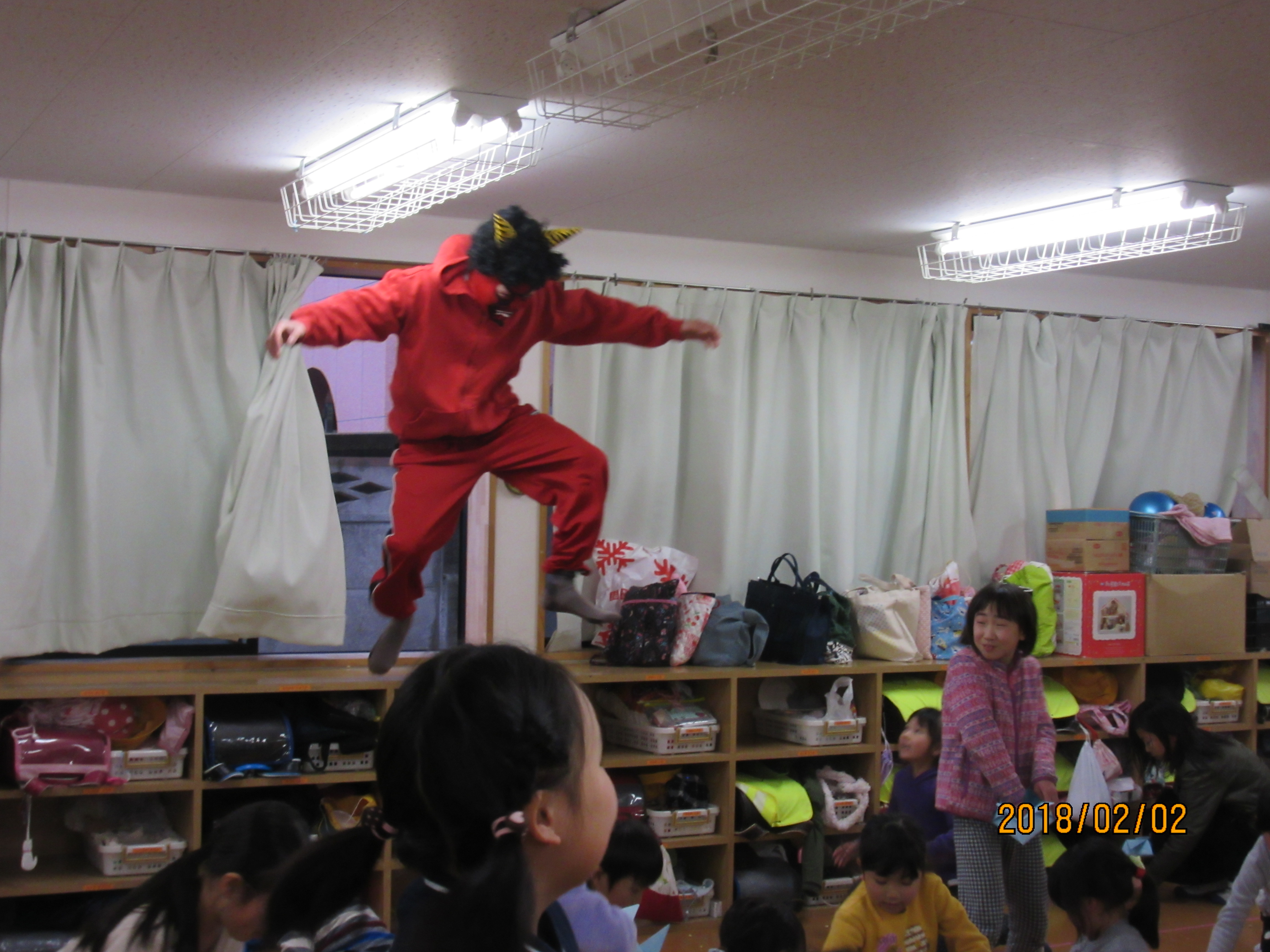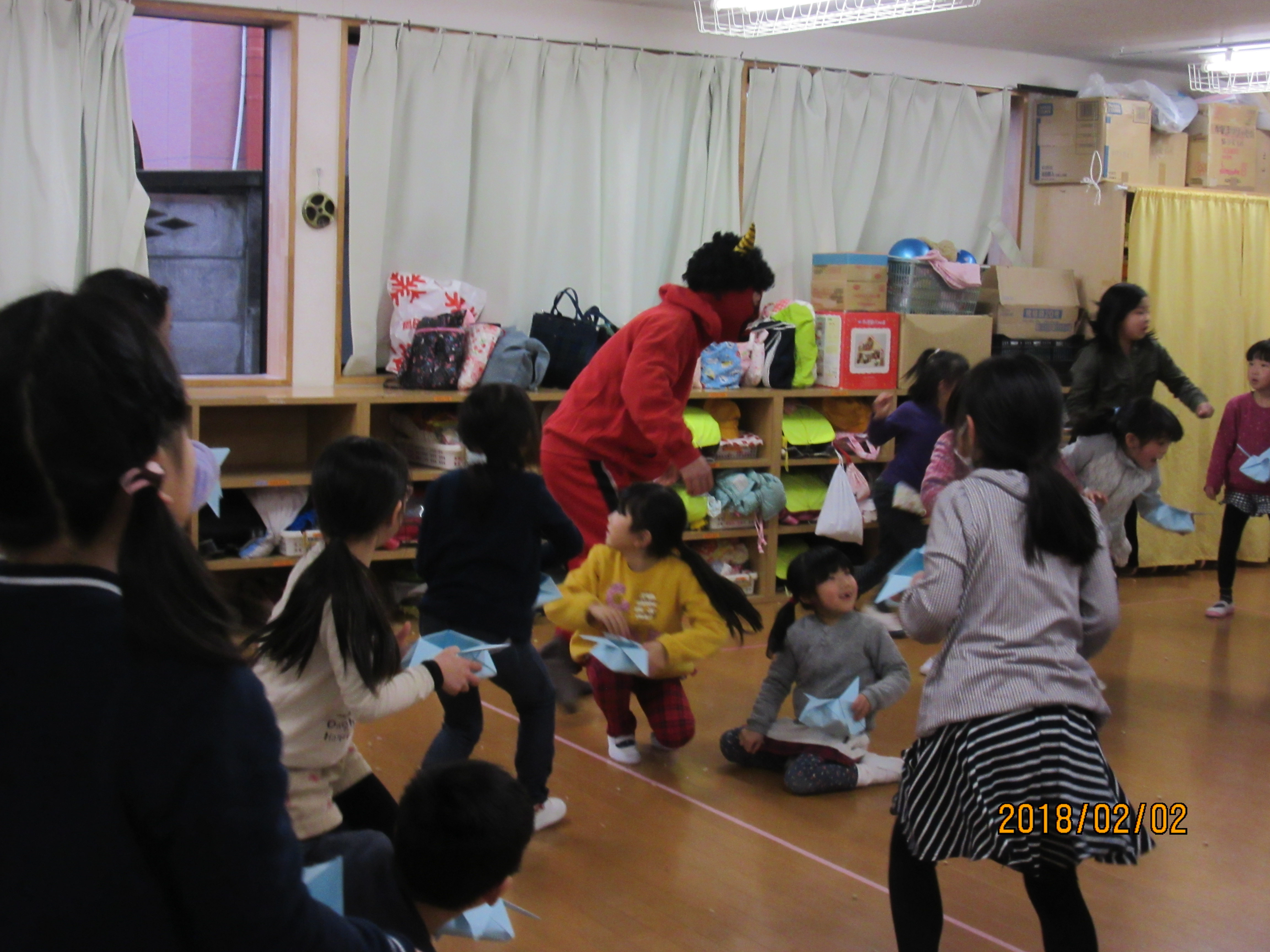 節分♪ 鬼を倒すぞー! と意気込む子も居れば、 今年も怖い鬼来るの?どこから来るの? と少し怖がりながらも 気になる様子の子もいたりで そんな中、豆まきスタート!! 最初は普通に豆まき… すると突然!! 窓から鬼が来たー!!!!! やっつけろー!!! 必死に豆をぶつける子ども達の中に 必死に走って逃げる子ども達もいて 騒然となりました(笑) 無事に鬼はひよどりから出て行って 退治できました♪ めでたし、めでたし( ´艸`)