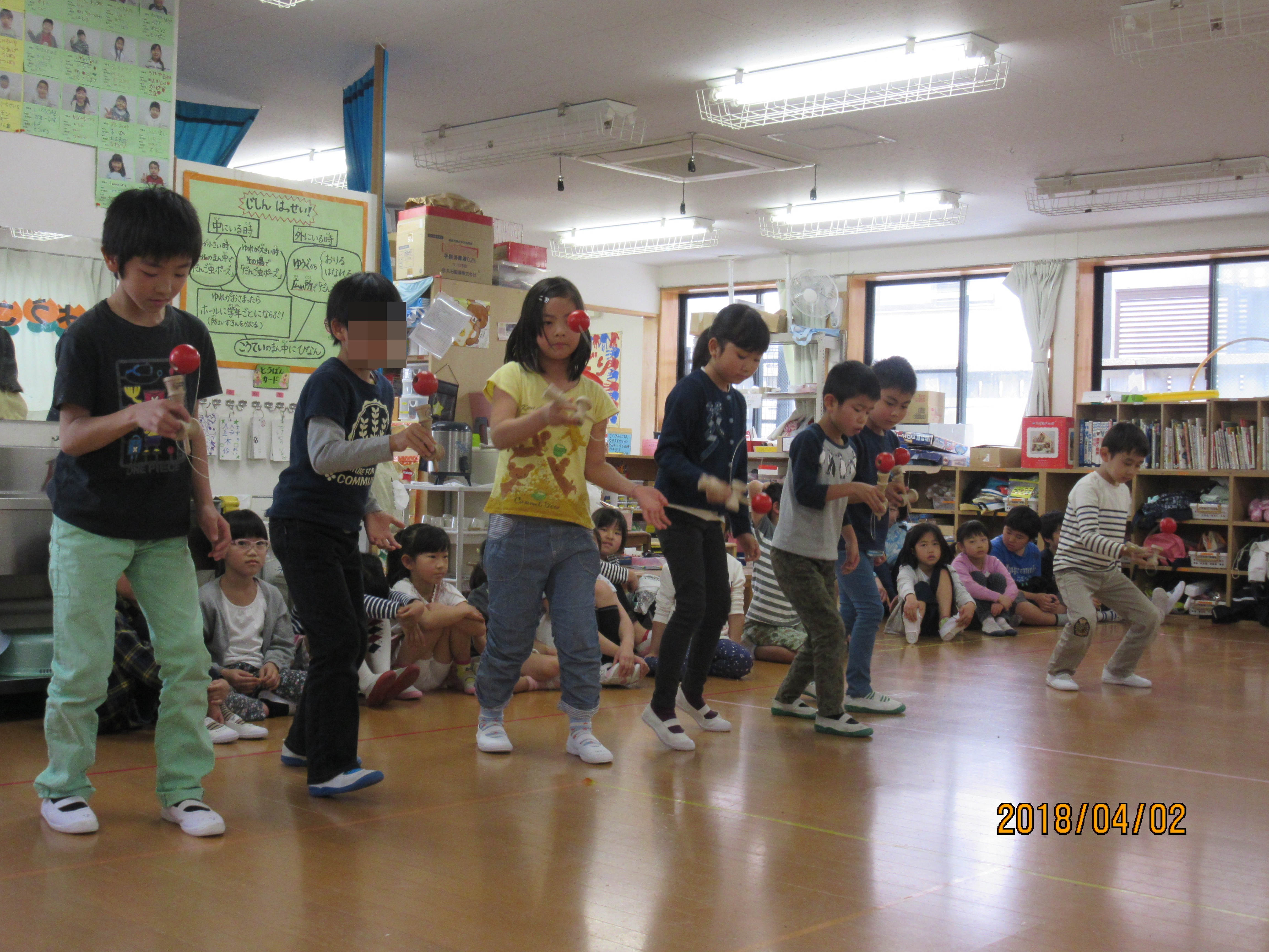 新しい友達を迎える会♪ お別れがあった後には すぐに出会いが待っています! 新年度を迎えて 新しい友達を迎えるために 在所生で色々と準備をしてきました♪ 自己紹介立派に出来ました!! 学童のことを少しでも知ってほしい 緊張しているのを少しでも和らげたい 色々な思いで 上級生たちが優しく出迎えてくれました(*゜ー゜) ダブルダッチ♪ 学童で培った遊びの技を披露すると 1年生の目は輝きます♪ こうして上の子から下の子へ ひよどり学童の意志が引き継がれていくのですね♪ けん玉♪
