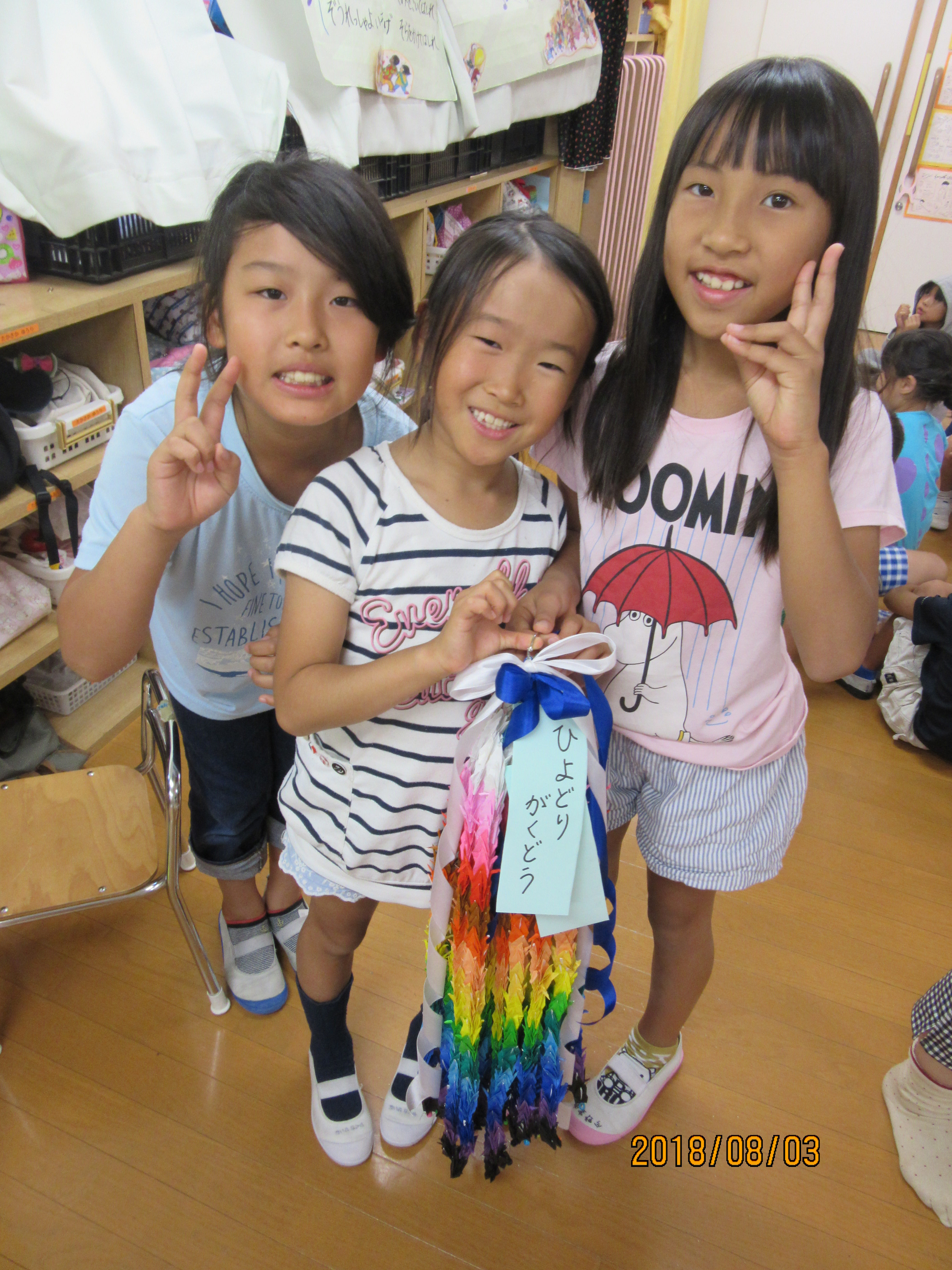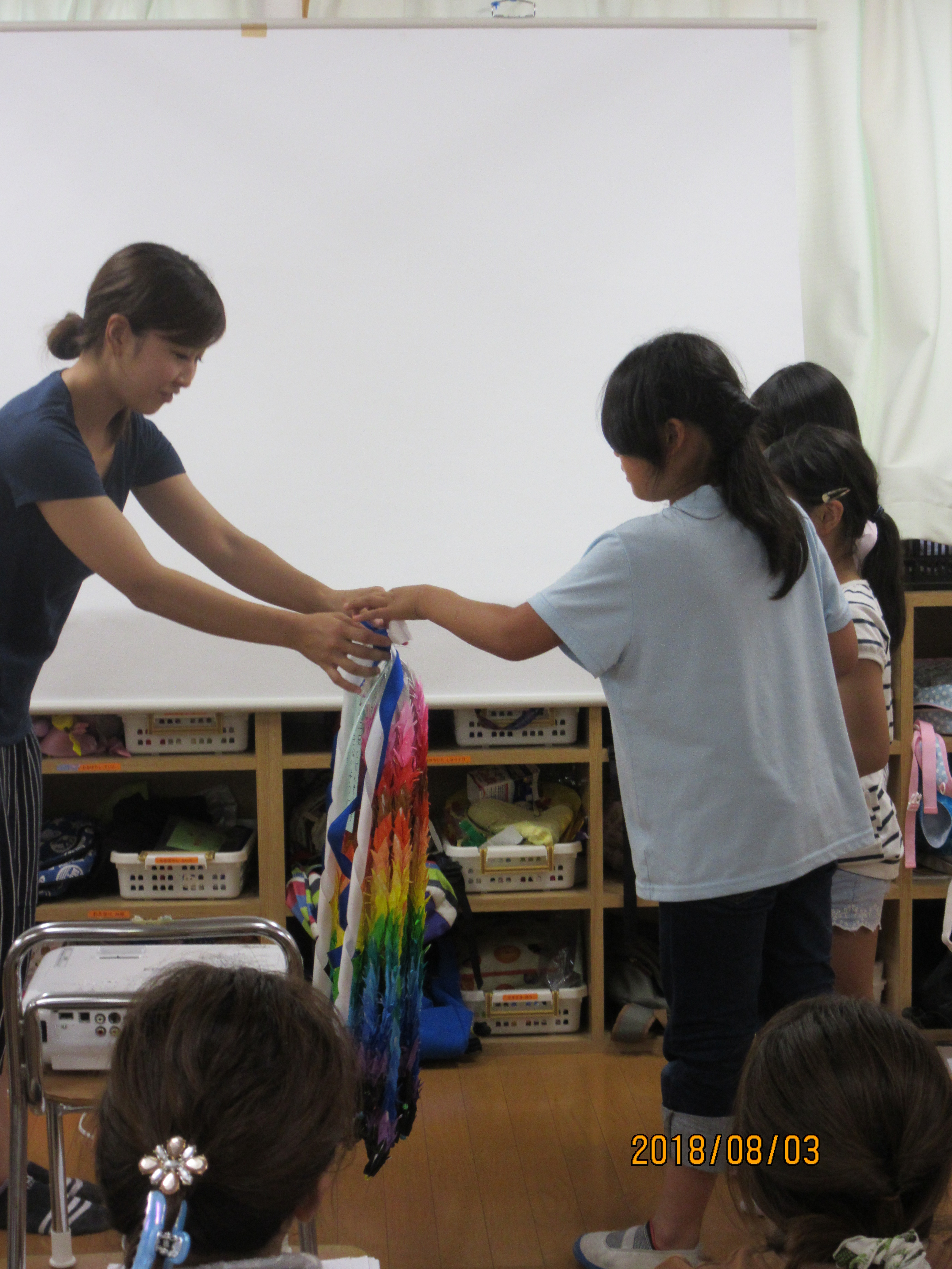 平和の取り組み♪ 平和パーソナリティの3人! 今年も平和への願いを込めて 千羽鶴を皆でおりました。 この思いが込められた千羽鶴を 届けてくれるのは、 つばさ学童のあつみ先生! あつみ先生に千羽鶴を渡す『いってらっしゃい会』 今年の平和パーソナリティはこの3人! みんなの思いを代表であつみ先生に渡しました(´▽`) 立派につとめてくれました♪