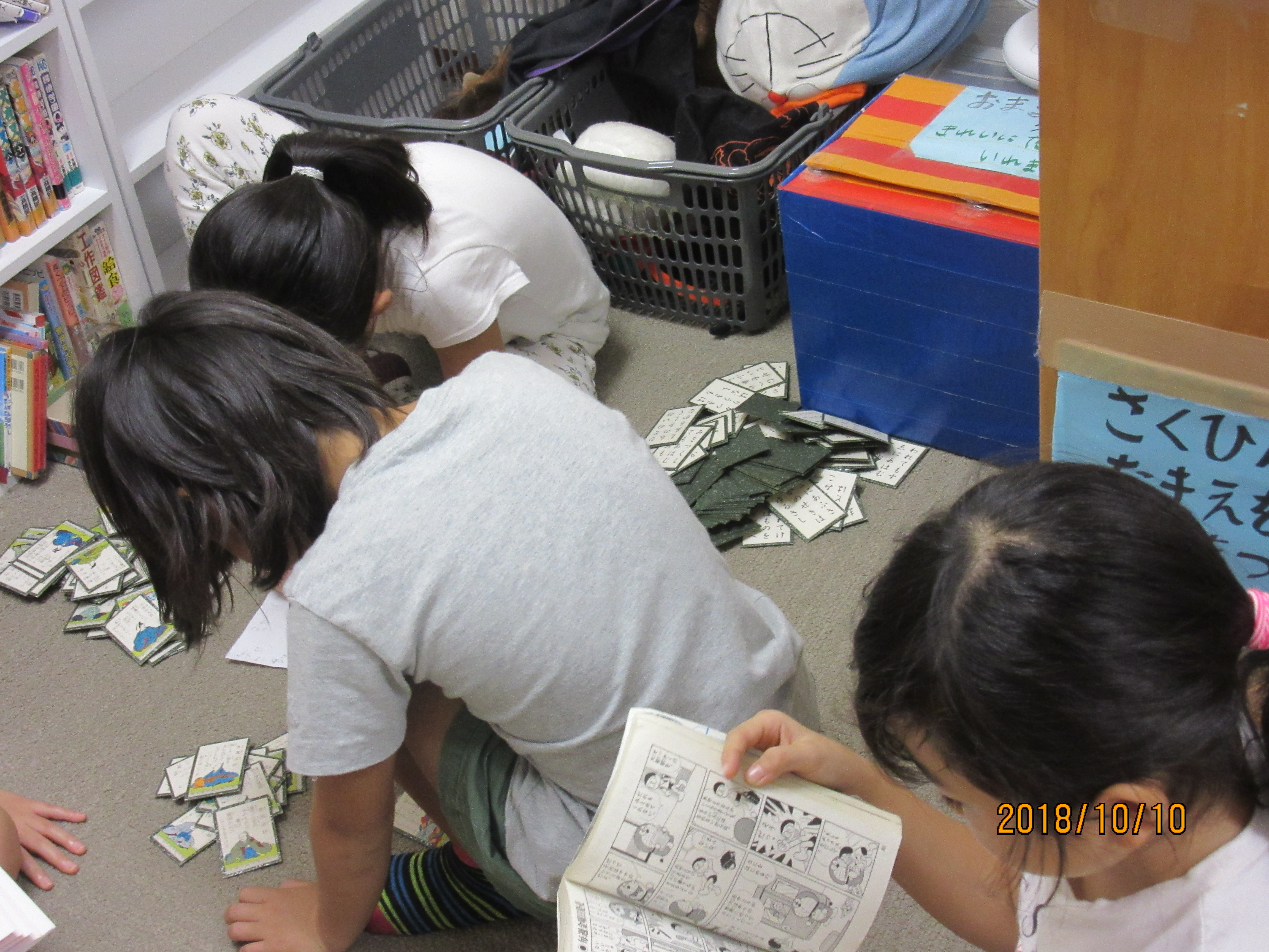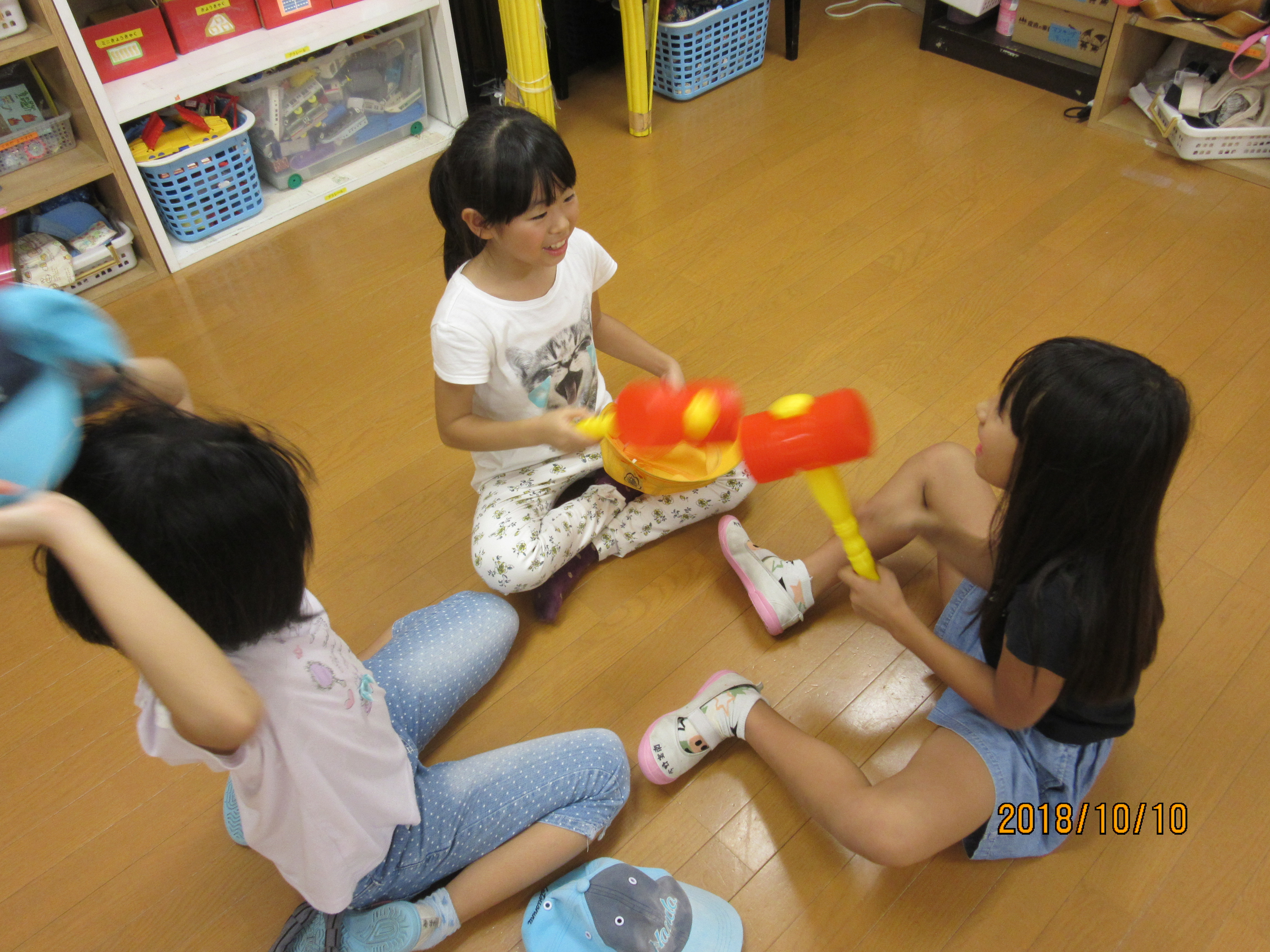 10月日常♪ ドレスを作りました♪モデルとデザイナーの皆さん★ 秋は芸術の秋!♪ というのは学童では関係なくて、 子どもたちはいつも自分達の思い思いのことをして楽しんでいます( ´艸`) もちろん芸術的な遊びをしている子もいますよー!! プラバンもひと手間加えれば立派な売り物になりますね♪ 読書の秋! こちらは秋に関係なく「たたいてかぶってジャンケンポン」!でも3人って難しくない?(笑) 1年生が作ったとは思えないほどのクオリティの高さ!!見事です★