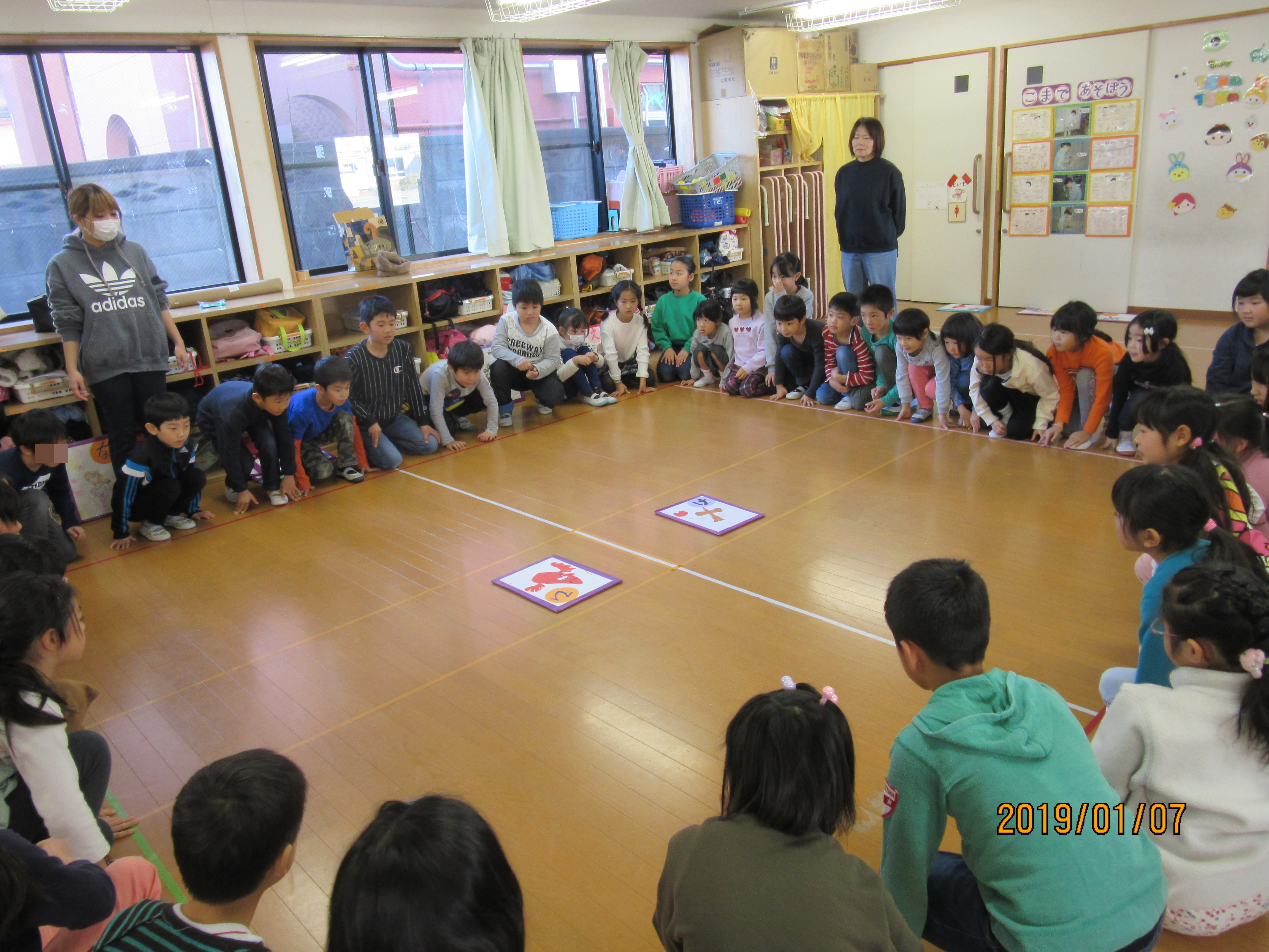 大きなカルタをホールに敷き詰め、それを皆で取り合うゲーム♪