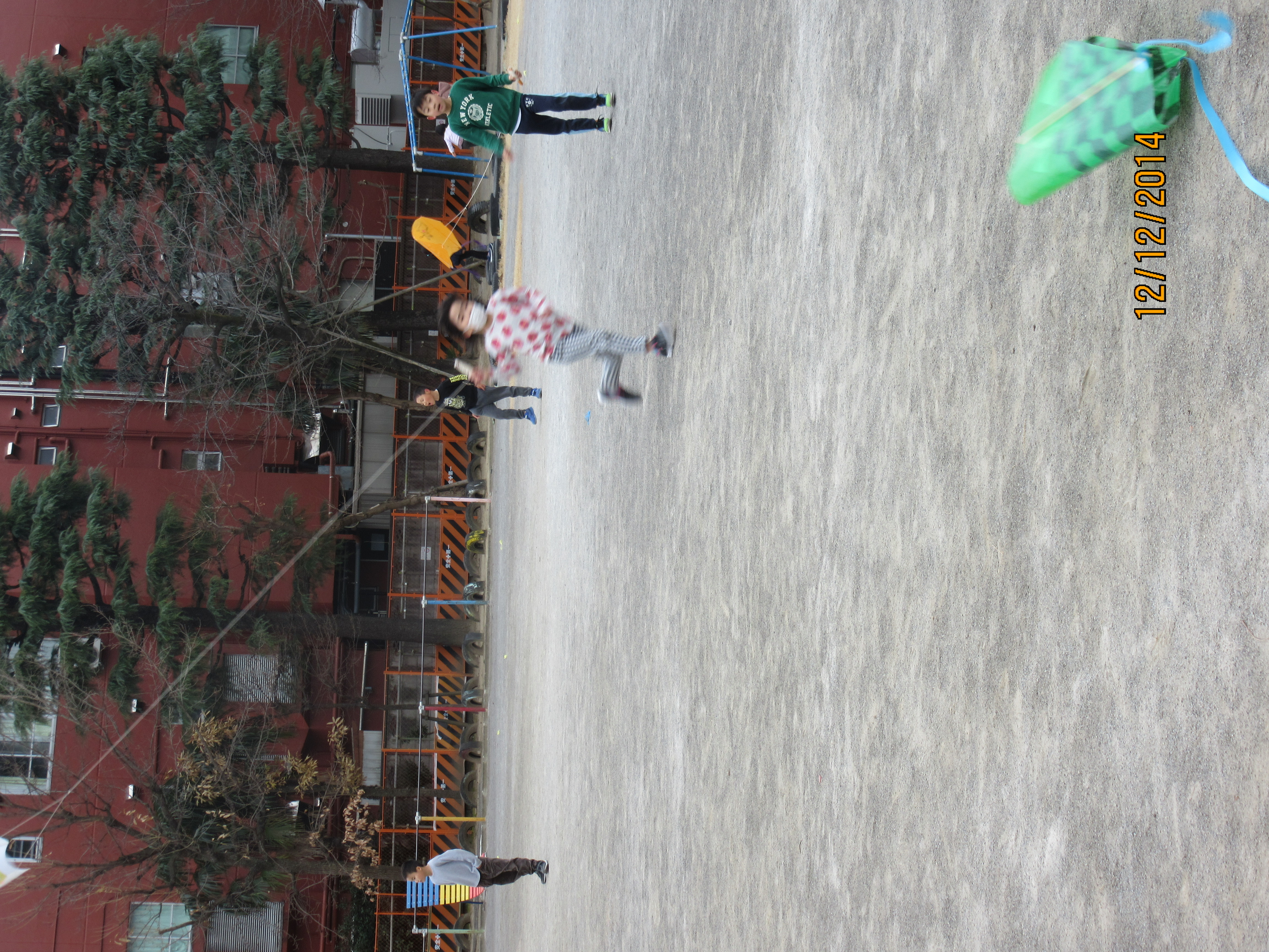 もう一つ、お正月恒例の工作を紹介します♪自分オリジナルの凧を作って上げよう!ということで、制作をしました。制作に必要なのは、大きいゴミ袋と竹ひごとたこ糸のみです♪今回はカラーのゴミ袋を用意して、自分達でそのゴミ袋に絵を書いたり、挨拶文を書いたりとオリジナルの凧があっという間に完成しました(#^.^#)制作の日は風もあり、いざ、凧揚げ開始!!!皆でわあ〜っと一斉に走り出して、いろんな色の凧が揚がっている光景はとても綺麗でした(≧▽≦)、「また明日もやりたい!」と冬休み中毎日上げている子も多くいました(#^.^#)